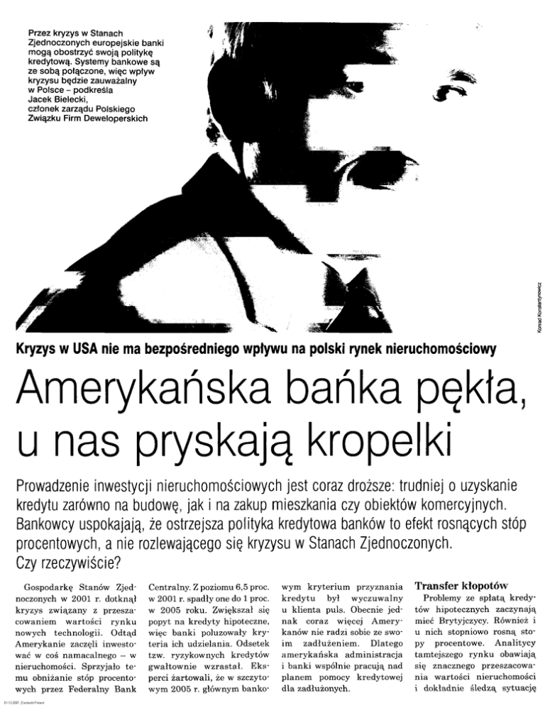 Przez kryzys w Stanach Zjednoczonych europejskie banki mogą obostrzyć swoją politykę kredytową. Systemy bankowe są ze sobą połączone, więc wpływ kryzysu będzie zauważalny w Polsce - podkreśla Jacek Bielecki, członek zarządu Polskiego Związku Firm Deweloperskich Kryzys w USA nie ma bezpośredniego wpływu na polski rynek nieruchomościowy Amerykańska bańka pękła, u nas pryskają kropelki Prowadzenie inwestycji nieruchomościowych jest coraz droższe: trudniej o uzyskanie kredytu zarówno na budowę, jak i na zakup mieszkania czy obiektów komercyjnych. Bankowcy uspokajają, że ostrzejsza polityka kredytowa banków to efekt rosnących stóp procentowych, a nie rozlewającego się kryzysu w Stanach Zjednoczonych. Czy rzeczywiście? Gospodarkę Stanów Zjednoczonych w 2001 r. dotknął kryzys związany z przeszacowaniem wartości rynku nowych technologii. Odtąd Amerykanie zaczęli inwestować w coś namacalnego - w nieruchomości. Sprzyjało temu obniżanie stóp procentowych przez Federalny Bank Centralny. Z poziomu 6,5 proc. w 2001 r. spadły one do l proc. w 2005 roku. Zwiększał się popyt na kredyty hipoteczne, więc banki poluzowały kryteria ich udzielania. Odsetek tzw. ryzykownych kredytów gwałtownie wzrastał. Eksperci żartowali, że w szczytowym 2005 r. głównym banko- wym kryterium przyznania kredytu był wyczuwalny u klienta puls. Obecnie jednak coraz więcej Amerykanów nie radzi sobie ze swoim zadłużeniem. Dlatego amerykańska administracja i banki wspólnie pracują nad planem pomocy kredytowej dla zadłużonych. Transfer kłopotów Problemy ze spłatą kredytów hipotecznych zaczynają mieć Brytyjczycy. Również i u nich stopniowo rosną stopy procentowe. Analitycy tamtejszego rynku obawiają się znacznego przeszacowania wartości nieruchomości i dokładnie śledzą sytuację w USA. Jeśli kryzys za oceanem będzie się przedłużał, może spowodować nawet kilkuletnie spowolnienie rynku. Z danych brytyjskiego Królewskiego Instytutu Rzeczoznawców Majątkowych RICS, liczba niesprzedanych nieruchomości w księgach rachunkowych agentów w Wielkiej Brytanii wzrosła od września do listopada o 8,8 proc. do poziomu 64,9 proc. Stąd obawy, że kryzys dotknie także Polskę. - Żyjemy w globalnej wiosce, więc wszystko co dzieje się w USA ma odbicie na rynku europejskim. Choćby przez to, że banki i instytucje finansowe są często ściśle połączone z amerykańskimi. Ale gospodarka USA jest bardzo silna i kryzys szybko zostanie przezwyciężony - uważa Moshe Eytam, szef projektu Wilanów One. Inwestorów uspokajają także bankowcy. Uważają, że na trudniejsze pozyskiwanie kredytów raczej nie wpływa sytuacja w USA. - Przełożenie amerykańskiego kryzysu na Europę Srodkowo-Wschodnią nie jest silne, o ile w ogóle jest. Problemy, które tam wywołały załamanie, w tej części świata nie istnieją. Mamy zbyt młode rynki i zbyt restrykcyjną politykę banków. W Polsce instytucje finansowe raczej nie zacieśnią kryteriów udzielania kredytów, bo konkurencja między nimi jest duża i podnoszone są stopy procentowe. To już i tak ogranicza dostępność kredytów — przekonuje Mateusz Szczurek, główny ekonomista ING Banku Śląskiego. Banki się boją Ponadto Komisja Nadzoru Finansowego już w lipcu 2006 roku nakazała bankom zaostrzenie polityki przyznawania kredytów we frankach szwajcarskich. Można się spodziewać kolejnych przepisów, które ograniczą udzielanie ryzykownych kredytów. Dodatkowo, żeby okiełznać inflację, Rada Polityki Pieniężnej kilkakrotnie w tym roku podwyższała stopy procentowe. Oznacza to, że rośnie podstawa oprocentowania kredytów, co dodatkowo obniża popyt. Przewiduje się kolejne podwyżki w przyszłym, a może nawet jeszcze w tym roku. W ciągu ostatniego miesiąca cena pieniądza na rynku międzybankowym, od której uzależnione są koszty kredytów, wzrosła o 0,4 proc. Między innymi dlatego chłodzi się rynek mieszkaniowy, a eksperci mówią o stabilizacji i uspokojeniu na całym rynku nieruchomościowym. — Nie widzę większego wpływu kryzysu amerykańskiego na finansowanie nieruchomości w Polsce. Zaostrzenia w udzielaniu kredytów wiążą się bardziej z działaniem banku centralnego. Nie należy też spodziewać się większych problemów z kredytowaniem nieruchomości w przyszłości — przekonuje Ryszard Petru, główny ekonomista Banku BPH. Jednak deweloperzy obawiają się zaostrzenia polityki kredytowej banków. Z jednej strony ograniczałoby to popyt, z drugiej utrudniałoby pozyskiwanie źródeł finansowania nowych inwestycji. - Działające w Polsce banki europejskie, straciły bardzo dużo pieniędzy na operacjach amerykańskich. Niedawno Europejski Bank Centralny udzielił bankom komercyjnym ponad 100 mld euro pożyczek żeby nie dopuścić do ich upadku. W Polsce po raz pierwszy od długiego czasu ilość udzielanych kredytów zrównoważyła się z ilością lokat. Być może na kredyty trzeba będzie kupować pieniądze za granicą. Trudno powiedzieć, po jakich kosztach i czy będzie to w ogóle możliwe - uważa Jacek ją wolniej, ale nadal ich ceny będą rosnąć. Podobnie będzie z innymi rodzajami nieruchomość^ one muszą się zwrócić inwestorom, mimo rosnących kosztów gruntu, materiałów budowlanych, siły roboczej i kredytów. - Obserwowana dziś stabilizacja cen mieszkań jest chwilowa. Według statystyk, w Polsce ciągle brakuje 1,5 min mieszkań. Polacy więcej zarabiają i mają większe wymagania. Gospodarka się rozwija. Duzi inwestorzy kupują drogą ziemię i muszą na niej zarobić. Nie ma więc innej możliwości, niż ciągły, dość wysoki wzrost — uważa Mo~ she Eytam, szef projektu Wilanów One. Zgodnie z zasadą, że nieruchomości zawsze są dobrą lokatą kapitału, inwestorzy nie stracą też na obiektach komercyjnych: centrach handkr wo-usługowych, magazynach, Przemyśl inwestycję Ostatnio w Polsce spada- biurowcach. Wa