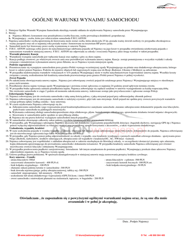 OGÓLNE WARUNKI WYNAJMU SAMOCHODU 1. Niniejsze Ogólne Warunki Wynajmu Samochodu określają warunki oddania do użytkowania Najemcy samochodu przez Wynajmującego. 2. Strony; a. Najemca (Klient); konsument oraz przedsiębiorca (osoba fizyczna, osoba prowadząca działalność gospodarczą). b. Wynajmujący ; osoba, która jest właścicielem samochodu F.H.U.ASTON 3. Najemcą samochodu i osobą uprawnioną do kierowania może zostać osoba, która ukończyła 25 lat, posiada ważny dowód osobisty (w przypadku obcokrajowcaważny paszport) oraz od co najmniej roku posiada ważne i honorowane na terytorium RP prawo jazdy. 4. Samochód może być kierowany przez osobę wymienioną w umowie Najmu. 5. F.H.U. ASTON zastrzega sobie prawo do natychmiastowego odebrania pojazdu od Najemcy na jego koszt w przypadku stwierdzenia użytkowania pojazdu z naruszeniem warunków niniejszej umowy. F.H.U. ASTON nie odpowiada za szkody i roszczenia Najemcy jakie mogą wynikać w takim przypadku. Warunki płatności, Kaucje 6. Warunkiem wynajmu samochodu jest wpłacenie kaucji oraz zapłata z góry za okres najmu. 7. Kaucja podlega zwrotowi, po właściwym zwrocie auta oraz prawidłowym wykonaniu umowy najmu. Kaucja zostaje pomniejszona o wszystkie wydatki i szkody związane z nienależytym wykonaniem umowy przez Klienta, na co Najemca wyraża niniejszym zgodę. Podróże zagraniczne 8. Przemieszczanie się wynajętym samochodem poza granice Polski wymaga wcześniejszej zgody Wynajmującego na piśmie oraz dodatkowego ubezpieczenia, którego koszt w całości ponosi Najemca. Podróże do rejonów objętych lub zagrożonych wojną oraz do Rosji ,Białorusi ,Ukrainy i Mołdawii są zabronione. 9. W przypadku niedotrzymania warunków wskazanych w w/w punkcie Wynajmujący może w trybie natychmiastowym wypowiedzieć umowę najmu. Wszelkie koszty związane z awarią, uszkodzeniem lub kradzieżą samochodu przewiezionego poza granice Polski ponosi Najemca w pełnej wysokości. Zwrot Pojazdu 10. Po zakończeniu obowiązywania umowy najmu , Najemca jest zobowiązany zwrócić pojazd do ustalonego przez Najemcę i Wynajmującego miejsca w określonym przez nich terminie. 11. Przedłużenie okresu najmu wymaga zgody Wynajmującego i powinna zostać zgłoszona co najmniej 24 godziny przed upływem terminu zwrotu. 12. W przypadku braku zgłoszenia zamiaru przedłużenia najmu, Najemca zobowiązuje się zapłacić ustalone w umowie wynagrodzenie za każdą rozpoczętą dobę. Nie zwrócenie samochodu w ciągu 2 godzin od momentu zakończenia umowy, traktowane zostaje jako przywłaszczenie i zgłoszone zostaje Policji. Zobowiązania Najemcy 13. Najemca zobowiązany jest do zwrócenia samochodu z taką samą ilością paliwa, z jaką otrzymał pojazd przy odbiorze(pełny zbiornik paliwa) 14. Najemca zobowiązany jest do utrzymania samochodu w należytej czystości, gdyż taki sam otrzymuje. Jeżeli pojazd nie spełnia przy zwrocie powyższych warunków zostaje pobrana opłata według cennika – kary umownej. 15. W czasie użytkowania Najemca zobowiązuje się do; a. Zabezpieczenia samochodu i jego wyposażenia przed kradzieżą(każdorazowe zamykanie samochodu ,staranne zabezpieczenie dokumentów pojazdu oraz kluczyków, parkowanie samochodu na parkingach strzeżonych). b. Wykonania codziennej obsługi samochodu(sprawdzenie oleju silnikowego, płynu hamulcowego, chłodzącego, sprawdzenie działania świateł mijania i drogowych). c. Stosowania w samochodzie paliw zgodnie ze specyfikacją silnika. d. Najemca nie ma prawa holować wynajętym samochodem innych pojazdów. 16. W samochodzie obowiązuje całkowity zakaz palenia wyrobów tytoniowych oraz przewożenia zwierząt. 17. W przypadku, gdy Wynajmujący udostępnia Najemcy akcesoria lub dodatkowe wyposażenie pojazdu(fotelik dziecięcy ,bagażnik dachowy, nawigację GPS itp.) Najemca ponosi wyłączną odpowiedzialność za właściwy montaż oraz prawidłowy sposób korzystania z akcesoriów , a także wyposażenia dodatkowego. Uszkodzenia, wypadek, kradzież 18. W razie uszkodzenia pojazdu w wyniku wypadku ,kradzieży, włamania lub innego czynu zabronionego, utraty kluczyków, dokumentów do pojazdu, Najemca zobowiązany jest do niezwłocznego zgłoszenia tego faktu Wynajmującemu lub Policji. 19. W przypadku, gdy Najemca ponosi pełną odpowiedzialność za szkody i wypadki, oraz kradzieże wynikające z jawnych zaniedbań celowego działania - spożywania przez Niego alkoholu, narkotyków, środków odurzających, ubezpieczenie od wypadków i kradzieży(OC, AC, NW)traci ważność. 20. Najemca zobowiązany jest współdziałać z zakładem ubezpieczeń w zakresie niezbędnym do likwidacji szkody, w szczególności dostarczyć pisemny opis zdarzenia, kopię dokumentu uprawniającego do prowadzenia samochodu i dokumentu tożsamości. W przypadku kradzieży samochodu Najemca zobowiązany jest również niezwłocznie zwrócić kluczyki i dokumenty Wynajmującemu. 21. W przypadku przekroczenia prędkości zarejestrowanej fotoradarem lub innym urządzeniem do pomiaru prędkości, Wynajmujący przekaże dane adresowe Najemcy odpowiednim organom, na co Najemca wyraża zgodę. 22. Umowa podlega prawu polskiemu. W sprawach nieuregulowanych w niniejszej umowie mają zastosowania przepisy kodeksu cywilnego. Kary umowne - Cennik: - utrata kluczyków-300zł - utrata kluczyków z pilotem -500 PLN - zarysowanie elementów karoserii - 400 PLN el. - zarysowanie lusterek bocznych -100 PLN.szt. - brak kołpaka oryginalnego - 100 PLN - brak kołpaka nieoryginalnego -50 PLN - złamanie zakazu palenia tytoniu w samochodzie -300 PLN - brak dowodu rejestracyjnego, polisy ubezpieczeniowej, tablicy rej.-300 PLN - samochód nieposprzątany lub nieumyty - 50 PLN - uszkodzenie lub utrata dodatkowego wyposażenia (GPS,Tel.kom. i inne)-500 PLN - zwrot samochodu z nietrwałymi plamami na siedzeniach, tapicerce, w bagażniku - 200 PLN Oświadczam , że zapoznałem się z powyższymi ogólnymi warunk