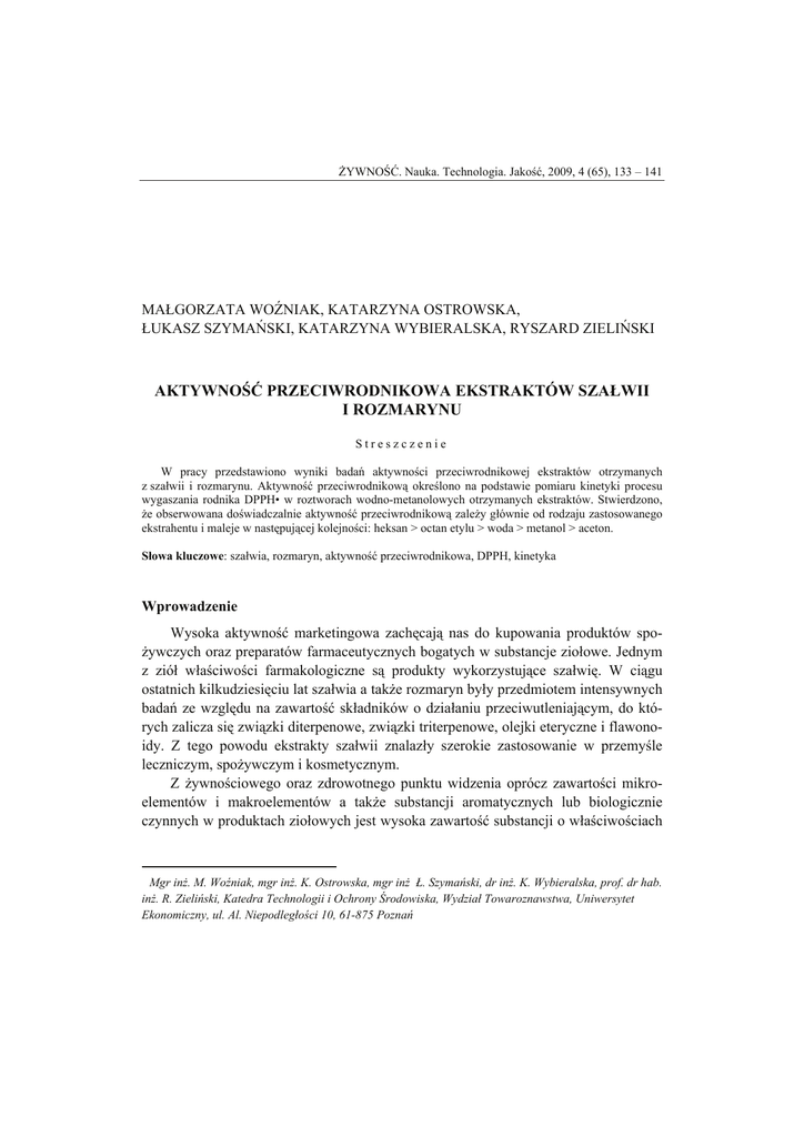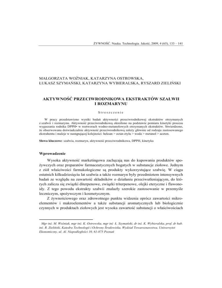 ŻYWNOŚĆ. Nauka. Technologia. Jakość, 2009, 4 (65), 133 – 141 MAŁGORZATA WOŹNIAK, KATARZYNA OSTROWSKA, ŁUKASZ SZYMAŃSKI, KATARZYNA WYBIERALSKA, RYSZARD ZIELIŃSKI1 AKTYWNOŚĆ PRZECIWRODNIKOWA EKSTRAKTÓW SZAŁWII I ROZMARYNU Streszczenie W pracy przedstawiono wyniki badań aktywności przeciwrodnikowej ekstraktów otrzymanych z szałwii i rozmarynu. Aktywność przeciwrodnikową określono na podstawie pomiaru kinetyki procesu wygaszania rodnika DPPH• w roztworach wodno-metanolowych otrzymanych ekstraktów. Stwierdzono, że obserwowana doświadczalnie aktywność przeciwrodnikową zależy głównie od rodzaju zastosowanego ekstrahentu i maleje w następującej kolejności: heksan > octan etylu > woda > metanol > aceton. Słowa kluczowe: szałwia, rozmaryn, aktywność przeciwrodnikowa, DPPH, kinetyka Wprowadzenie Wysoka aktywność marketingowa zachęcają nas do kupowania produktów spożywczych oraz preparatów farmaceutycznych bogatych w substancje ziołowe. Jednym z ziół właściwości farmakologiczne są produkty wykorzystujące szałwię. W ciągu ostatnich kilkudziesięciu lat szałwia a także rozmaryn były przedmiotem intensywnych badań ze względu na zawartość składników o działaniu przeciwutleniającym, do których zalicza się związki diterpenowe, związki triterpenowe, olejki eteryczne i flawonoidy. Z tego powodu ekstrakty szałwii znalazły szerokie zastosowanie w przemyśle leczniczym, spożywczym i kosmetycznym. Z żywnościowego oraz zdrowotnego punktu widzenia oprócz zawartości mikroelementów i makroelementów a także substancji aromatycznych lub biologicznie czynnych w produktach ziołowych jest wysoka zawartość substancji o właściwościach 1 Mgr inż. M. Woźniak, mgr inż. K. Ostrowska, mgr inż Ł. Szymański, dr inż. K. Wybieralska, prof. dr hab. inż. R. Zieliński, Katedra Technologii i Ochrony Środowiska, Wydział Towaroznawstwa, Uniwersytet Ekonomiczny, ul. Al. Niepodległości 10, 61-875 Poznań 134 Małgorzata Woźniak, Katarzyna Ostrowska, Łukasz Szymański, Katarzyna Wybieralska1 przeciwutleniających. Rozmaryn i szałwia są bardzo podobne do siebie pod względem obecnych w nich substancji przeciwutleniających. Wśród najsilniej działających aktywnych składników ekstraktu z szałwii i rozmarynu zidentyfikowano karnozol i kwas karnozynowy. Związki te aż w 90% są odpowiedzialne za właściwości przeciwutleniające preparatów ziołowych. Odgrywają ważną rolę w hamowaniu peroksydacji lipidów, oraz znacznie redukują stężenie różnych aminoglikozydów. Wykazują działania przeciwbakteryjne, przeciwalergiczne, przeciwwirusowe, przeciwbólowe. Zmniejszają ryzyko powstawania nowotworów, miażdżycy, cukrzycy oraz stymulują krążenie krwi oraz uszkodzony DNA. Wykorzystuje się je również w walce z artretyzmem i reumatyzmem i ogólnym osłabieniem organizmu [1, 2]. Do innych równie ważnych związków przeciwutleniających obecnych zarówno w rozmarynie jak i w szałwii są: karnozol, kwas karnozowy i jego pochodne, rosmanol, epirosmanol, rosmanal oraz rosmandial [3 - 8]. Ponadto, w rozmarynie znaleziono 9-etylorosmanol. Struktury najważniejszych z tych związków przedstawiono na rys. 1. Wśród najsilniej działających aktywnych składników ekstraktu z szałwii i rozmarynu zidentyfikowano karnozol i kwas karnozynowy. Związki te aż w 90% są odpowiedzialne za właściwości przeciwutleniające preparatów ziołowych. Odgrywają ważną rolę w hamowaniu peroksydacji lipidów, oraz znacznie redukują stężenie różnych aminoglikozydów. Wykazują działania przeciwbakteryjne, przeciwalergiczne, przeciwwirusowe, przeciwbólowe. Zmniejszają ryzyko powstawania nowotworów, miażdżycy, cukrzycy oraz stymulują krążenie krwi oraz uszkodzony DNA. Wykorzystuje się je również w walce z artretyzmem i reumatyzmem i ogólnym osłabieniem organizmu [1, 2]. Wśród wielu dostępnych doświadczalnych metod oceny aktywności przeciwrodnikowej tego rodzaju produktów szczególnie przydatna wydaje się metoda kinetyczna z zastosowaniem rodnika 1,1-difenylo-2-pikrylohydrazylowego (DPPH•). Metoda ta była stosowana w badaniach szybkości zmiatania wolnych rodników przez flawonoidy oraz ich kompleksy z metalami [9]. W niniejszej pracy właściwości przeciwrodnikowe ekstraktów z szałwii i rozmarynu wyznaczono na podstawie spektrofotometrycznego pomiaru szybkości zmiatania rodnika DPPH• przez porównanie natężenia absorpcji tego rodnika z natężeniem absorpcji mierzonym po określonym czasie w obecności stałej ilości kwercetyny zastosowanej jako układ porównawczy. W układzie tym wolny elektron rodnika DPPH• po sparowaniu z elektronem pochodzącym od przeciwutleniacza AH (np. kwercetyny lub składnika ekstraktu) i tworzy formę zredukowaną (rys. 2). 135 AKTYWNOŚĆ PRZECIWRODNIKOWA EKSTRAKTÓW SZAŁWII I ROZMARYNU …1 OH OCH3 OH HO O HO HOOC HO CH3OOC H H O H OH HO O O H (1) OH (2) (3) OH OH OH HO HO HO O O O H (4) O O H OH O OH H H H H OC2H5 OH O O H (5) (6) CHO CHO (7) (8) Rys. 1. Budowa głównych przeciwutleniaczy obecnych w szałwii i rozmarynie: (1) karnozol, (2) kwas 12metoksykarnozynowy, (3) karnozynian metylu, (4) izorosmanol, (5) rozmanol, (6) epirozmanol, (7) 7etoksyrozmanol, (8) rozmadial. Fig. 1. Structures of the main antioxidants present in sage and rosemary: (1) carnosol, (2) 12methoxycarnosic acid, (3) methyl carnosate, (4) isorosmanol, (5) rosmanol, (6) epirosmanol, (7) 7-ethoxyrosmanol, (8) rosmadial. 136 Małgorzata Woźniak, Katarzyna Ostrowska, Łukasz Szymański, Katarzyna Wybieralska1 N N N* O2N + AH NO2 NO2 NH O2N + A* NO2 NO2 Rys. 2. Schemat reakcji rodnika DPPH• z przeciwutleniaczem AH Fig. 2. Scheme of DPPH• radical reaction with antioxidant AH Materiał i metody badań Rozmaryn lekarski (Rosmarinus officinalis L.) i szałwia lekarska (Salvia officinalis L.) stanowiły produkty handlowe prod. firmy Kamis. Rozpuszczalniki: n-heksan, metanol i octan etylu wszystki
