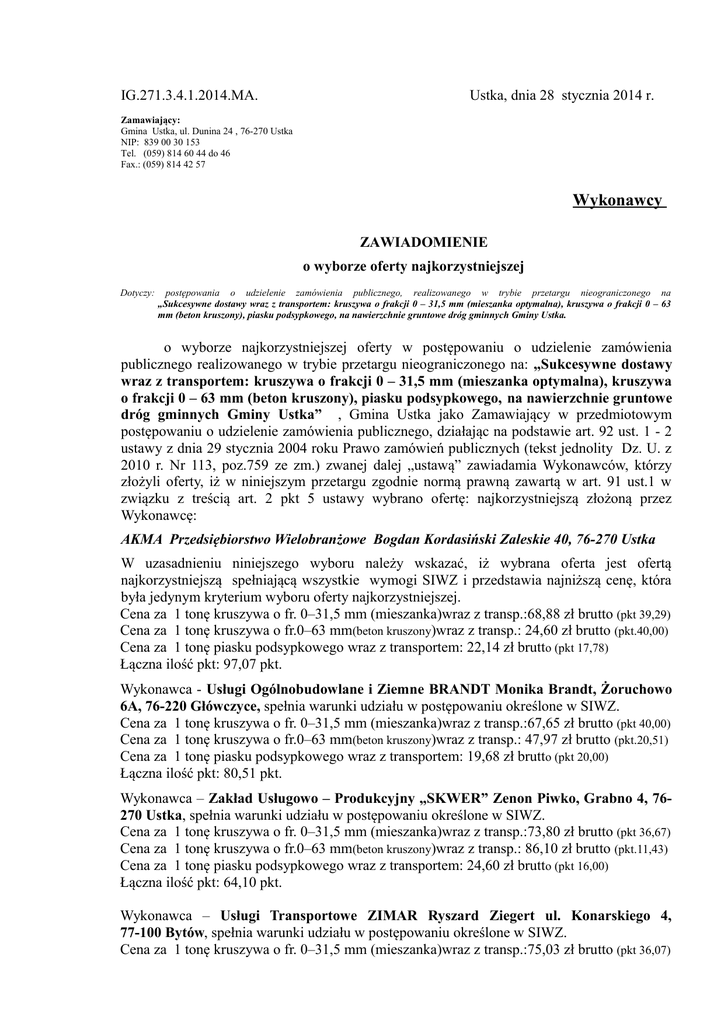 IG.271.3.4.1.2014.MA. Ustka, dnia 28 stycznia 2014 r. Zamawiający: Gmina Ustka, ul. Dunina 24 , 76-270 Ustka NIP: 839 00 30 153 Tel. (059) 814 60 44 do 46 Fax.: (059) 814 42 57 Wykonawcy ZAWIADOMIENIE o wyborze oferty najkorzystniejszej Dotyczy: postępowania o udzielenie zamówienia publicznego, realizowanego w trybie przetargu nieograniczonego na „Sukcesywne dostawy wraz z transportem: kruszywa o frakcji 0 – 31,5 mm (mieszanka optymalna), kruszywa o frakcji 0 – 63 mm (beton kruszony), piasku podsypkowego, na nawierzchnie gruntowe dróg gminnych Gminy Ustka. o wyborze najkorzystniejszej oferty w postępowaniu o udzielenie zamówienia publicznego realizowanego w trybie przetargu nieograniczonego na: „Sukcesywne dostawy wraz z transportem: kruszywa o frakcji 0 – 31,5 mm (mieszanka optymalna), kruszywa o frakcji 0 – 63 mm (beton kruszony), piasku podsypkowego, na nawierzchnie gruntowe dróg gminnych Gminy Ustka” , Gmina Ustka jako Zamawiający w przedmiotowym postępowaniu o udzielenie zamówienia publicznego, działając na podstawie art. 92 ust. 1 - 2 ustawy z dnia 29 stycznia 2004 roku Prawo zamówień publicznych (tekst jednolity Dz. U. z 2010 r. Nr 113, poz.759 ze zm.) zwanej dalej „ustawą” zawiadamia Wykonawców, którzy złożyli oferty, iż w niniejszym przetargu zgodnie normą prawną zawartą w art. 91 ust.1 w związku z treścią art. 2 pkt 5 ustawy wybrano ofertę: najkorzystniejszą złożoną przez Wykonawcę: AKMA Przedsiębiorstwo Wielobranżowe Bogdan Kordasiński Zaleskie 40, 76-270 Ustka W uzasadnieniu niniejszego wyboru należy wskazać, iż wybrana oferta jest ofertą najkorzystniejszą spełniającą wszystkie wymogi SIWZ i przedstawia najniższą cenę, która była jedynym kryterium wyboru oferty najkorzystniejszej. Cena za 1 tonę kruszywa o fr. 0–31,5 mm (mieszanka)wraz z transp.:68,88 zł brutto (pkt 39,29) Cena za 1 tonę kruszywa o fr.0–63 mm(beton kruszony)wraz z transp.: 24,60 zł brutto (pkt.40,00) Cena za 1 tonę piasku podsypkowego wraz z transportem: 22,14 zł brutto (pkt 17,78) Łączna ilość pkt: 97,07 pkt. Wykonawca - Usługi Ogólnobudowlane i Ziemne BRANDT Monika Brandt, Żoruchowo 6A, 76-220 Główczyce, spełnia warunki udziału w postępowaniu określone w SIWZ. Cena za 1 tonę kruszywa o fr. 0–31,5 mm (mieszanka)wraz z transp.:67,65 zł brutto (pkt 40,00) Cena za 1 tonę kruszywa o fr.0–63 mm(beton kruszony)wraz z transp.: 47,97 zł brutto (pkt.20,51) Cena za 1 tonę piasku podsypkowego wraz z transportem: 19,68 zł brutto (pkt 20,00) Łączna ilość pkt: 80,51 pkt. Wykonawca – Zakład Usługowo – Produkcyjny „SKWER” Zenon Piwko, Grabno 4, 76270 Ustka, spełnia warunki udziału w postępowaniu określone w SIWZ. Cena za 1 tonę kruszywa o fr. 0–31,5 mm (mieszanka)wraz z transp.:73,80 zł brutto (pkt 36,67) Cena za 1 tonę kruszywa o fr.0–63 mm(beton kruszony)wraz z transp.: 86,10 zł brutto (pkt.11,43) Cena za 1 tonę piasku podsypkowego wraz z transportem: 24,60 zł brutto (pkt 16,00) Łączna ilość pkt: 64,10 pkt. Wykonawca – Usługi Transportowe ZIMAR Ryszard Ziegert ul. Konarskiego 4, 77-100 Bytów, spełnia warunki udziału w postępowaniu określone w SIWZ. Cena za 1 tonę kruszywa o fr. 0–31,5 mm (mieszanka)wraz z transp.:75,03 zł brutto (pkt 36,07) Cena za 1 tonę kruszywa o fr.0–63 mm(beton kruszony)wraz z transp.: 57,81 zł brutto (pkt.17,02) Cena za 1 tonę piasku podsypkowego wraz z transportem: 27,06 zł brutto (pkt 14,55) Łączna ilość pkt: 67,64 pkt. Wykonawca – NORDBETON Sp. z o. o. ul. Kasztanowa 41, 76-251 Kobylnica, spełnia warunki udziału w postępowaniu określone w SIWZ. Cena za 1 tonę kruszywa o fr. 0–31,5 mm (mieszanka)wraz z transp.:89,79 zł brutto (pkt 30,14) Cena za 1 tonę kruszywa o fr.0–63 mm(beton kruszony)wraz z transp.: 67,97 zł brutto (pkt.14,48) Cena za 1 tonę piasku podsypkowego wraz z transportem: 34,76 zł brutto (pkt 11,32) Łączna ilość pkt: 55,94 pkt. Jednocześnie Zamawiający zawiadamia, iż w niniejszym przetargu w terminie do składania ofert złożono 6 ofert. Przewidywany termin zawarcia umowy: 5 - 11 luty 2014 r. W toku badania i oceny wykluczono i odrzucono: 1 Wykonawca - Przedsiębiorstwo Gastronomiczno - Handlowe „LECH-POL” Teresa Dydyna ul. O. D. Tynieckiego 43, 76-150 Darłowo - nie spełnia warunków udziału w postępowaniu określonych w Specyfikacji istotnych warunków zamówienia. /-/ Wójt Gminy Ustka Anna Sobczuk – Jodłowska