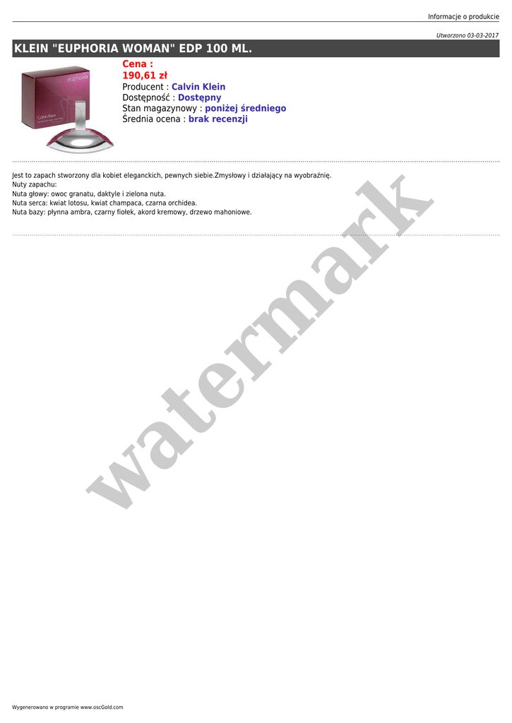 Informacje o produkcie Utworzono 03-03-2017 KLEIN "EUPHORIA WOMAN" EDP 100 ML. Cena : 190,61 zł Producent : Calvin Klein Dostępność : Dostępny Stan magazynowy : poniżej średniego Średnia ocena : brak recenzji w at er m ar k Jest to zapach stworzony dla kobiet eleganckich, pewnych siebie.Zmysłowy i działający na wyobraźnię. Nuty zapachu: Nuta głowy: owoc granatu, daktyle i zielona nuta. Nuta serca: kwiat lotosu, kwiat champaca, czarna orchidea. Nuta bazy: płynna ambra, czarny fiołek, akord kremowy, drzewo mahoniowe. Wygenerowano w programie www.oscGold.com