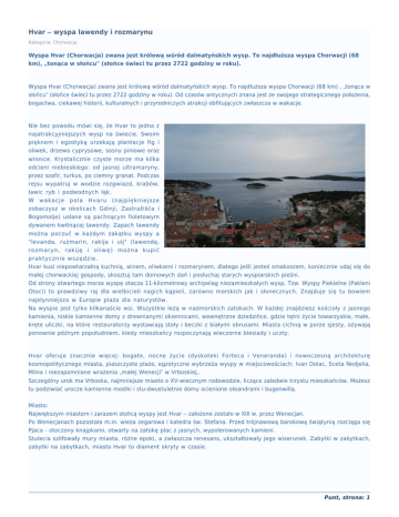 Hvar – wyspa lawendy i rozmarynu Kategoria: Chorwacja Wyspa Hvar (Chorwacja) zwana jest królową wśród dalmatyńskich wysp. To najdłuższa wyspa Chorwacji (68 km), „tonąca w słońcu” (słońce świeci tu przez 2722 godziny w roku). Wyspa Hvar (Chorwacja) zwana jest królową wśród dalmatyńskich wysp. To najdłuższa wyspa Chorwacji (68 km) , „tonąca w słońcu” (słońce świeci tu przez 2722 godziny w roku). Od czasów antycznych znana jest ze swojego strategicznego położenia, bogactwa, ciekawej historii, kulturalnych i przyrodniczych atrakcji obfitujących zwłaszcza w wakacje. Nie bez powodu mówi się, że Hvar to jedna z najatrakcyjniejszych wysp na świecie. Swoim pięknem i egzotyką urzekają plantacje fig i oliwek, drzewa cyprysowe, sosny piniowe oraz winnice. Krystalicznie czyste morze ma kilka odcieni niebieskiego: od jasnej ultramaryny, przez szafir, turkus, po ciemny granat. Podczas rejsu wypatruj w wodzie rozgwiazd, krabów, ławic ryb i podwodnych łąk. W wakacje pola Hvaru (najpiękniejsze zobaczysz w okolicach Gdinji, Zastražišća i Bogomolje) usłane są pachnącym fioletowym dywanem kwitnącej lawendy. Zapach lawendy można poczuć w każdym zakątku wyspy a "levanda, rużmarin, rakija i ulj" (lawendę, rozmaryn, rakiję i oliwę) można kupić praktycznie wszędzie. Hvar kusi niepowtarzalną kuchnią, winem, oliwkami i rozmarynem, dlatego jeśli jesteś smakoszem, koniecznie udaj się do małej chorwackiej gospody, skosztuj tam domowych dań i posłuchaj starych wyspiarskich pieśni. Od strony otwartego morza wyspę otacza 11-kilometrowy archipelag niezamieszkałych wysp. Tzw. Wyspy Piekielne (Pakleni Otoci) to prawdziwy raj dla wielbicieli nagich kąpieli, zarówno morskich jak i słonecznych. Znajduje się tu bowiem najsłynniejsza w Europie plaża dla naturystów. Na wyspie jest tylko kilkanaście wsi. Wszystkie leżą w nadmorskich zatokach. W każdej znajdziesz kościoły z jasnego kamienia, niskie kamienne domy z drewnianymi okiennicami, wewnętrzne dziedzińce, gdzie tętni życie towarzyskie, małe, kręte uliczki, na które restauratorzy wystawiają stoły i beczki z białymi obrusami. Miasta cichną w porze sjesty, ożywają ponownie późnym popołudniem, kiedy mieszkańcy rozpoczynają wieczorne biesiady i uczty. Hvar oferuje znacznie więcej: bogate, nocne życie (dyskoteki Forteca i Veneranda) i nowoczesną architekturę kosmopolitycznego miasta, piaszczyste plaże, egzotyczne wybrzeża wyspy w miejscowościach: Ivan Dolac, Sceta Nedjelia, Milna i niezapomniane wrażenia „małej Wenecji” w Vrboskiej,. Szczególny urok ma Vrboska, najmniejsze miasto o XV-wiecznym rodowodzie, liczące zaledwie trzystu mieszkańców. Możesz tu podziwiać urocze kamienne mostki i stu-dwustuletnie domy ocienione oleandrami i bugenwillą. Miasto: Największym miastem i zarazem stolicą wyspy jest Hvar – założone zostało w XIII w. przez Wenecjan. Po Wenecjanach pozostała m.in. wieża zegarowa i katedra św. Stefana. Przed trójnawową barokową świątynią rozciąga się Pjaca - otoczony knajpkami, otwarty na zatokę plac z jasnych, wypolerowanych kamieni. Stulecia szlifowały mury miasta, różne epoki, a zwłaszcza renesans, ukształtowały jego wizerunek. Zabytki w zabytkach, zabytki na zabytkach, miasto Hvar to diament skryty w czasie. Punt, strona: 1 Co warto zobaczyć? Koniecznie górującą nad miastem twierdzę Tvrdava , hvarską katedrę św. Szczepana, dumę miasta hvarski monumentalny Arsenał połączony z teatrem, założonym w 1612 roku (to najstarszy miejski teatr w Europie). Warto przejść się na południowo-wschodni kraniec miasta, do klasztoru franciszkańskiego z pięknym XV-wiecznym tympanonem, z wizerunkiem Marii i Dzieciątka dłuta Nicolasa le Florentin, ucznia Donatella. Hvar przez stulecia wznosili sławni miejscowi i zagraniczni architekci, zdobili znani artyści, ale miasto Hvar najlepiej mówi samo za siebie. Przyjedź i stań się częścią legendy. Hvar Punt, strona: 2