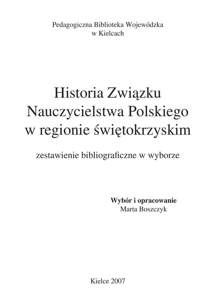 Pedagogiczna Biblioteka Wojewódzka w Kielcach Historia Związku Nauczycielstwa Polskiego w regionie świętokrzyskim zestawienie bibliograficzne w wyborze Wybór i opracowanie Marta Boszczyk Kielce 2007 2 Wydawnictwa zwarte 1. Biogramy i wspomnienia. Z. 1 / red. Władysław Łebek. – Kielce : Okręgowa Sekcja Emerytów i Rencistów ZNP ; Klub Nauczycieli TON ; Zarząd Oddziału ZNP, 1992 Sygnatura 8619 B/P Czytelnia 2. Biogramy i wspomnienia. Z. 2 / red. Władysław Łebek. – Kielce : Okręgowa Sekcja Emerytów i Rencistów ZNP ; Klub Nauczycieli TON ; Zarząd Oddziału ZNP, 1992 Sygnatura 8620 B/P Czytelnia 3. Biogramy i wspomnienia. Z. 3 / red. Władysław Łebek. – Kielce : Okręgowa Sekcja Emerytów i Rencistów ZNP ; Klub Nauczycieli TON ; Zarząd Oddziału ZNP, 1993 Sygnatura 8621 B/P Czytelnia 4. Biogramy i wspomnienia. Z. 4 / red. Władysław Łebek. – Kielce : Okręgowa Sekcja Emerytów i Rencistów ZNP ; Klub Nauczycieli TON ; Zarząd Oddziału ZNP, 1993 Sygnatura 8622 B/P Czytelnia 5. Biogramy i wspomnienia. Z. 5 / oprac. Marian Banaszek. – Kielce : Zarząd Okręgu ZNP, 1993 Sygnatura 8623 B/P Czytelnia 6. Biogramy i wspomnienia. Z. 6 / red. Władysław Łebek. – Kielce : Zarząd Okręgu ZNP ; Okręgowa Sekcja Emerytów i Rencistów ZNP ; Klub Nauczycieli TON, 1994 Sygnatura 8624 B/P Czytelnia 7. Biogramy i wspomnienia. Z. 7 / red. Władysław Łebek. – Kielce : Zarząd Okręgu ZNP ; Okręgowa Sekcja Emerytów i Rencistów ZNP ; Klub Nauczycieli TON, 1995 Sygnatura 8625 B/P Czytelnia 3 8. Biogramy i wspomnienia. Z. 8 / red. Władysław Łebek. – Kielce : Zarząd Okręgu ZNP ; Okręgowa Sekcja Emerytów i Rencistów ZNP ; Klub Nauczycieli TON, 1996 Sygnatura 8747 B/P Czytelnia 9. Biogramy i wspomnienia. Z. 9 / red. Władysław Łebek. – Kielce : Zarząd Okręgu ZNP ; Okręgowa Sekcja Emerytów i Rencistów ZNP ; Klub Nauczycieli TON, 1996 Sygnatura 8748 B/P Czytelnia 10. Działalność ZNP na ziemi włoszczowskiej w latach 1915-1995 / red. Tadeusz Stolarski, Wiktor Krotla, Mieczysław Guździoł [et al]. – Włoszczowa : Zarząd Oddziału ZNP, [1997] Sygnatura 221559 Czytelnia Sygnatura 223864 Wypożyczalnia 11. Dzieje szkolnictwa i ruchu nauczycielskiego w Ostrowcu Świętokrzyskim i w okolicach w latach 1820-2000 / pod red. Mariana Banaszka ; Związek Nauczycielstwa Polskiego. Oddział w Ostrowcu Świętokrzyskim. Komisja Historyczna. – Ostrowiec Świętokrzyski : ZNP, 2000 Sygnatura 233319 Czytelnia Sygnatura 233320 Wypożyczalnia 12. Dzieje zawodowego ruchu nauczycielskiego w województwie kieleckim w okresie międzywojennym : materiały z sesji naukowej 27-28 czerwca 1988 r. / red. Józef Grzywna. – Kielce : Wyższa Szkoła Pedagogiczna, 1989 Sygnatura 205149 Czytelnia Sygnatura 205150, 217973 Wypożyczalnia 13. Dzwonek, Bronisław : Dzieje i działalność Zarządu Okręgu Związku Nauczycielstwa Polskiego w województwie kieleckim w latach 1945-1973/ Bronisław Dzwonek. – Kielce Wyższa Szkoła Pedagogiczna ; Instytut Pedagogiki, 1978 [Praca magisterska napisana pod kierunkiem doc. J. Krasuskiego] 4 14. Grzywna, Józef : Działalność oświatowo-kulturalna ZNP w województwie kieleckim w latach 1926-1934 / Józef Grzywna // W : Rocznik Świętokrzyski. T. 8, 1980. Prace Humanistyczne. – Warszawa ; Kraków : Państwowe Wydawnictwo Naukowe, 1981. – S. 131-154 Sygnatura 155649 Czytelnia Sygnatura 155648 Wypożyczalnia 15. Grzywna, Józef : Problem klerykalizacji szkolnictwa powszechnego na Kielecczyźnie 1919-1939 w opinii publicznej / Józef Grzywna. – Kielce : Wyższa Szkoła Pedagogiczna ; Kuratorium Okręgu Szkolnego w Kielcach, 1974. – S. 82-95 : Próba opanowania Związku Nauczycielstwa Polskiego przez kler ; S. 96-155 : Problem klerykalizacji szkolnictwa w okresie realizacji reformy jędrzejewiczowskiej (1933-1939) Sygnatura 108545 Czytelnia Sygnatura 108546, 110213-110217 Wypożyczalnia 16. Grzywna, Józef : Szkolnictwo powszechne i oświata pozaszkolna w województwie kieleckim w latach 1918-1939 / Józef Grzywna. – Kielce : Wyższa Szkoła Pedagogiczna, 1984. – S. 56-61 : Rola ZPNSP w rozwoju oświaty pozaszkolnej ; S. 73-100 : Upowszechnianie przez ZPNSP /ZNP/ nowych systemów dydaktyczno-pedagogicznych ; S. 138-150 : Walka ZNP ze wzrastającymi wpływami kleru w szkolnictwie Sygnatura 171992 Czytelnia Sygnatura 171993-171996 Wypożyczalnia 17. Grzywna, Józef : Walka postępowego nauczycielstwa związkowego o jednolitość szkolnictwa na Kielecczyźnie w latach 1921-1932 / Józef Grzywna // W : Kieleckie Studia Historyczne / red. Zenon Guldon. – Kielce : Wyższa Szkoła Pedagogiczna, 1976. – S.: 125-143 Sygnatura 124689 Czytelnia Sygnatura 124690-124693, 128141 Wypożyczalnia 5 18. Grzywna, Józef : Walka Związku Nauczycielstwa Polskiego w województwie kieleckim o postępowy program oświaty w latach 1919-1939 / Józef Grzywna. – Kielce : Wyższa Szkoła Pedagogiczna ; Instytut Historii,1980 [Maszynopis powielony] 19. Grzywna, Józef : Związek Nauczycielstwa Polskiego na Kielecczyźnie 1905-1939 / Józef Grzywna. – Kielce : Prywatne Liceum Zarządzania i Administracji, 1993 Sygnatura 215729 Czytelnia Sygnatura 215733 Wypożyczalnia 20. Grzywna, Józef : Związek Nauczycielstwa Polskiego w województwie kieleckim wobec powszechnego nauczania w latach 1935-1939 / Józef Grzywna // W : Kieleckie Studia Historyczne/ red. Zenon Guldon. – Kielce : Wyższa Szkoła Pedagogiczna, 1977. – S. 135-161 Sygnatura 133869 Czytelnia Sygnatura 132187-132188, 133871 Wypożyczalnia 21. Marczuk, Mieczysław : Walka Związku Nauczycielstwa Polskiego o postępowy program oświatowy 1919-1939 / Mieczysław Marczuk. – Warszawa : „Nasza Księgarnia”, 1970 Sygnatura 83061-83062, 83248-83255 Wypożyczalnia 22. Mikoda, Kazimierz : Działalność Związku Nauczycielstwa Polskiego w województwie kieleckim w latach 1935-1939 / Kazimierz Mikoda. – Kielce : Wyższa Szkoła Pedagogiczna ; Instytut Historii, 1977 [Praca magisterska nap