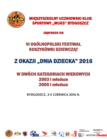 MIĘDZYSZKOLNY UCZNIOWSKI KLUB SPORTOWY „MUKS” BYDGOSZCZ zaprasza na VI OGÓLNOPOLSKI FESTIWAL KOSZYKÓWKI DZIEWCZĄT Z OKAZJI „DNIA DZIECKA” 2016 W DWÓCH KATEGORIACH WIEKOWYCH 2003 i młodsze 2005 i młodsze BYDGOSZCZ, 3-5 CZERWCA 2016 R. 1. CEL TURNIEJU Popularyzacja koszykówki wśród dzieci i młodzieży. 2. ORGANIZATOR Międzyszkolny Uczniowski Klub Sportowy „MUKS” Bydgoszcz. 3. PARTNERZY Urząd Miasta Bydgoszczy, Urząd Marszałkowski Województwa Kujawsko-Pomorskiego, Zespół Szkół nr 26 w Bydgoszczy, Zespół Szkół nr 7 w Bydgoszczy, Szkoła Podstawowa nr 63 w Bydgoszczy, Wyższa Szkoła Gospodarki w Bydgoszczy, Kujawko-Pomorski Związek Koszykówki. 4. TERMIN TURNIEJU 3-5 czerwca 2016 roku (przyjazd zespołów w dniu rozpoczęcia turnieju, pierwsze mecze zaczynamy w okolicach godziny 12:00 - 13:00). 5. MIEJSCE TURNIEJU Hale sportowe na terenie miasta Bydgoszczy. 6. UCZESTNICY 10 zespołów z rocznika 2003 i młodsze oraz 10 zespołów z rocznika 2005 i młodsze. 7. NOCLEG I WYZYWIENIE Bursa nr 1 im. Małgorzaty Szułczyńskiej w Bydgoszczy, ul. Bartosza Głowackiego 37, 85-717 Bydgoszcz (2 noclegi i wyżywienie od obiadu 03.06.2016 r. do obiadu 05.06.2016 r., zakwaterowanie 03.06.2016 r. po godzinie 12:00) – ŁÓŻKA Z POŚCIELĄ. lub Sale lekcyjne w szkole (2 noclegi i wyżywienie od obiadu 03.06.2016 r. do obiadu 05.06.2016 r., zakwaterowanie 03.06.2016 r. po godzinie 12:00) – WŁASNE ŚPIWORY. 8. OPŁATY - wpisowe: 250 zł płatne po zakwalifikowaniu drużyny do turnieju na konto klubu najpóźniej do dnia 20.05.2016 r.: Międzyszkolny Uczniowski Klub Sportowy „MUKS” Bydgoszcz Bank PKO, rachunek nr: 03 1240 1183 1111 0010 5497 6381, - koszty udziału: 175 zł od osoby (również za trenerów i kierowców) płatne przelewem lub gotówką – Bursa, 140 zł od osoby (również za trenerów i kierowców) płatne przelewem lub gotówką – Szkoła, 9. NAGRODY Puchary, medale, nagrody indywidualne (MVP, pierwsza piątka turnieju, król strzelców, najlepsza zawodniczka w zespole, wyróżniająca zawodniczka w zespole), koszulki okolicznościowe dla wszystkich uczestników. 10. PRZEPISY GRY Obowiązują przepisy FIBA z następującymi zmianami: - mecze rozgrywane będą w formie 7 kwart (6 x 5’ i 1 x 10’ – ostatnia kwarta czas zatrzymywany na rzuty wolne oraz ostatnie 2 minuty jeśli różnica w wyniku jest mniejsza lub równa 10 punktów), - mecze rozgrywane będą na kosze zawieszone na wysokości 2,60 m piłkami nr 5, linia rzutów wolnych w odległości 4 metrów od kosza, - zaliczane są rzuty za 3 punkty, za faul przy celnym rzucie z gry przyznawany jest rzut wolny, - w przypadku remisu zarządza się 3-minutową dogrywkę, - ostateczną decyzję w sprawie interpretacji przepisów ma organizator. 11. ZGŁOSZENIA Zgłoszenie udziału w turnieju wraz należy przesyłać do 30.04.2016 r. na adres e-mail: [email protected]. O przyjęciu do turnieju decyduje organizator. Dodatkowych informacji udzielają: Rafał Bejtka, tel. 783-699-881, Krzysztof Janik, tel. 508-108-045. www.muks-bydgoszcz.pl Tradycyjnie we wrześniu odbędzie się VIII Ogólnopolski Turniej Koszykówki Dziewcząt o Puchar Prezydenta Miasta Bydgoszczy. Impreza planowana jest w terminach: 02-04.09.2016 r. – Juniorki (1999), Kadetki (2001), Młodziczki (2003), 16-18.09.2016 r. – Młodziczki młodsze (2004) i Żaczki (2005).