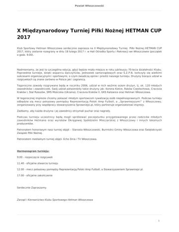 Powiat Włoszczowski X Międzynarodowy Turniej Piłki Nożnej HETMAN CUP 2017 Klub Sportowy Hetman Włoszczowa serdecznie zaprasza na X Międzynarodowy Turniej Piłki Nożnej HETMAN CUP 2017, który zostanie rozegrany w dniu 18 lutego 2017 r. w Hali Ośrodka Sportu i Rekreacji we Włoszczowie (początek o godz. 9.00). Nadmieniamy, że jest to szczególna edycja, gdyż będzie miała miejsce w roku jubileuszu 70-lecia działalności Klubu. Poprzednie turnieje, dzięki wsparciu darczyńców, jednostek samorządowych oraz Ś.Z.P.N. kończyły się wielkimi sukcesami organizacyjnymi i sportowymi, o czym świadczą opinie i prestiż naszego turnieju. Drużyny biorące udział w rozgrywkach są znane zarówno w Polsce jak i zagranicą. Tegoroczne zawody rozgrywane będą w roczniku 2006, udział w nich weźmie osiem drużyn, tj. ok. 120 młodych zawodników i zawodniczek. Swój udział potwierdziły takie drużyny jak: Korona Kielce, Raków Częstochowa, Cracovia Kraków I, Stal Rzeszów, SMS Mościska (Ukraina), Cracovia Kraków II, GKS Katowice oraz Hetman Włoszczowa. W tegorocznej imprezie chcemy pokazać młodym sportowcom rywalizację osób niepełnosprawnych. Podczas turnieju odbędzie się mecz pokazowy pomiędzy Reprezentacją Polski Amp Futboll, a ,,Sprawniejszymi’’ z Włoszczowy, zorganizowany przy współpracy stowarzyszenia Sprawniejsi.pl, który partneruje organizatorowi imprezy. Zadbamy, aby każda drużyna i jej zawodnicy otrzymali puchar oraz nagrody. Podczas turnieju uczestnicy będą mogli spróbować poczęstunku przygotowanego przez rodziców młodych zawodników Hetmana oraz wyrobów Okręgowej Spółdzielni Mleczarskiej z Włoszczowy i innych lokalnych producentów. Patronatem honorowym nasz turniej objęli – Starosta Włoszczowski, Burmistrz Gminy Włoszczowa oraz Świętokrzyski Związek Piłki Nożnej. Patronatem medialnym turniej objęli: Echo Dnia i TV Włoszczowa. Harmonogram turnieju: 9.00 - rozpoczęcie rozgrywek 11.40 - oficjalne otwarcie turnieju 12.00 - mecz pokazowy pomiędzy Reprezentacją Polski Amp Futboll, a Stowarzyszeniem Sprawniejsi pl. 17.00 - oficjalne zakończenie Serdecznie Zapraszamy. Zarząd i Kierownictwo Klubu Sportowego Hetman Włoszczowa 1