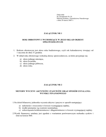 Załączniki do zarządzenia Nr 10 Ministra Kultury i Dziedzictwa Narodowego z dnia 29 marca 2007 r. ZAŁĄCZNIK NR 1 ROK OBROTOWY I WCHODZĄCE W JEGO SKŁAD OKRESY SPRAWOZDAWCZE 1. Rokiem obrotowym jest okres roku budżetowego, czyli rok kalendarzowy trwający od 1 stycznia do dnia 31 grudnia. 2. W skład roku obrotowego wchodzą okresy sprawozdawcze, za które przyjmuje się: a) b) c) d) okres jednego miesiąca, okres kwartału, okres jednego półrocza, okres roku. ZAŁĄCZNIK NR 2 METODY WYCENY AKTYWÓW I PASYWÓW ORAZ SPOSÓB USTALANIA WYNIKU FINANSOWEGO 1.Na dzień bilansowy jednostka wycenia aktywa i pasywa w sposób następujący: a) należności i roszczenia w kwocie wymagającej zapłaty, b) środki pieniężne wg wartości nominalnej, c) zobowiązania krótkoterminowe i długoterminowe w kwocie wymagającej zapłaty. 2.Wynik finansowy ustalany jest zgodnie z wariantem porównawczym rachunku zysków i strat na koncie 860. ZAŁĄCZNIK NR 3 SPOSÓB PROWADZENIA KSIĄG RACHUNKOWYCH 1. Miejsce prowadzenia ksiąg rachunkowych Księgi rachunkowe dysponenta głównego prowadzi się w Departamencie Ekonomicznym w siedzibie Ministerstwa Kultury i Dziedzictwa Narodowego przy ul. Krakowskie Przedmieście 15/17 w Warszawie. 2. Wykaz ksiąg rachunkowych 2.1. Księgi rachunkowe obejmują zbiory zapisów księgowych, obrotów i sald, które tworzą: a) Dziennik - zawiera chronologiczne ujęcie zdarzeń, jakie nastąpiły w danym okresie sprawozdawczym. Obroty dziennika w zakresie kont bilansowych i pozabilansowych są zgodne z obrotami zestawienia obrotów i sald księgi głównej. Zapisy w dzienniku są kolejno numerowane, a sumy zapisów (obroty) liczone w sposób ciągły. Numeracja zapisów w dzienniku umożliwia ich jednoznaczne powiązanie z numerem dekretu. b) Księga główna (konta syntetyczne) - zawiera zapisy o zdarzeniach w ujęciu systematycznym. Na kontach księgi głównej obowiązuje ujęcie zarejestrowanych uprzednio lub równocześnie w dzienniku zdarzeń, zgodnie z zasadą podwójnego zapisu. Zapisów w księdze głównej dokonuje się automatycznie przy wprowadzeniu zapisów na kontach analitycznych w kolejności chronologicznej (zgodnie z zasadą memoriałową). Dochody i wydatki, ujmowane są w terminie ich zapłaty (zgodnie z zasadą kasową). Księga główna prowadzona jest w sposób umożliwiający powiązanie dokonanych w niej zapisów z zapisami w dzienniku. c) Księgi pomocnicze (konta analityczne) - stanowią zapisy będące uszczegółowieniem i uzupełnieniem zapisów kont księgi głównej. Prowadzi się je w ujęciu systematycznym jako wyodrębniony system ksiąg, kartotek (zbiorów kont), komputerowych zbiorów danych zgodny z saldami i zapisami na kontach księgi głównej w okresach na koniec każdego miesiąca. Konta ksiąg pomocniczych tworzy się w miarę istniejących potrzeb. Bieżąca aktualizacja kont analitycznych i syntetycznych nie wymaga odrębnego zarządzenia. d) Zestawienie obrotów i sald - sporządza się automatycznie w programach SYMFONIA - Finanse i Księgowość oraz ENOVA na dowolny dzień okresu obrotowego. Zestawienie obrotów i sald na koniec każdego miesiąca jest zgodne z zapisami na kontach księgi głównej. Obowiązkowo drukuje się zestawienie obrotów i sald na koniec roku. e) Wykaz aktywów i pasywów - stanowi zestawienie obrotów i sald kont księgi głównej oraz zestawienie obrotów i sald kont ksiąg pomocniczych. Zestawienie sporządza się na koniec roku obrotowego. 2.2. Księgi rachunkowe drukuje się nie później niż na koniec roku obrotowego. Wydruki komputerowe ksiąg rachunkowych składają się z automatycznie ponumerowanych stron i są sumowane w sposób ciągły w roku obrachunkowym na kolejnych stronach. Księgi rachunkowe w postaci wydruków zawierają datę sporządzenia wydruku. 3.Technika prowadzenia ksiąg rachunkowych 3.1. Księgi rachunkowe prowadzone są przy pomocy systemów informatycznych: a) SYMFONIA Finanse i Księgowość wersja 5.20 - program firmy MATRIX, b) ENOVA - program finansowo- księgowy firmy SONETA Spółki z o.o., który od dnia 1 sierpnia 2006 roku służy do prowadzenia analityki dotacji celowych. Zapisy na kontach analitycznych uzgadnia się na koniec każdego miesiąca z zapisami na kontach syntetycznych prowadzonych w programie SYMFONIA. 3.2. System komputerowy obejmuje następujące moduły: a) Departament Ekonomiczny - księga główna F-K, b) poszczególne analityki tworzone na potrzeby wewnętrzne. 3.3. Księgi rachunkowe z uwzględnieniem techniki ich prowadzenia powinny być trwale oznaczone nazwą jednostki, której dotyczą oraz nazwą danego rodzaju księgi rachunkowej, wyraźnie oznaczone, co do roku obrotowego, którego dotyczą, okresu sprawozdawczego i daty sporządzenia. Księgi rachunkowe powinny być przechowywane starannie według kolejności chronologicznej. 3.4. Systemy informatyczne wykorzystywane do prowadzenia ksiąg rachunkowych zapewniają automatyczną kontrolę ciągłości zapisów, przenoszenia obrotów i sald pomiędzy okresami sprawozdawczymi. 3.5. Podstawą zapisów w księgach rachunkowych są dowody księgowe stwierdzające dokonanie operacji gospodarczej. 3.6. Do ksiąg rachunkowych okresu sprawozdawczego należy wprowadzić, w postaci zapisu, każde zdarzenie, które nastąpiło w danym okresie sprawozdawczym. Zapis księgowy dokonany komputerowo powinien zawierać dane pozwalające na ustalenie osoby odpowiedzialnej za treść zapisu. Na podstawie zapisu księgowego możliwe jest stwierdzenie źródła jego pochodzenia - wprowadzane są wszystkie niezbędne elementy tj. co najmniej: rodzaj dowodu, numer identyfikacyjny dowodu księgowego stanowiącego podstawę zapisu, określenie kontrahenta, wartość operacji, datę wykonania operacji, datę sporządzenia dokumentu, opis operacji, datę zapisu operacji, oznaczenie kont, których dotyczy, numer pozycji dziennika. 3.7. Księgi rachunkowe powinny być prowadzone rzetelnie, bezbłędnie, spra