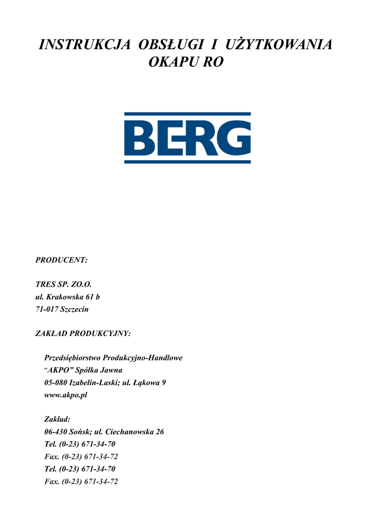 INSTRUKCJA OBSŁUGI I UŻYTKOWANIA OKAPU RO PRODUCENT: TRES SP. ZO.O. ul. Krakowska 61 b 71-017 Szczecin ZAKŁAD PRODUKCYJNY: Przedsiębiorstwo Produkcyjno-Handlowe “AKPO” Spółka Jawna 05-080 Izabelin-Laski; ul. Łąkowa 9 www.akpo.pl Zakład: 06-430 Sońsk; ul. Ciechanowska 26 Tel. (0-23) 671-34-70 Fax. (0-23) 671-34-72 Tel. (0-23) 671-34-70 Fax. (0-23) 671-34-72 SZANOWNI PAŃSTWO Serdecznie gratulujemy Państwu dokonania trafnego wyboru. Nasze urządzenia projektowane i wykonywane są z myślą o spełnieniu Państwa oczekiwań i z pewnością będą stanowić część nowocześnie wyposażonego gospodarstwa domowego. Jesteśmy przekonani, że nowoczesne, funkcjonalne i praktyczne urządzenia, wyprodukowane z najwyższej jakości materiałów, spełnią wszystkie Państwa wymagania. Przed przystąpieniem do montażu i użytkowania zakupionego okapu prosimy o dokładne zapoznanie się z treścią niniejszej instrukcji, a także zawartych w niej reguł bezpieczeństwa użytkowania. Życzymy satysfakcji i zadowolenia z wyboru okapu naszej firmy. UWAGA: 1. W czasie prac montażowych należy przestrzegać obowiązujących przepisów dotyczących odprowadzania powietrza. 2. Gdy okap nadkuchenny jest używany w tym samym czasie co przyrządy spalające gaz lub inne paliwa, pomieszczenie powinno być odpowiednio wentylowane. 3. Powietrze z okapu nie powinno być odprowadzane do kanału kominowego służącego do odprowadzania spalin z przyrządów spalających gaz lub inne paliwa. 4. Przed podłączeniem okapu do prądu należy sprawdzić, czy napięcie i częstotliwość prądu zasilającego odpowiada danym podanym na tabliczce znamionowej urządzenia. Okap musi być podłączony do łatwo dostępnego gniazdka. Niedopuszczalne jest usuwanie wtyczki i podłączanie na stałe okapu do zasilania. 5. jeżeli czyszczenie i konserwacja nie jest wykonywana zgodnie z instrukcją, istnieje ryzyko pożaru. 6. W przypadku użytkowania kuchenki gazowej nie wolno pozostawiać odkrytego płomienia. 7. Sprzęt nie jest przeznaczony do użytkowania przez osoby (w tym dzieci) o ograniczonej zdolności fizycznej, czuciowej lub psychicznej. 8. Sprzęt nie jest przeznaczony do zabawy dla dzieci. 9. Jeżeli przewód zasilający nieodłączalny ulegnie uszkodzeniu, to powinien on być zastąpiony specjalnym przewodem lub zespołem dostępnym u wytwórcy lub specjalnym zakładzie naprawczym. 10.Producent nie ponosi odpowiedzialności z powodu nieprzestrzegania przepisów dotyczących instalacji i konserwacji oraz nieprawidłowej obsługi okapu. 11.Dostępne części mogą stać się gorące podczas gotowania na kuchni. RO 1. INFORMACJE OGÓLNE Okap kuchenny RO został zaprojektowany do usuwania oparów kuchennych w trybie wyciągowym (przewody poprowadzone na zewnątrz) lub w trybie pochłaniacza (obieg wewnętrzny). Jest przeznaczony do mocowania nad gazową lub elektryczną płytą grzewczą. Posiada niezależne oświetlenie oraz turbinę wyciągową z możliwością ustawienia jednej z pięciu prędkości obrotowych. UWAGA: Prosimy zachować dowód zakupu wraz z podstemplowaną kartą gwarancyjną w celu ewentualnej reklamacji. Bez tych dokumentów gwarancja jest nieważna. Producent zrzeka się odpowiedzialności za uszkodzenia i obrażenia powstałe wskutek montażu i użytkowania niezgodnego z instrukcją obsługi zawartą w niniejszym tekście. 2. PARAMETRY TECHNICZNE CECHY CHARAKTRYSTYCZNE RO Napięcie znamionowe 230V-50Hz Moc ogólna 210W Moc silnika 140 W Moc oświetlenia 2 x35 W Wydajność max. 400 m3/h Sprzęt klasy drugiej Rodzaj pracy ciągła pod nadzorem 3. INSTALACJA 3.1 USTAWIENIE TRYBU PRACY OKAPU Okap RO może pracować w dwóch trybach: 1)Wyciągu (Rys.2a) - odprowadzenie powietrza na zewnątrz budynku poprzez połączenie okapu sztywną rurą z tworzywa sztucznego Ø120mm z kanałem wentylacyjnym. 2)Pochłaniacza (Rys.2b) - obieg wewnętrzny powietrza, przy użyciu filtrów węglowych (Rys.1). Rys.1 Przy obiegu wewnętrznym konieczne jest zamontowanie filtrów węglowych (Rys.1). Oczyszczone powietrze przez filtry powraca do obiegu otworem wylotowym. Filtry węglowe należy wymieniać nie rzadziej niż raz na 3 miesiące (w zależności od intensywności gotowania). a) WYCIĄG b) POCHŁANIACZ Rys.2 UWAGA: Powietrze z okapu nie powinno być odprowadzane do kanału kominowego służącego do odprowadzania spalin z przyrządów spalających gaz lub inne paliwa. 3.2 PODŁĄCZENIE ELEKTRYCZNE Przed podłączeniem okapu do prądu należy sprawdzić, czy napięcie i częstotliwość prądu zasilającego odpowiada danym podanym na tabliczce znamionowej urządzenia. Okap musi być podłączony do łatwo dostępnego gniazdka. Niedopuszczalne jest usuwanie wtyczki i podłączanie na stałe okapu do zasilania. Okap należy podłączyć do zasilania po niniejszym montażu. 4. MONTAŻ Odległość „A” pomiędzy najniższą częścią okapu nadkuchennego a powierzchnią podtrzymującą naczynia do przyrządzania potraw powinna wynosić min. 65 cm dla kuchni gazowej (Rys.3). W czasie prac montażowych należy przestrzegać obowiązujących przepisów dotyczących odprowadzania powietrza. Gdy okap nadkuchenny jest używany w tym samym czasie co przyrządy spalające gaz lub inne paliwa, pomieszczenie powinno być odpowiednio wentylowane. W celu uzyskania optymalnego odprowadzenia powietrza należy stosować sztywny przewód z tworzywa sztucznego o przekroju Ø120mm. Rys. 3 4.1 CZĘŚCI SKŁADOWE DO MONTAŻU 1- korpus okapu 2- maskownica dolna 3- maskownica teleskopowa górna 4- listwa montażowa do maskownicy 5- dwa kołki rozporowe 10x50 mm z wkrętami 6- dwa kołki rozporowe 5x25 mm z wkrętami 7- dwa wkręty 3,9x6,5 mm 5 6 7 Rys.4 4.2 MONTAŻ KORPUSU OKAPU •Otworzyć szybę pociągając do siebie za dolną krawędź (rys.5). •Zdemontować aluminiowy filtr tłuszczowy (rys.9) •Przyłożyć obudowę okapu do ściany zachowując minimalną odległość 65 cm od dolnej krawędzi okapu do powier