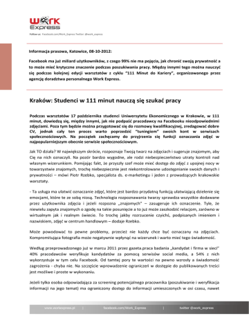 Follow us: Facebook.com/Work_Express Twitter: @work_express Informacja prasowa, Katowice, 08-10-2012: Facebook ma już miliard użytkowników, z czego 99% nie ma pojęcia, jak chronić swoją prywatność a to może mieć krytyczne znaczenie podczas poszukiwania pracy. Między innymi tego można nauczyć się podczas kolejnej edycji warsztatów z cyklu “111 Minut do Kariery”, organizowanego przez agencję doradztwa personalnego Work Express. Kraków: Studenci w 111 minut nauczą się szukać pracy Podczas warsztatów 17 października studenci Uniwersytetu Ekonomicznego w Krakowie, w 111 minut, dowiedzą się, między innymi, jak nie podpaść pracodawcy na Facebooku nieodpowiednimi zdjęciami. Poza tym będzie można przygotować się do rozmowy kwalifikacyjnej, zredagować dobre CV, jednak cały ten proces warto poprzedzić “tuningiem” swoich kont w serwisach społecznościowych. Na początek zachęcamy do przyjrzenia się funkcji oznaczania zdjęć w najpopularniejszym obecnie serwisie społecznościowym. Jak TO działa? W największym skrócie, rozpoznaje Twoją twarz na zdjęciach i sugeruje znajomym, aby Cię na nich oznaczyli. Na pozór bardzo wygodne, ale rodzi niebezpieczeństwo utraty kontroli nad własnym wizerunkiem. Pomijając fakt, że przyszły szef może mieć dostęp do zdjęć z upojnej nocy w towarzystwie znajomych, trochę niebezpiecznie jest niekontrolowane udostępnianie swoich danych i prywatności – mówi Piotr Rzebko, specjalista ds. e-marketingu i jeden z prowadzących krakowskie warsztaty. - Ta usługa ma ułatwić oznaczanie zdjęć, które jest bardzo przydatną funkcją ułatwiającą dzielenie się emocjami, które te ze sobą niosą. Technologia rozpoznawania twarzy sprawdza wszystkie dodawane przez użytkownika zdjęcia i jeżeli rozpozna „znajomych” – zasugeruje ich oznaczenie. Tyle, że niewielu zapyta znajomych o zgodę na takie posunięcie a to już może zaszkodzić relacjom, zarówno w wirtualnym jak i realnym świecie. To trochę jakby rozrzucenie czyichś, podpisanych imieniem i nazwiskiem, zdjęć w centrum handlowym – dodaje Rzebko. Może powodować to pewne problemy, przecież nie każdy chce być oznaczany na zdjęciach. Kompromitująca fotografia może negatywnie wpłynąć na wizerunek i warto mieć tego świadomość. Według przeprowadzonego już w marcu 2011 przez gazeta.praca badania „kandydat i firma w sieci” 40% pracodawców weryfikuje kandydatów za pomocą serwisów social media, a 54% z nich wykorzystuje w tym celu Facebook. Od tamtej pory te wartości na pewno wzrosły a świadomość zagrożenia - chyba nie. Na szczęście wprowadzenie ograniczeń w dostępie do publikowanych treści jest możliwe i proste w wykonaniu. Jeżeli tylko osoba odpowiadająca za screening potencjalnego pracownika (poszukiwanie i weryfikacja informacji na jego temat) ma ograniczony dostęp do informacji umieszczonych w osi czasu, nawet www.workexpress.pl | facebook.com/Work_Express | twitter @work_express Follow us: Facebook.com/Work_Express Twitter: @work_express gdy funkcja oznaczania będzie aktywna, nie zobaczy tych treści. Usługę sugerowania oznaczeń i automatycznego publikowania informacji o nich można wyłączyć. Należy w tym celu przejść do ustawień prywatności i zdefiniować kto widzi propozycje znaczników dla zdjęć i włączyć funkcję zatwierdzania postów, w których zostało się oznaczonym przed ich publikacją w osi czasu. Po jej aktywowaniu dowiemy się, iż znaczniki mogą być widoczne w innych miejscach na Facebooku. Aby sobie z tym poradzić trzeba również włączyć funkcję zatwierdzania wszystkich znaczników. Wtedy nawet gdy zostanie się oznaczonym na treści opublikowanej przez kogoś innego, można zablokować widoczność w osi czasu, usunąć znacznik lub wysłać prośbę o usunięcie zdjęcia do osoby, która je opublikowała. Po grupowym opisywaniu, automatycznemu sugerowaniu i umożliwieniu oznaczania również firm i marek na zdjęciach nie zaskoczy mnie, jeżeli w niedługim czasie portal zasugeruje nam potwierdzanie, jakie my i nasi znajomi posiadamy na nich produkty oraz w jakim znajdujemy się stanie emocjonalnym – dodaje Piotr Rzebko, odpowiedzialny podczas warsztatów za panel „wizerunek kandydata w sieci”. Poza umiejętnością dbania o prywatność w internecie, uczestnicy „111 Minut do Kariery” oswoją się z takimi pojęciami jak „personal branding”, „stress interview” i „dress code”, a najaktywniejsi będą mogli spotkać się indywidualnie ze specjalistą ds. personalnych i rozwiać wszelkie wątpliwości dotyczące swojego przygotowania do debiutu na rynku pracy. Do tej pory w spotkaniach w Katowicach, Warszawie i Wrocławiu uczestniczyło ponad 400 studentów, którzy nabyli szereg umiejętności zwiększających ich sznasę na znalezienie zatrudnienia. Bezpłatne warsztaty odbędą się na terenie Uniwersytetu Ekonomicznego w Krakowie, w Sali nr 1 w pawilonie S, początek o godzinie 11:20. Wszystkich chętnych zapraszamy do rejestracji na stronie projektu www.111minut.pl Kontakt do eksperta Work Express: Artur RAGAN – rzecznik prasowy Work Express tel. 513 015 260, mail. [email protected] O Work Express Sp. z.o.o. Work Express to certyfikowana agencja doradztwa personalnego i pracy tymczasowej, która działa na rynku od 2004 r. Firma oferuje usługi z zakresu pracy tymczasowej i doradztwa personalnego, pozostając jednym z liderów branży HR a od 2009 rozwija również ofertę outsourcingową. Centrala firmy znajduje się w Katowicach, a oddziały w Częstochowie, Gliwicach, Grodzisku Mazowieckim, Krakowie, Łodzi, Poznaniu i Wrocławiu. Poza Polską prowadzi działalność także na terenie Francji, Niemiec i Belgii. Spółka należy do Polskiego Forum HR a prezes zarządu agencji działa we władzach tej organizacji. Zespół Work Express to ponad 170 fachowców, którzy zatrudnili już ponad 50 000 pracowników tymczasowych. Firma została 