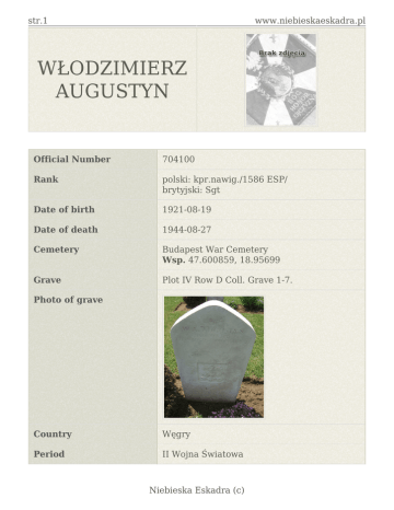 str.1 www.niebieskaeskadra.pl WŁODZIMIERZ AUGUSTYN Official Number 704100 Rank polski: kpr.nawig./1586 ESP/ brytyjski: Sgt Date of birth 1921-08-19 Date of death 1944-08-27 Cemetery Budapest War Cemetery Wsp. 47.600859, 18.95699 Grave Plot IV Row D Coll. Grave 1-7. Photo of grave Country Węgry Period II Wojna Światowa Niebieska Eskadra (c) str.2 www.niebieskaeskadra.pl Source "Księga lotników polskich..." O. Cumft, H.K. Kujawa "Ku czci..." Zbiorowa "Polskie Siły Powietrzne..." T.J. i Anna Krzystek Zdjęcie: Charles Biller. Włodzimierz Augustyn urodził się w Płocku 19 sierpnia 1921 r. w Płocku. Tu pobierał nauki w miejscowym gimnazjum i zdał egzaminy maturalne. Wybuch II wojny światowej zastał go w okolicach Suwałk. Włodek przebywał w junackim hufcu pracy. 4 września 1939 r. zgłosił się na ochotnika do wojska. Został włączony do grupy podchorążych pułku piechoty w Lidzie. Nie brał udziału w walkach. Wycofywał się ze swą jednostką. 23 września przekroczył granicę Polski z Litwą. Został internowany. Po zajęciu Litwy przez ZSRR został przewieziony został w głąb Rosji. Nadał nie pozostawał na wolności. Trafił do obozu w okolice Smoleńska. W maju 1941 r. został wywieziony do obozu pod Murmańskiem. Gdy ten został ewakuowany, znalazł się w lipcu 1941 r. pod Archangielskiem. Po podpisaniu z końcem lipca 1941 r. umowy polsko rosyjskiej wyszedł na wolność. Chciał walczyć. Pospieszył do tworzących się oddziałów Wojska Polskiego. Tak znalazł się w Tatiszczewie. Początkowo przebywał w szkole podchorążych. Tyko po niej nie zamierzał wiązać się z piechotą. Dlatego zgłosił się do lotnictwa. 29 sierpnia został przeniesiony do Kołtubanki. W lutym 1942 r. został przeniesiony do Kermine. Z tego uzbeckiego miasta otrzymał skierowanie do Krasnowodzka. To właśnie z niego opływał statek z polskim lotnikami do Wielkiej Brytanii. Popłynął z nimi początkowo do Pahlewi w Iranie. Następnie na pokładzie innego ruszył w rejs do Bombaju. Po wyokrętowaniu przesiadł się na pokład innego idącego do Kapsztadu. Na tym nie skończył swojej morskiej "przygody". Znów się przesiadał. Tym razem ostatni raz, aby 16 maja 1942 r. ostatecznie ruszyć do Wielkiej Brytanii. Na Wyspie Ostatniej Nadziei znalazł się 6 czerwca 1942 r. Będąc kandydatem do lotnictwa został skoszarowany w Kirkcaldy. Po odbyciu kurs rekruckiego mógł się 28 sierpnia 1942 r. w Blackpool. 12 września 1942 r. rozpoczął szkolenie teoretyczne w Hucknall. Dalszą naukę kontynuował w Brighton. Skończył ją pod koniec lutego 1943 r. Teraz został skierowany do grupy zdobywającej niezbędne kwalifikacje nawigatorów samolotowych w Cranwell. Zapoznał się z obsługą samolotowego radaru. Po ukończeniu tego kursu znów był skierowany do Blackpool. Tu pod koniec czerwca 1943 r. wyruszył transportem morskim do Kanady. Po drugiej stronie wielkiej wody dobywał wiedzą w nawigacji lotniczej. Po powrocie do Wielkiej Brytanii z końcem marca 1944 r. rozpoczął kurs zgrywania załóg w Finningley. 31 maja znalazł się w Blyton. 30 lipca 1944 r. Włodek został przydzielony do 300 Dywizjonu Bombowego "Ziemi Mazowieckiej". Wykonał dwa loty bojowe. Latał nad Francję. Bombardował porty Breście t i St. Nazaire. 14 sierpnia razem ze swoją załogą zmienił dywizjon. 19 sierpnia 1944 r. meldował się we Włoszech. Stacjonował na lotnisku w okolicach Brindisi. Dlaczego tam się znalazł ? Powodem było uzupełnienie załóg 1586 Eskadry do Zadań Specjalnych. Od sierpnia 1944 r. lotnicy z tego lotniska wykonywali loty z zrzutami między innymi dla powstańców warszawskich. Pierwszy lot z pomocą walczącej stolicy odbył nocą z 25 na 26 sierpnia 1944 r. 27 sierpnia 1944 r. poleciał drugi raz. Nie doleciał. Jego samolot został zestrzelony przez nocnego Niebieska Eskadra (c) str.3 www.niebieskaeskadra.pl myśliwca w okolicach stolicy Węgier. Razem z nim zginęli pozostali członkowie załogi. Włodzimierz Augustyn został pochowany na Brytyjskim Cmentarzu Wojennym w Solymar, przedmieścia Budapesztu. Opracowanie Konrad RYDOŁOWSKI. Niebieska Eskadra (c)