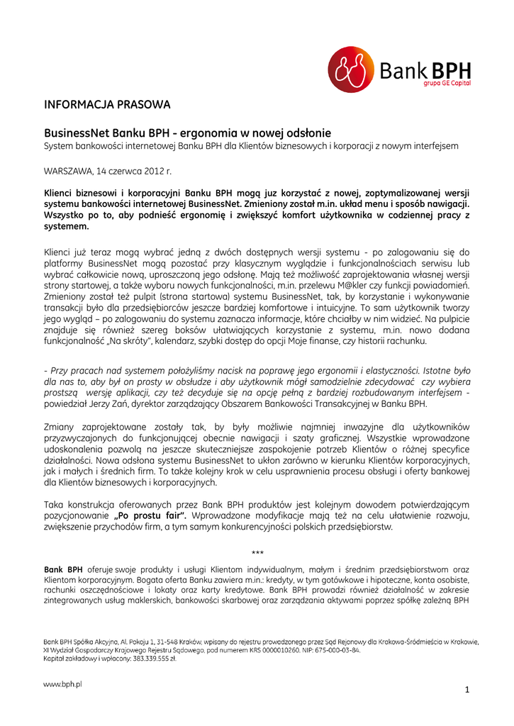 INFORMACJA PRASOWA BusinessNet Banku BPH - ergonomia w nowej odsłonie System bankowości internetowej Banku BPH dla Klientów biznesowych i korporacji z nowym interfejsem WARSZAWA, 14 czerwca 2012 r. Klienci biznesowi i korporacyjni Banku BPH mogą juz korzystać z nowej, zoptymalizowanej wersji systemu bankowości internetowej BusinessNet. Zmieniony został m.in. układ menu i sposób nawigacji. Wszystko po to, aby podnieść ergonomię i zwiększyć komfort użytkownika w codziennej pracy z systemem. Klienci już teraz mogą wybrać jedną z dwóch dostępnych wersji systemu - po zalogowaniu się do platformy BusinessNet mogą pozostać przy klasycznym wyglądzie i funkcjonalnościach serwisu lub wybrać całkowicie nową, uproszczoną jego odsłonę. Mają też możliwość zaprojektowania własnej wersji strony startowej, a także wyboru nowych funkcjonalności, m.in. przelewu M@kler czy funkcji powiadomień. Zmieniony został też pulpit (strona startowa) systemu BusinessNet, tak, by korzystanie i wykonywanie transakcji było dla przedsiębiorców jeszcze bardziej komfortowe i intuicyjne. To sam użytkownik tworzy jego wygląd – po zalogowaniu do systemu zaznacza informacje, które chciałby w nim widzieć. Na pulpicie znajduje się również szereg boksów ułatwiających korzystanie z systemu, m.in. nowo dodana funkcjonalność „Na skróty”, kalendarz, szybki dostęp do opcji Moje finanse, czy historii rachunku. - Przy pracach nad systemem położyliśmy nacisk na poprawę jego ergonomii i elastyczności. Istotne było dla nas to, aby był on prosty w obsłudze i aby użytkownik mógł samodzielnie zdecydować czy wybiera prostszą wersję aplikacji, czy też decyduje się na opcję pełną z bardziej rozbudowanym interfejsem powiedział Jerzy Zań, dyrektor zarządzający Obszarem Bankowości Transakcyjnej w Banku BPH. Zmiany zaprojektowane zostały tak, by były możliwie najmniej inwazyjne dla użytkowników przyzwyczajonych do funkcjonującej obecnie nawigacji i szaty graficznej. Wszystkie wprowadzone udoskonalenia pozwolą na jeszcze skuteczniejsze zaspokojenie potrzeb Klientów o różnej specyfice działalności. Nowa odsłona systemu BusinessNet to ukłon zarówno w kierunku Klientów korporacyjnych, jak i małych i średnich firm. To także kolejny krok w celu usprawnienia procesu obsługi i oferty bankowej dla Klientów biznesowych i korporacyjnych. Taka konstrukcja oferowanych przez Bank BPH produktów jest kolejnym dowodem potwierdzającym pozycjonowanie „Po prostu fair”. Wprowadzone modyfikacje mają też na celu ułatwienie rozwoju, zwiększenie przychodów firm, a tym samym konkurencyjności polskich przedsiębiorstw. *** Bank BPH oferuje swoje produkty i usługi Klientom indywidualnym, małym i średnim przedsiębiorstwom oraz Klientom korporacyjnym. Bogata oferta Banku zawiera m.in.: kredyty, w tym gotówkowe i hipoteczne, konta osobiste, rachunki oszczędnościowe i lokaty oraz karty kredytowe. Bank BPH prowadzi również działalność w zakresie zintegrowanych usług maklerskich, bankowości skarbowej oraz zarządzania aktywami poprzez spółkę zależną BPH 1 TFI. Klienci Banku mogą korzystać z sieci blisko 300 oddziałów własnych, a także placówek partnerskich i agencji uniwersalnych, jak również z nowoczesnej bankowości internetowej oraz telefonicznej. Bank BPH jest obecny na polskim rynku od ponad 20 lat. Jest spółką publiczną notowaną na Giełdzie Papierów Wartościowych w Warszawie i wchodzi w skład Indeksu Respect. Siedzibą prawną Banku BPH jest Kraków, biuro centrali znajduje się w Warszawie, a główne centra operacyjne w Gdańsku i Krakowie. Bank BPH wchodzi w skład grupy kapitałowej GE, jednej z największych korporacji na świecie. Karolina Tomczyk, Specjalista ds. Public Relations Departament Public Relations Bank BPH e-mail: [email protected] Telefon: +48 22 531 84 80 2