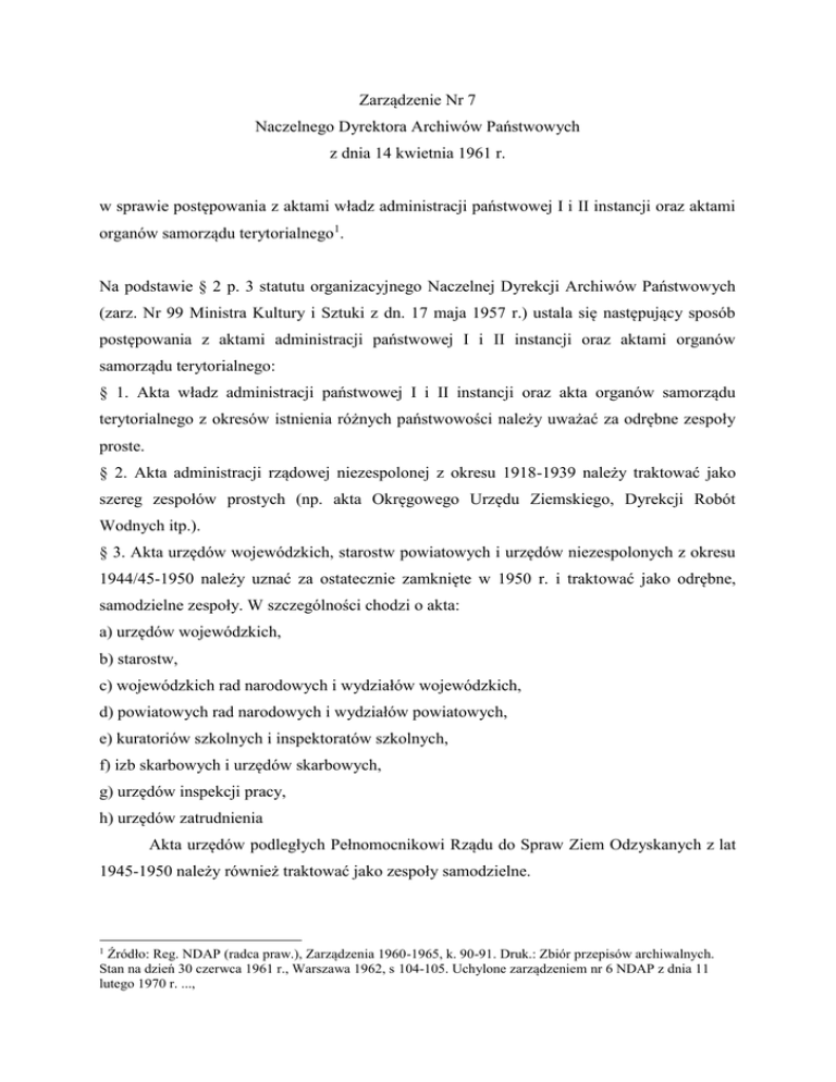 Zarządzenie Nr 7 Naczelnego Dyrektora Archiwów Państwowych z dnia 14 kwietnia 1961 r. w sprawie postępowania z aktami władz administracji państwowej I i II instancji oraz aktami organów samorządu terytorialnego1. Na podstawie § 2 p. 3 statutu organizacyjnego Naczelnej Dyrekcji Archiwów Państwowych (zarz. Nr 99 Ministra Kultury i Sztuki z dn. 17 maja 1957 r.) ustala się następujący sposób postępowania z aktami administracji państwowej I i II instancji oraz aktami organów samorządu terytorialnego: § 1. Akta władz administracji państwowej I i II instancji oraz akta organów samorządu terytorialnego z okresów istnienia różnych państwowości należy uważać za odrębne zespoły proste. § 2. Akta administracji rządowej niezespolonej z okresu 1918-1939 należy traktować jako szereg zespołów prostych (np. akta Okręgowego Urzędu Ziemskiego, Dyrekcji Robót Wodnych itp.). § 3. Akta urzędów wojewódzkich, starostw powiatowych i urzędów niezespolonych z okresu 1944/45-1950 należy uznać za ostatecznie zamknięte w 1950 r. i traktować jako odrębne, samodzielne zespoły. W szczególności chodzi o akta: a) urzędów wojewódzkich, b) starostw, c) wojewódzkich rad narodowych i wydziałów wojewódzkich, d) powiatowych rad narodowych i wydziałów powiatowych, e) kuratoriów szkolnych i inspektoratów szkolnych, f) izb skarbowych i urzędów skarbowych, g) urzędów inspekcji pracy, h) urzędów zatrudnienia Akta urzędów podległych Pełnomocnikowi Rządu do Spraw Ziem Odzyskanych z lat 1945-1950 należy również traktować jako zespoły samodzielne. Źródło: Reg. NDAP (radca praw.), Zarządzenia 1960-1965, k. 90-91. Druk.: Zbiór przepisów archiwalnych. Stan na dzień 30 czerwca 1961 r., Warszawa 1962, s 104-105. Uchylone zarządzeniem nr 6 NDAP z dnia 11 lutego 1970 r. ..., 1 § 4. Akta miasta począwszy od w. XIII do r. 1945/1950 należy traktować jako jeden zespół, dla którego przyjmuje się nazwę „akta miasta X”, i porządkować zgodnie z wytycznymi stanowiącymi załącznik do pisma okólnego nr 17 z 1.VIII.1958 r.2 § 5. Akta gminy należy uznać za ostatecznie zamknięte w 1954 r. i traktować jako jeden zespół, dla którego przyjmuje się nazwę „akta gminy X”. Przy porządkowaniu należy dzielić zespół cezurami wewnętrznymi na latach stanowiących zmianę państwowości i ewentualnie zmiany prawno-ustrojowe. § 6. Należy przyjąć następujące cezury wewnętrzne dla zespołów akt gmin leżących na terytorium: a) b. zaboru rosyjskiego 1809-1864/66/; 1864/66/-1915/18/; 1918-1939; 1939-1944/45; 1944/45/-1954. b) b. zaboru austriackiego 1784-1866; 1866-1918; 1918-1939; 1939-1944/45/; 1944/45/-1954. c) b. zaboru pruskiego 1809-1918; 1919/20 lub 1921/22/-1939; 1939-1945; 1945-1954. § 7. Na podstawie cezur wewnętrznych należy w inwentarzu wyodrębnić jako działy akta pochodzące z danego okresu państwowości wzgl. administracji, podając dokładnie brzmienie nazwy urzędu z tego okresu, z którego pochodzą akta. § 8. Akta szczątkowe kilku gmin jednego powiatu można łączyć w grupę zespołów w jednym inwentarzu. § 9. W stosunku do wszystkich omawianych w niniejszych wytycznych akt przy nadawaniu im ostatecznego układu należy zastosować układ kancelaryjny, a w razie trudności lub niemożliwości jego odtworzenia - układ strukturalno-rzeczowy (t.zn. układ rzeczowy zgodny ze strukturą urzędu). Nie należy stosować układu chronologiczno-rzeczowego (o ile nie będzie go wymagała rekonstrukcja kancelarii rosyjskiej), ponieważ taki układ rozrywa ciągłość spraw i akt komórek organizacyjnych urzędu. § 10. Akta spraw niezakończonych w jednym okresie ustrojowym, a kontynuowanych w następnym, należą do zespołu, w którym sprawa została zakończona. § 11. Dla akt pochodzących z terenu ziem zachodnich zasady powyższe obowiązują tylko dla okresu od chwili objęcia tych ziem przez administrację państwową Rzeczypospolitej Polskiej w r. 1945. 2 Zob. poz. 123 § 12. Przepisy niniejszego zarządzenia mają zastosowanie wobec akt jeszcze nie uporządkowanych. § 13. Zarządzenie wchodzi w życie z dniem wydania. Tracą moc wytyczne stanowiące załącznik do pisma Nr PN-100-2 z dnia 21.II.1957 r.3 Pisma tego wraz z wytycznymi w niniejszym wydawnictwie nie opublikowano. Pismo zawierało oprócz zalecenia stosowania wytycznych polecenie przejęcia przez archiwa wojewódzkie akt władz administracji państwowej i samorządu I i II instancji z lat 1944/1945-1950 w ciągu 1957 r. z wojewódzkich i powiatowych rad narodowych. Wytyczne zaś różniły się od niniejszych tym, że akta gminne z okresów istnienia różnych państwowości potraktowano w zasadzie jako szereg zespołów prostych, ustalając granice chronologiczne, które w niniejszych wytycznych stanowią już tylko cezury wewnętrzne w ramach jednego zespołu akt gminy X (zamkniętego w 1954 r.). Ustalono też, że archiwa posiadające jedynie szczątki zespołów akt gminnych mogą odstąpić od zasady tworzenia zespołów prostych i utworzenia z nich zespołu złożonego. (APW, APW sygn. 341, k. 32). 3