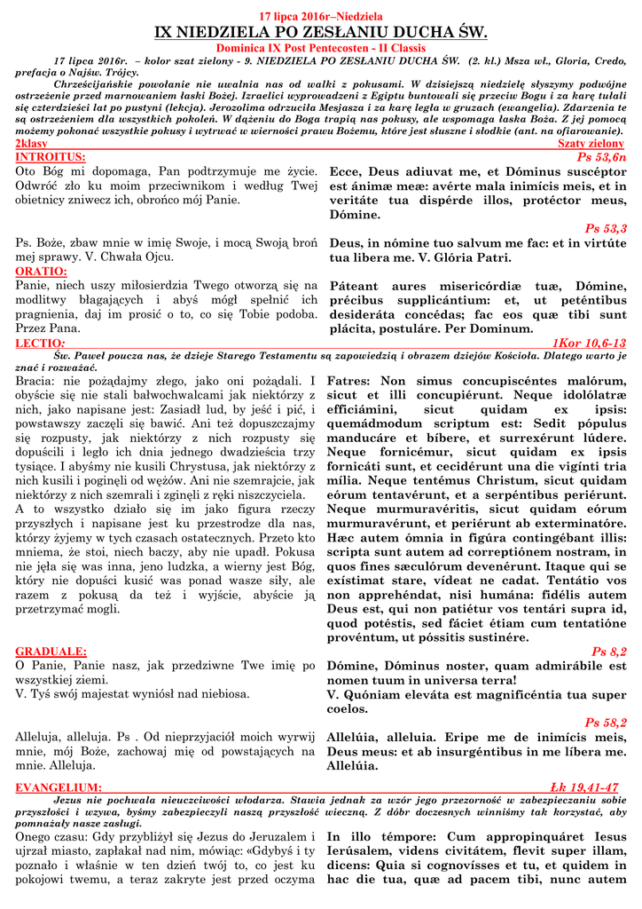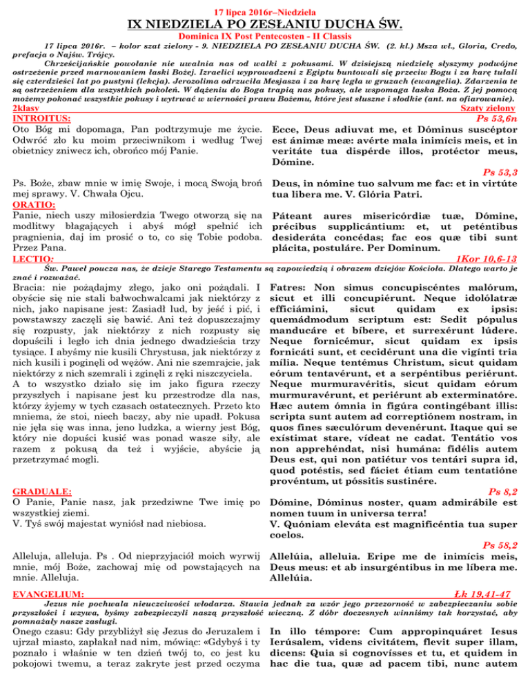 17 lipca 2016r–Niedziela IX NIEDZIELA PO ZESŁANIU DUCHA ŚW. Dominica IX Post Pentecosten - II Classis 17 lipca 2016r. – kolor szat zielony - 9. NIEDZIELA PO ZESŁANIU DUCHA ŚW. (2. kl.) Msza wł., Gloria, Credo, prefacja o Najśw. Trójcy. Chrześcijańskie powołanie nie uwalnia nas od walki z pokusami. W dzisiejszą niedzielę słyszymy podwójne ostrzeżenie przed marnowaniem łaski Bożej. Izraelici wyprowadzeni z Egiptu buntowali się przeciw Bogu i za karę tułali się czterdzieści lat po pustyni (lekcja). Jerozolima odrzuciła Mesjasza i za karę legła w gruzach (ewangelia). Zdarzenia te są ostrzeżeniem dla wszystkich pokoleń. W dążeniu do Boga trapią nas pokusy, ale wspomaga łaska Boża. Z jej pomocą możemy pokonać wszystkie pokusy i wytrwać w wierności prawu Bożemu, które jest słuszne i słodkie (ant. na ofiarowanie). 2klasy Szaty zielony INTROITUS: Ps 53,6n Oto Bóg mi dopomaga, Pan podtrzymuje me życie. Ecce, Deus adiuvat me, et Dóminus suscéptor Odwróć zło ku moim przeciwnikom i według Twej est ánimæ meæ: avérte mala inimícis meis, et in obietnicy zniwecz ich, obrońco mój Panie. veritáte tua dispérde illos, protéctor meus, Dómine. Ps 53,3 Ps. Boże, zbaw mnie w imię Swoje, i mocą Swoją broń Deus, in nómine tuo salvum me fac: et in virtúte mej sprawy. V. Chwała Ojcu. tua libera me. V. Glória Patri. ORATIO: Panie, niech uszy miłosierdzia Twego otworzą się na Páteant aures misericórdiæ tuæ, Dómine, modlitwy błagających i abyś mógł spełnić ich précibus supplicántium: et, ut peténtibus pragnienia, daj im prosić o to, co się Tobie podoba. desideráta concédas; fac eos quæ tibi sunt Przez Pana. plácita, postuláre. Per Dominum. LECTIO: 1Kor 10,6-13 Św. Paweł poucza nas, że dzieje Starego Testamentu są zapowiedzią i obrazem dziejów Kościoła. Dlatego warto je znać i rozważać. Fatres: Non simus concupiscéntes malórum, sicut et illi concupiérunt. Neque idolólatræ efficiámini, sicut quidam ex ipsis: quemádmodum scriptum est: Sedit pópulus manducáre et bíbere, et surrexérunt lúdere. Neque fornicémur, sicut quidam ex ipsis fornicáti sunt, et cecidérunt una die vigínti tria mília. Neque tentémus Christum, sicut quidam eórum tentavérunt, et a serpéntibus periérunt. Neque murmuravéritis, sicut quidam eórum murmuravérunt, et periérunt ab exterminatóre. Hæc autem ómnia in figúra contingébant illis: scripta sunt autem ad correptiónem nostram, in quos fines sæculórum devenérunt. Itaque qui se exístimat stare, vídeat ne cadat. Tentátio vos non apprehéndat, nisi humána: fidélis autem Deus est, qui non patiétur vos tentári supra id, quod potéstis, sed fáciet étiam cum tentatióne provéntum, ut póssitis sustinére. GRADUALE: Ps 8,2 O Panie, Panie nasz, jak przedziwne Twe imię po Dómine, Dóminus noster, quam admirábile est wszystkiej ziemi. nomen tuum in universa terra! V. Tyś swój majestat wyniósł nad niebiosa. V. Quóniam eleváta est magnificéntia tua super coelos. Ps 58,2 Alleluja, alleluja. Ps . Od nieprzyjaciół moich wyrwij Allelúia, alleluia. Eripe me de inimícis meis, mnie, mój Boże, zachowaj mię od powstających na Deus meus: et ab insurgéntibus in me líbera me. mnie. Alleluja. Allelúia. Bracia: nie pożądajmy złego, jako oni pożądali. I obyście się nie stali bałwochwalcami jak niektórzy z nich, jako napisane jest: Zasiadł lud, by jeść i pić, i powstawszy zaczęli się bawić. Ani też dopuszczajmy się rozpusty, jak niektórzy z nich rozpusty się dopuścili i legło ich dnia jednego dwadzieścia trzy tysiące. I abyśmy nie kusili Chrystusa, jak niektórzy z nich kusili i poginęli od wężów. Ani nie szemrajcie, jak niektórzy z nich szemrali i zginęli z ręki niszczyciela. A to wszystko działo się im jako figura rzeczy przyszłych i napisane jest ku przestrodze dla nas, którzy żyjemy w tych czasach ostatecznych. Przeto kto mniema, że stoi, niech baczy, aby nie upadł. Pokusa nie jęła się was inna, jeno ludzka, a wierny jest Bóg, który nie dopuści kusić was ponad wasze siły, ale razem z pokusą da też i wyjście, abyście ją przetrzymać mogli. EVANGELIUM: Łk 19,41-47 Jezus nie pochwala nieuczciwości włodarza. Stawia jednak za wzór jego przezorność w zabezpieczaniu sobie przyszłości i wzywa, byśmy zabezpieczyli naszą przyszłość wieczną. Z dóbr doczesnych winniśmy tak korzystać, aby pomnażały nasze zasługi. Onego czasu: Gdy przybliżył się Jezus do Jeruzalem i ujrzał miasto, zapłakał nad nim, mówiąc: «Gdybyś i ty poznało i właśnie w ten dzień twój to, co jest ku pokojowi twemu, a teraz zakryte jest przed oczyma In illo témpore: Cum appropinquáret Iesus Ierúsalem, videns civitátem, flevit super illam, dicens: Quia si cognovísses et tu, et quidem in hac die tua, quæ ad pacem tibi, nunc autem twymi. Albowiem przyjdą na ciebie dni i otoczą cię nieprzyjaciele twoi wałem, i oblegną cię, i ścisną cię zewsząd, i na ziemię powalą ciebie i dzieci twe, które w tobie są, i nie zostawią w tobie kamienia na kamieniu, dlatego, żeś nie poznało czasu nawiedzenia twego». I wszedłszy do świątyni, począł wyrzucać sprzedających w niej i kupujących, mówiąc im: «Napisane jest, że dom mój jest domem modlitwy, a wyście go uczynili jaskinią zbójców». I nauczał codziennie w świątyni. abscóndita sunt ab óculis tuis. Quia vénient dies in te: et circúmdabunt te inimíci tui vallo, et circúmdabunt te: et coangustábunt te úndique: et ad terram prostérnent te, et fílios tuos, qui in te sunt, et non relínquent in te lápidem super lápidem: eo quod non cognóveris tempus visitatiónis tuæ. Et ingréssus in templum, coepit eiícere vendéntes in illo et eméntes, dicens illis: Scriptum est: Quia domus mea domus oratiónis est. Vos autem fecístis illam speluncam latrónum. Et erat docens cotídie in templo. OFFERTORIUM: Ps 18,9nn Przykazania Pańskie słuszn