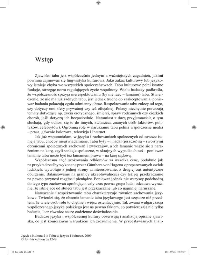 Wstęp Zjawisko tabu jest współcześnie jednym z ważniejszych zagadnień, jakimi powinna zajmować się lingwistyka kulturowa. Jako zakaz kulturowy lub językowy istnieje chyba we wszystkich społeczeństwach. Tabu kulturowe pełni istotne funkcje, strzegąc norm regulujących życie wspólnoty. Wielu badaczy podkreśla, że współczesność sprzyja nierespektowaniu (by nie rzec – łamaniu) tabu. Stwierdzenie, że nie ma już żadnych tabu, jest jednak trudne do zaakceptowania, ponieważ badania pokazują zgoła odmienny obraz. Respektowanie tabu zależy od tego, czy dotyczy ono sfery prywatnej czy też oficjalnej. Polacy niechętnie poruszają tematy dotyczące np. życia erotycznego, śmierci, spraw rodzinnych czy ciężkich chorób, jeśli dotyczą ich bezpośrednio. Natomiast z dużą przyjemnością o tym słuchają, gdy odnosi się to do innych, zwłaszcza znanych osób (aktorów, polityków, celebrytów). Ogromną rolę w naruszaniu tabu pełnią współczesne media – prasa, głównie kolorowa, telewizja i Internet. Jak już wspomniałam, w języku i zachowaniach społecznych od zawsze istnieją tabu, choćby nieuświadamiane. Tabu były – i nadal (jeszcze) są – swoistymi obrońcami społecznych zachowań i zwyczajów, a ich łamanie wiąże się z narażeniem na karę, czyli sankcje społeczne, w skrajnych wypadkach zaś – ponieważ łamanie tabu może być też łamaniem prawa – na karę sądową. Współczesna chęć szokowania odbiorców za wszelką cenę, podobnie jak na przykład rzeźby wykonane przez Günthera von Hagena z preparowanych zwłok ludzkich, wywołuje z jednej strony zainteresowanie, z drugiej zaś autentyczne oburzenie. Balansowanie na granicy akceptowalności czy też jej przekraczanie na pewno przynosi rozgłos i pieniądze. Ponieważ jednak nie wszyscy podchodzą do tego typu zachowań aprobująco, cały czas pewna grupa ludzi odczuwa wyraźnie, że istniejące od stuleci tabu jest przekraczane lub co najmniej naruszane. Naruszanie i respektowanie tabu charakteryzuje również zachowania językowe. Twierdzi się, że obecnie łamanie tabu językowego jest częstsze niż przedtem, że wiele osób robi to chętnie i wręcz ostentacyjnie. Tak zwana wulgaryzacja współczesnego języka polskiego jest na pewno faktem, co potwierdzają nie tylko badania, lecz również nasze codzienne doświadczenia. Badacze języka i współczesnej kultury obserwują i analizują opisane zjawiska, co jest koniecznym warunkiem ich zrozumienia. W przedstawianych anali- Język a Kultura 21: Tabu w języku i kulturze, 2009 © for this edition by CNS III_kor_JaK_21.indd 7 2011-09-26 10:10:37 8 Wstęp zach i opisach chodzi właśnie o zrozumienie zjawiska, a nie o wartościowanie, chociaż w wielu wypadkach trudno się oprzeć wyrażaniu emocji. Dzieje się tak, ponieważ tabu zazwyczaj chroni poczucie prywatności i bezpieczeństwa, a jego naruszenie nadal jest przez wiele osób silnie odczuwane jako zjawisko negatywne. Na początku czerwca 2002 roku odbyło się w Karpaczu XXIX konwersatorium z cyklu „Język a kultura”, którego tematem było „Tabu w języku i kulturze”. W czasie tego spotkania wygłoszono wiele referatów, z których większość publikowana jest w niniejszym tomie. Teksty dotyczą różnych aspektów tabu językowego i kulturowego – zarówno jego łamania, jak i respektowania. W zamieszczonych w niniejszym tomie pracach poruszane są niezwykle różnorodne zagadnienia, które można pogrupować w kilka kręgów tematycznych. Są tu teksty poświęcone tabu w literaturze współczesnej, w wybranych aktach mowy (krakanie, dowcip językowy), w tekstach prasowych, socjolektach. Jest też praca, w której autorki zajmują się porównaniem polsko-niemieckich frazeologizmów respektujących tabu nałożone na określenia picia alkoholu. Tom otwierają trzy artykuły omawiające zagadnienia ogólne. Anna Tyrpa zajęła się dziejami wyrazu tabu w polszczyźnie (po raz pierwszy odnotowany został w 1867 roku) i analizuje współczesne tematy tabu poruszane przez czytelników prasy popularnej, stwierdzając w konkluzji, że są one jednak uniwersalne i odwieczne: śmierć, choroba, odmienność fizyczna, życie seksualne, przemoc w rodzinie, pieniądze itd. Na retorycznych aspektach tabuizacji skupia się Tadeusz Zgółka, wskazując na relatywizację zakazu stosowaną w celach perswazyjnych. Związek tabu z konwencją jest przedmiotem rozważań Grażyny Sawickiej, która traktuje tabu obowiązujące w danej społeczności jako przestrzeganie pewnej – zwykle milczącej – umowy. Konwencja jest aprioryczna, niepisana i obowiązująca. Autorka zwraca uwagę na zmianę znaczenia wyrazu tabu we współczesnym języku polskim – jest to zakaz raczej umowny, a nie konieczny (obligatoryjny), ponadto sankcje za jego przekroczenie też się zmieniły – zwykle jest to jedynie brak aprobaty. O przełamywaniu tabu w dowcipach pisze Elżbieta Filipczuk. Dowcipy pełnią m.in. funkcję kompensacyjną wobec zakazów i nakazów kultury, przy czym usprawiedliwieniem jest fakt wypowiadania właśnie dowcipu – tekstu będącego własnością wspólną i pozwalającego na pewną swobodę. Autorka omawia dowcipy neutralne językowo, eufemistyczne oraz wulgarne, biorąc pod uwagę ich stosunek do łamania zakazu językowego. Tekst Krzysztofa Wróblewskiego poświęcony jest grom półsłówek w dowcipach językowych, które pod względem treści dotyczą erotyki i fizjologii. Tabu w takich zabawach słownych łamane jest w sposób zawoalowany, a od odbiorcy wymaga się umiejętności właściwego odszyfrowania obscenicznej treści przekazanej w niewinnej formie. Język a Kultura 21: Tabu w języku i kulturze, 2009 © for this edition by CNS III_kor_JaK_21.indd 8 2011-09-26 10:10:37 Wstęp 9 Krakanie – traktowane jako gatunek mowy – może być sposobem przełamywania tabu. Krakanie zakłada, że w odniesieniu do przyszłości „zdarzenia wartościowane ne