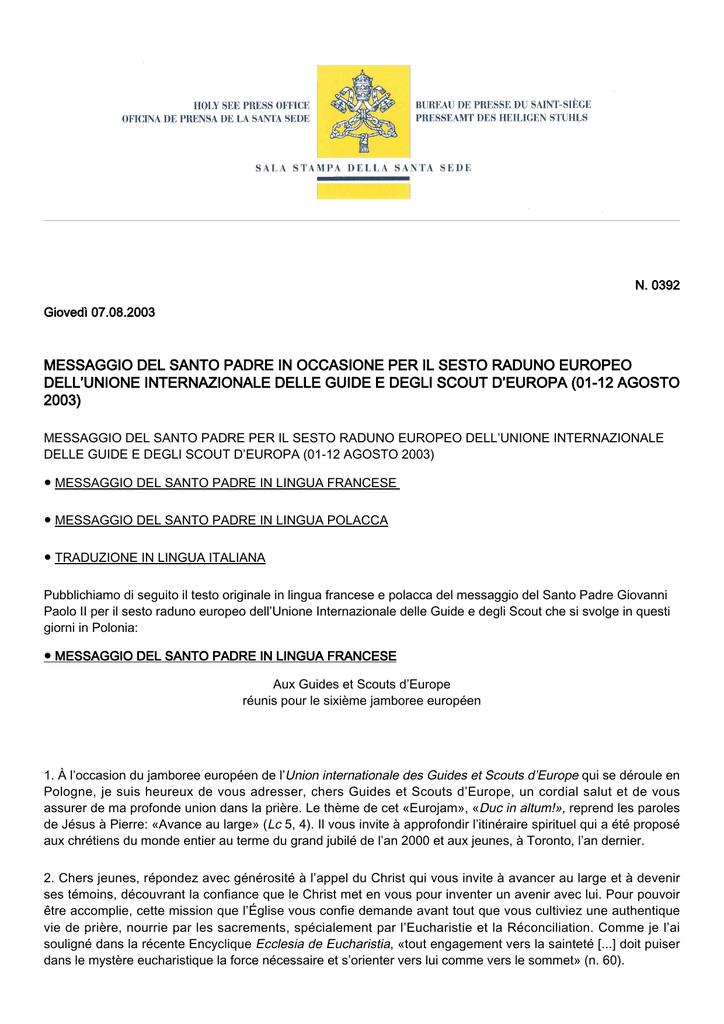 N. 0392 Giovedì 07.08.2003 MESSAGGIO DEL SANTO PADRE IN OCCASIONE PER IL SESTO RADUNO EUROPEO DELL’UNIONE INTERNAZIONALE DELLE GUIDE E DEGLI SCOUT D’EUROPA (01-12 AGOSTO 2003) MESSAGGIO DEL SANTO PADRE PER IL SESTO RADUNO EUROPEO DELL’UNIONE INTERNAZIONALE DELLE GUIDE E DEGLI SCOUT D’EUROPA (01-12 AGOSTO 2003) ● MESSAGGIO DEL SANTO PADRE IN LINGUA FRANCESE ● MESSAGGIO DEL SANTO PADRE IN LINGUA POLACCA ● TRADUZIONE IN LINGUA ITALIANA Pubblichiamo di seguito il testo originale in lingua francese e polacca del messaggio del Santo Padre Giovanni Paolo II per il sesto raduno europeo dell’Unione Internazionale delle Guide e degli Scout che si svolge in questi giorni in Polonia: ● MESSAGGIO DEL SANTO PADRE IN LINGUA FRANCESE Aux Guides et Scouts d’Europe réunis pour le sixième jamboree européen 1. À l’occasion du jamboree européen de l’Union internationale des Guides et Scouts d’Europe qui se déroule en Pologne, je suis heureux de vous adresser, chers Guides et Scouts d’Europe, un cordial salut et de vous assurer de ma profonde union dans la prière. Le thème de cet «Eurojam», «Duc in altum!», reprend les paroles de Jésus à Pierre: «Avance au large» (Lc 5, 4). Il vous invite à approfondir l’itinéraire spirituel qui a été proposé aux chrétiens du monde entier au terme du grand jubilé de l’an 2000 et aux jeunes, à Toronto, l’an dernier. 2. Chers jeunes, répondez avec générosité à l’appel du Christ qui vous invite à avancer au large et à devenir ses témoins, découvrant la confiance que le Christ met en vous pour inventer un avenir avec lui. Pour pouvoir être accomplie, cette mission que l’Église vous confie demande avant tout que vous cultiviez une authentique vie de prière, nourrie par les sacrements, spécialement par l’Eucharistie et la Réconciliation. Comme je l’ai souligné dans la récente Encyclique Ecclesia de Eucharistia, «tout engagement vers la sainteté [...] doit puiser dans le mystère eucharistique la force nécessaire et s’orienter vers lui comme vers le sommet» (n. 60). 2 Il est donc important que la Sainte Messe constitue le centre et le sommet de cette rencontre, comme de toutes vos rencontres, et de manière particulière de vos semaines dans la célébration du Jour du Seigneur. Itinéraire privilégié de croissance spirituelle, l’expérience scoute est un chemin de grande valeur pour permettre l’éducation intégrale de la personne. Elle aide à surmonter la tentation de l’indifférence et de l’égoïsme pour s’ouvrir au prochain et à la société. Elle peut favoriser efficacement l’accueil des exigences de la vocation chrétienne: être «sel de la terre et lumière du monde» (cf. Mt 5, 13-16). Je vous invite à être fidèles à la riche tradition du mouvement scout, engagée dans la formation au dialogue, au sens de la justice, à la loyauté, à la fraternité dans les rapports sociaux. Un tel style de vie peut être votre contribution originale à la réalisation d’une plus grande et plus authentique fraternité entre les peuples d’Europe, un apport précieux à la vie des sociétés dans lesquelles vous vivez. 3. Chers Guides et Scouts d’Europe, vous êtes un don précieux non seulement pour l’Église, mais aussi pour l’Europe nouvelle que vous voyez se construire sous vos yeux, et vous êtes appelés «à participer, avec toute l’ardeur de votre jeunesse, à la construction de l’Europe des peuples, pour que chaque personne soit reconnue dans sa dignité d’enfant bien-aimé de Dieu et qu’advienne une société fondée sur la solidarité et sur la charité fraternelle» (Audience avec les guides et les scouts d’Europe, 3 août 1994). 4. Au sanctuaire marial de Jasna Góra, qui m’est si cher, vous allez renouveler devant la Vierge de Cz stochowa les engagements de votre Baptême, votre promesse scoute et votre volonté d’être de vrais apôtres de l’amour du Seigneur. Vous allez redire l’acte de consécration à Notre-Dame de l’Annonciation, déjà prononcé il y a près de vingt ans en la Cathédrale Notre-Dame de Paris, à l’occasion de votre première rencontre européenne. Depuis lors, le fiat par lequel Marie a répondu à la volonté de Dieu est devenu un élément central de la spiritualité des Guides et des Scouts d’Europe, de manière particulière à travers la prière de l’Angélus et du chapelet. Puissent ces moments de prière mariale, en cette année consacrée à Notre-Dame du Rosaire, continuer à imprégner vos journées, ravivant en vos cœurs la mémoire de la merveille de l’œuvre de la Rédemption accomplie pour nous par le Christ ! Lorsque vous retournerez chez vous, dans vos familles, dans vos communautés, enrichis par l’expérience des ces journées, laissez résonner en vous les paroles de Jésus: «Et moi je suis avec vous tous les jours, jusqu’à la fin des temps» (Mt 28, 20). Soutenus par sa grâce, cherchez à vivre avec un enthousiasme renouvelé votre engagement; ainsi, le scoutisme sera pour vous «un moyen de sanctification dans l’Église», qui favorisera et encouragera «une union plus intime entre la vie concrète et votre foi» (Statuts, Art. 1,2,7). Tel est le souhait que je forme pour vous dans la prière. Invoquant sur votre rencontre européenne, sur les responsables de l’Union internationale des Guides et Scouts d’Europe et sur chacun de vous, l’intercession de la Bienheureuse Vierge de Częstochowa, de grand cœur, je vous accorde à tous une affectueuse Bénédiction apostolique. De Castel Gandolfo, le 30 juillet 2003. IOANNES PAULUS II [01255-03.02] [Texte original: Français] ● MESSAGGIO DEL SANTO PADRE IN LINGUA POLACCA Do Przewodniczek i Skautów Europy zgromadzonych na szóstym Jamboree europejskim 1. Z okazji Spotkania Eurojamboree Międzynarodowego Związku Przewodniczek i Skautów Europy, które odbywa się w Polsce, z radością przesyłam Wam drogie Przewodniczki i Ska