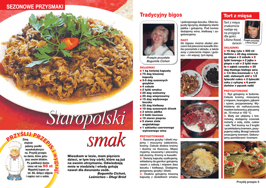 SEZONOWE PRZYSMAKI Tradycyjny bigos i pokrojonego boczku. Obie kapusty łączymy, dodajemy starte jabłka i gotujemy. Pod koniec dodajemy wino, kiełbasę i zagotowujemy Przepis przysłała Bogumiła Cichoń Staropolski smak Zimą chętnie jadamy posiłki wysokokaloryczne. Przyślij przepis na dania, które gotujesz swoim bliskim. Po publikacji dostaniesz od nas 50 zł. Wypełnij kupon ze str. 66, dołącz zdjęcie i napisz coś o sobie. Mieszkam w lesie, mam pięcioro dzieci, w tym trzy córki, które są już na swoim utrzymaniu. Odwiedzają mnie w niedzielę i wtedy gotuję nawet dla dwunastu osób. Bogumiła Cichoń, Leśnictwo – Długi Bród SKŁADNIKI ● 1 kg świeżej kapusty ● 75 dag kiszonej kapusty ● 3-5 dag suszonych grzybów ● 4 cebule ● 2 łyżki smalcu ● 25 dag wołowiny ● 25 dag wieprzowiny ● 15 dag wędzonego boczku ● 25 dag kiełbasy ● 10 dag suszonych śliwek ● 3 winne jabłka ● 2 listki laurowe ● 10 ziaren pieprzu ● 5 ziaren ziela angielskiego ● 1 szklanka czerwonego wytrawnego wina PRZYGOTOWANIE 1. Suszone grzyby i śliwki myjemy i moczymy oddzielnie, kroimy. Cebule drobno kroimy i dusimy na tłuszczu. Mięso myjemy, osuszamy i pieczemy lub dusimy. Kroimy w kawałki. 2. Świeżą kapustę szatkujemy, wkładamy do garnka i gotujemy razem z cebulą i mięsem (bez boczku i kiełbasy). Dodajemy przyprawy, grzyby i śliwki. 3. Osobno gotujemy kiszoną kapustę z dodatkiem smalcu RADY Do bigosu można dodać pieczeni lub pieczone kawałki drobiu pozostałe z obiadu, a także sosy z pieczenia mięsa i gulaszu – im więcej, tym lepiej. 1. 2. Tort z mięsa Tort z mięsa znakomicie nadaje się na przyjęcie dla gości. Liliana Kozal, Jarocin Przepis przysłała Liliana Kozal SKŁADNIKI ● 15 dag ryżu ● 300 ml bulionu ● 40 dag mielonego mięsa ● 2 cebule ● 2 łyżki twarogu ● 2 jajka ● pieprz ● sól ● 2 łyżki masła ● ząbek czosnku ● 25 dag tłustego białego sera ● 1/4 litra kremówki ● 1,5 szkl. siekanych ziół ● 1/2 łyżeczki cukru ● 2 łyżeczki soku z cytryny ● 6 pomidorków ● pęczek natki PRZYGOTOWANIE 1. Ryż gotujemy w bulionie. Cebule kroimy, mieszamy z mięsem, twarogiem, jajkami i ryżem, przyprawiamy. Wykładamy do natłuszczonej masłem tortownicy, pieczemy ok. 70 minut w 150 °C. 2. Biały ser ubijamy z kremówką, dodajemy czosnek roztarty z solą, zioła, cukier i sok. Tort kroimy na 2 krążki i przekładamy kremem, posypujemy natką. Brzegi i wierzch smarujemy kremem. Dekorujemy pomidorami i kremem. 3. Przyślij przepis 5