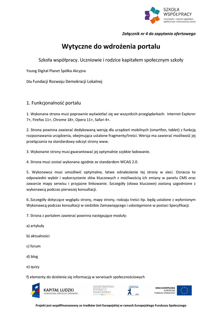 Załącznik nr 4 do zapytania ofertowego Wytyczne do wdrożenia portalu Szkoła współpracy. Uczniowie i rodzice kapitałem społecznym szkoły Young Digital Planet Spółka Akcyjna Dla Fundacji Rozwoju Demokracji Lokalnej 1. Funkcjonalność portalu 1. Wykonana strona musi poprawnie wyświetlać się we wszystkich przeglądarkach: Internet Explorer 7+, Firefox 11+, Chrome 18+, Opera 11+, Safari 4+. 2. Strona powinna zawierać dedykowaną wersję dla urządzeń mobilnych (smartfon, tablet) z funkcją rozpoznawania urządzenia, obejmująca ustalone fragmenty/treści. Wersja ma zawierać możliwość jej przełączania na standardowy odczyt strony www. 3. Wykonanie strony musi gwarantować jej optymalnie szybkie ładowanie. 4. Strona musi zostać wykonana zgodnie ze standardem WCAG 2.0. 5. Wykonawca musi umożliwić optymalne, łatwe odnalezienie tej strony w sieci. Oznacza to odpowiedni wybór i wykorzystanie słów kluczowych z możliwością ich zmiany w panelu CMS oraz zawarcie mapy serwisu i przyjazne linkowanie. Szczegóły (słowa kluczowe) zostaną uzgodnione z wykonawcą podczas pierwszej konsultacji. 6..Szczegóły dotyczące wyglądu strony, mapy strony, rodzaju treści itp. będą ustalone z wyłonionym Wykonawcą podczas konsultacji w siedzibie Zamawiającego i udostępnione w postaci Specyfikacji. 7. Strona z portalem zawierać powinna następujące moduły: a) artykuły b) aktualności c) forum d) blog e) quizy f) elementy do dzielenia się informacją w serwisach społecznościowych Projekt jest współfinansowany ze środków Unii Europejskiej w ramach Europejskiego Funduszu Społecznego g) komentarze 8. Wykonawca powinien dysponować umiejętnościami pozwalającymi na stworzenie lub dostosowanie dodatkowych modułów nie wymienionych w punkcie 1.7, a wymaganych po przedstawieniu Wykonawcy specyfikacji wymagań. 9. Wszystkie elementy portalu powinny zostać wykonane w technologiach otwartych, przykładowo XHTML 1.0, JavaScript, CSS. Niedozwolone jest stosowanie technologii zamkniętych, przykładowo Flash, Silverlight. 2. Specyfikacja techniczna CMS 1. Systemem CMS ma być Joomla 2.5 lub nowsza. 2. Istotnymi elementami tego CMS-a, które w razie nie występowania w pierwotnej wersji mają być stworzone dodatkowo przez Wykonawcę i uruchomione w CMS Joomla są: a) nawigacja na stronie z portalem i CMS powinny być intuicyjne, nieskomplikowane, zapewniające bezproblemowy dostęp do informacji osobom, które będą pracowały z witryną b) CMS musi gwarantować brak ograniczeń co do wielkości artykułów c) CMS musi być skonstruowany w taki sposób aby można było swobodnie dodawać i odejmować wyświetlane na stronie zakładki, dodawać i odejmować treści, ładować pliki, linkować, itp. d) projekt musi uwzględniać tworzenie struktury serwisu do maksymalnie 4 poziomów, edycję etykiet, nazw adresów, możliwość przenoszenia kategorii z zawartością w inne miejsce w strukturze. e) dodawanie/edycja treści na stronie musi uwzględniać fakt, iż użytkownicy będą kopiować treść z edytorów tekstu typu: Microsoft Office Word, Open Office, dlatego wymagane jest aby przy kopiowaniu treści następowało automatyczne czyszczenie treści do postaci czystego tekstu/kodu HTML z dozwolonymi tagami f) tworzenie i edycja dokumentów musi uwzględniać tryb podglądu WYSIWYG g) dodawanie plików do treści strony powinno odbywać się poprzez wybranie pliku z komputera użytkownika i dodawanie jako „załącznika” widocznego poniżej treści strony, wraz z ikoną pokazującą rodzaj pliku (*.doc, *.xls, *.pdf, *.jpg, itd.), z możliwością definicji typów plików i odpowiadających im logotypów h) panel administracyjny musi zwierać opcję zarządzania plikami do pobrania oraz możliwość dodawania ikon PDF, Word, itp. Projekt jest współfinansowany ze środków Unii Europejskiej w ramach Europejskiego Funduszu Społecznego i) poszczególne treści umieszczane na stronie serwisu mogą zawierać tekst o różnej długości - od jednego zdania do kilku stron, dlatego Wykonawca musi uwzględnić to przy budowie panelu administrującego treściami. j) projekt musi uwzględniać opcję dodawania nowych komponentów i modułów Joomla. k) Wykonawca powinien uwzględnić przy budowie panelu administracyjnego łatwe dodawanie do treści grafik/zdjęć, jak również filmów oraz opcję załączania plików. l) moduł galerii powinien pozwalać na tworzenie kategorii galerii oraz na łatwe dodawanie wielu zdjęć w jednym czasie. m) system CMS musi posiadać wbudowaną obsługę szablonów graficznych, formularze kontaktowe oraz opcję newslettera z możliwością wysyłki mailingu - newsletter w systemie musi być opcjonalny tzn. że można go będzie ukryć. n) ustawienia strony z portalem powinny gwarantować możliwość wydrukowania tła (kolorów i obrazków) o) system CMS musi zawierać funkcjonalność pozwalającą na zarządzanie modułami wymienionymi w pkunkcie 1.7 w zakresie, który zostanie przedstawiony w specyfikacji. p) system CMS oraz jego dodatkowe moduły powstałe w wyniku wykonania zamówienia powinny być zabezpieczone przed wszystkimi możliwymi formami ataków hakerskich wykorzystujących luki w oprogramowaniu. 3. Hosting i domena 1. Wybrana do prowadzenia usługi firma hostingująca powinna być wiarygodna (z ugruntowaną pozycją na rynku) i profesjonalna - gwarantująca nieprzerwany dostęp do strony. 2. Transfer danych musi być nielimitowany. 3. Wielkość powierzchni dyskowej zostanie uzgodniona z Wykonawcą podczas pierwszych konsultacji, jednak bezwzględnie umowa z firmą hostingującą musi uwzględniać możliwość zwiększenia powierzchni dyskowej w razie potrzeby. 4. Hosting powinien spełniać wymagania wybranego CMS-a (odpowiednia wersja PHP i MySQL). 5. Językiem używanym do tworzenia aplikacji ma być PHP 5. 6. Strona powinna być wykonana w oparciu o bazę MySQL 5. 7. Strona musi zawierać dostęp do panelu administratora