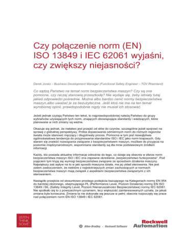 Czy połączenie norm (EN) ISO 13849 i IEC 62061 wyjaśni, czy zwiększy niejasności? Derek Jones – Business Development Manager (Functional Safety Engineer – TÜV Rheinland) Co sądzą Państwo na temat norm bezpieczeństwa maszyn? Czy są one pomocne, czy raczej stanowią przeszkodę? Nie wydaje się, żeby istniały tutaj jakieś odpowiedzi pośrednie. Można albo bardzo cenić normy bezpieczeństwa maszyn,albo uważać je za bezużyteczne. Jeśli ktoś nie ma na ten temat wyrobionej opinii, prawdopodobnie nigdy nie musiał ich stosować. Jeżeli jednak czytają Państwo ten tekst, to najprawdopodobniej należą Państwo do grupy wybrańców używających tych norm, znających obowiązujące standardy i wiedzących, które planowane w nich zmiany są ważne. Okazuje się jednak, że niełatwo jest przejść od słów do czynów, szczególnie jeżeli spojrzeć na sprawę z globalnej perspektywy. Próba dopasowania odmiennych norm do różnych regionów świata może stanowić męczący i długotrwały proces. Pomocna w tym jest niewątpliwie ogólnoświatowa tendencja do przyjmowania standardów ISO i IEC jako norm krajowych. Gdy staram się znaleźć rozwiązania związane z bezpieczeństwem maszyn, możliwe do przyjęcia na poziomie międzynarodowym, wspomniane standardy są dla mnie podstawowym źródłem informacji. Każdy, kto posiada aktualne informacje odnośnie do tego, co dzieje się obecnie w sferze norm bezpieczeństwa maszyn ISO i IEC zna zapewne określenie „bezpieczeństwo funkcjonalne”. Pod pojęciem tym kryją się wymogi bezpieczeństwa związane ze sposobem działania maszyny. Największy zaś wpływ na to w jaki sposób maszyna działa, ma jej układ sterowania. Nie jest zatem zaskoczeniem, że niektóre z najistotniejszych zmian zachodzących w normach bezpieczeństwa maszyn mają związek z aspektami bezpieczeństwa związanymi z ich sterowaniem. Nastąpiło przejście od stosunkowo prostego podejścia bazującego na Kategoriach normy EN 954 do bardziej złożonego, obejmującego PL (Performance Level, Poziom Działania) normy EN ISO 13849 i SIL (Safety Integrity Level, Poziom Nienaruszalności Bezpieczeństwa) normy IEC 62061. Nie spotkało się to z powszechnym uznaniem, lecz większość zainteresowanych uznała, że jakaś zmiana była konieczna. Zmiana ta nie dokonała się jeszcze w pełni; obecnie rozpoczęły się prace nad połączeniem norm EN ISO 13849 i IEC 62061. 2 | Połączenie międzynarodowych norm bezpieczeństwa maszyn Nim jednak pojawią się głosy niezadowolenia, chciałbym zauważyć, że w mojej opinii osiągnęliśmy już szczytowy poziom, jeśli chodzi o trudność i zaburzenia. Nie powinny powstawać nowe metodologie ani wzory. To, co istnieje w chwili obecnej, zostanie utrzymane. Poświęcono czas i pieniądze, aby dotrzeć tu, gdzie się obecnie znajdujemy, i nie jest to zdecydowanie dobry moment na zaczynanie wszystkiego od początku. Jest to natomiast czas na skorzystanie z możliwości usprawnień. Grupa robocza ISO-IEC rozpoczęła pracę. Docelowa data ukończenia została zaplanowana na rok 2016, jednak spotkano się z opiniami, że jest to zbyt optymistyczne założenie. Bardziej realistyczne wydaje się zakończenie prac w roku 2018. Jak znaleźliśmy się w obecnej sytuacji? Kategorie, Poziomy Działania, Poziomy Nienaruszalności Bezpieczeństwa. Prowadzą do wątpliwości czy wyjaśniają problem? Co doprowadziło nas do tego punktu? Aby przewidzieć, dokąd dotrzemy w przyszłości, najpierw musimy zrozumieć to, czego nauczyliśmy się w przeszłości. Dziesięć – dwadzieścia lat temu wielu z nas pracowało z wykorzystaniem Kategorii opisanych w obecnie nieużywanej normie „EN 954: Elementy systemów sterowania związane z bezpieczeństwem”. Podejście zgodne z EN 954 wymagało zastosowania podstawowych zasad bezpieczeństwa. Ponadto zarówno użycie prostych, solidnych i wypróbowanych elementów tolerancja uszkodzeńi skuteczności ich wykrywania było niezbędne do zapobiegania defektom funkcji bezpieczeństwa. Jeśli przykładowo system zdawał się należeć do „Kategorii 3”, w ujęciu czysto strukturalnym stanowiło to czasami nieodpartą zachętę do wprowadzenia znacznie uproszczonego podejścia polegającego na odhaczaniu pól wyboru na liście. Z upływem czasu użytkownicy nauczyli się w pełni rozumieć znaczenie normy, jak również wypracowali rozsądny sposób interpretacji kwestii niejasnych. Stało się tak po części dzięki nauce płynącej z doświadczenia, jak również z powodu dostępności informacji instruktażowych, takich jak doskonały przewodnik wydany przez IFA (dawniej BGIA) w Niemczech. Jednak pod koniec pierwszej dekady XXI wieku stało się jasne, że zastosowanie złożonej elektroniki i programowalnych technologii w systemach bezpieczeństwa jest nieuniknione. Było oczywiste, że na postanowieniach tej normy, która w stosunkowo prosty sposób podchodziła do zagadnienia, nie będzie można polegać w przypadku technologii bezpieczeństwa maszyn nowej generacji. Sytuacja ta doprowadziła do publikacji w roku 2005 normy „IEC 62061: Bezpieczeństwo funkcjonalne elektrycznych, elektronicznych i programowalnych elektronicznych systemów sterowania związanych z bezpieczeństwem”, wkrótce po której wydano całkowicie zmienioną wersję normy EN ISO 13849. Obie normy wprowadziły bardziej złożony sposób podejścia, dający możliwość radzenia sobie ze wzrastającą złożonością technologii i funkcji bezpieczeństwa. W wielu przypadkach funkcja bezpieczeństwa nie może być dłużej postrzegana jako proste wyłączenie zasilania. Pojawienie się na przykład systemów logicznych z wbudowanymi funkcjami bezpieczeństwa umożliwiło zastosowanie inteligentnych funkcji reagujących na różnorodne stany maszyny, zwiększając, a nie ograniczając jej wydajność. Jednakże większa elastyczność funkcji oznacza większe wymagania dla ochrony przed pomyłkami 
