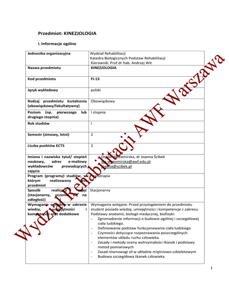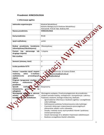 Przedmiot: KINEZJOLOGIA I. Informacje ogólne Jednostka organizacyjna Nazwa przedmiotu Wydział Rehabilitacji Katedra Biologicznych Podstaw Rehabilitacji Kierownik: Prof.dr hab. Andrzej Wit KINEZJOLOGIA Kod przedmiotu FI-13 Język wykładowy polski Rodzaj przedmiotu kształcenia Obowiązkowy (obowiązkowy/fakultatywny) Poziom (np. pierwszego drugiego stopnia) lub I stopnia Rok studiów I Semestr (zimowy, letni) 2 Liczba punktów ECTS 2 Imiona i nazwiska tytuł/ stopień naukowy, adres e-mailowy wykładowców prowadzących zajęcia Program (programy) studiów, w którym realizowany jest przedmiot Sposób realizacji zajęć (stacjonarny, uczenie się na odległość) Wymaganie wstępne w zakresie wiedzy, umiejętności i kompetencji oraz dodatkowe Dr Ida Wiszomirska, dr Joanna Ścibek [email protected] [email protected] Fizjoterapia Stacjonarny Wymagania wstępne. Przed przystąpieniem do przedmiotu student posiada wiedzę, umiejętności i kompetencje z zakresu: Podstawy anatomii, biologii medycznej, biofizyki: - Zgromadzenie informacji o budowie ogólnej i szczegółowej ciała ludzkiego. - Definiowanie podstaw funkcjonowania ciała ludzkiego - Czynności dotyczące rozpoznawania poszczególnych elementów układu ruchu człowieka. - Zasady i metody oceny wytrzymałości tkanek i podstawy metod pomiarowych - Zasad równowagi sił w układzie mięśniowo-szkieletowym - Budowa szczegółowa tkanek człowieka 1 II. Informacje szczegółowe Cele przedmiotu C1 C2 C3 C4 C5 Zapoznanie studenta z zasadami funkcjonowania układu ruchu człowieka w ruchach prostych i złożonych. Zrozumienie mechanizmów sterowania ruchami w warunkach prawidłowych i przy różnych rodzajach niepełnosprawności. Przygotowanie studenta do oceny funkcjonowania organizmu człowieka oraz planowania działań mających na celu poprawę jego sprawności. Przygotowanie studenta do badania, planowania, nauki ćwiczeń i profilaktyki poprawiających funkcjonowanie organizmu w zdrowiu i chorobie. Przygotowanie studenta do zrozumienia określeń medycznych obejmujących różne aspekty funkcjonowania organizmu ludzkiego w zdrowiu i chorobie, które ułatwi fizjoterapeucie porozumiewanie się i pracę ze specjalistami zespołu medycznego. Efekty kształcenia w zakresie wiedzy, umiejętności i kompetencji społecznych dla przedmiotu Efekt kształcenia Efekty kształcenia dla przedmiotu Odniesieni Odniesienie kierunkowy e do celów do efektów obszarowyc h Wiedza K_W02 ma wiedzę na temat budowy mikroskopowej oraz właściwości i funkcji komórek, tkanek i narządów człowieka, jego budowy anatomicznej, funkcjonowania układów i narządów oraz podstawowej oceny stanu zdrowia, występujących patologii oraz niepełnosprawności. K_W16 ma wiedzę z zakresu kinezjologicznych zasad opisujących czynności i kontrolę ruchów prostych oraz złożonych w różnych warunkach, a także procesu ich uczenia, zna formy ćwiczeń i posiada ich odpowiedni zasób aby realizować zadania 1. Wskazuje, rozpoznaje i opisuje elementy budowy C1, C3, C4 organizmu ludzkiego na osobniku żywym. 2. Demonstruje, porównuje różnice w budowie ciała ludzkiego na różnych osobach. 3, Demonstruje i prawidłowo nazywa ruchy człowieka we wszystkich płaszczyznach. M1P_W02, M1P_W03 1. Demonstruje i analizuje ruchy w poszczególnych C1, C2, C3, stawach i interpretuje różnice w analogicznych C4, C5 częściach ciała (np. stopa-ręka) 2. Przedstawia analizy funkcjonalne ruchów prostych i złożonych człowieka demonstrując na konkretnych przykładach. 3 Opisuje i porządkuje czynności oraz kontrolę ruchów prostych i złożonych w różnych warunkach. 4. Wyjaśnia mechanizmy sterowania ruchami dowolnymi i zautomatyzowanymi uwzględniając proces uczenia się. 5. Wyjaśnia kontrolę napięcia mięśniowego i potrafi stosować ją w praktyce planując rozciąganie mięśni M1P_W01, M1P_W05 M1P_W07 2 lecznicze, korekcyjne i profilaktyczne oraz jest w stanie uzasadnić podjęte decyzje. K_U04 potrafi wyjaśnić kształtowanie się kontroli postawy ciała, wzorców i nawyków ruchowych, wykorzystać różne formy aktywności w nauczaniu ruchów i planowaniu oraz kontrolowaniu procesu opanowywania umiejętności ruchowych K_U11 potrafi przeprowadzić i interpretować badania i testy funkcjonalne niezbędne dla doboru środków fizjoterapii, wykonywania zabiegów i stosowania podstawowych metod terapeutycznych 1. Interpretuje prawidłową postawę pionową oraz C1, C2, C4 wyjaśnia mechanizmy kontroli i uczenia postawy prawidłowej. 2. Obserwuje i interpretuje zmiany kontroli postawy ciała i potrafi wyjaśnić i rozpoznać mechanizmy jej zaburzeń. 3. Posiada odpowiedni zasób ćwiczeń w działaniu koncentrycznym i ekscentrycznym i potrafi je wykorzystać w praktyce. M1P_U01, M1P_U03 M1P_U11 1. Potrafi wykrywać ograniczenia ruchomości w C3, C4 poszczególnych stawach oraz rozpoznawać, czym są spowodowane. 2. Jest w stanie przeprowadzić ćwiczenia rozciągające w odpowiednich pozycjach i potrafi je zademonstrować oraz zaadaptować do różnych pacjentów. M1P_U05 K_K02 potrafi określić zakres swoich kompetencji zawodowych i rozumie konieczność współpracy ze specjalistami o innych kompetencjach zawodowych oraz z przedstawicielami innych zawodów 1. Wysławia się stosując międzynarodową C5 nomenklaturę kinezjologiczną, co umożliwia klasyfikowanie procedur fizjoterapeutycznych i porozumiewanie się z przedstawicielami innych zawodów. 2. Dostrzega potrzebę współpracy ze specjalistami zespołu interdyscyplinarnego, posługuje się nazewnictwem łacińskim współpracując w planowaniu fizjoterapii. Umiejętności Kompetencje społeczne M1P_K02 Treści programowe Treści programowe Tytuł wykładu Odniesienie do efektów kształcenia kierunkowych /przedmiotowych Odniesienie do celów przedmiotu WYKŁADY TP1 1. Analizy funkcjonalne zespołów mięśniowych K_W02/1-3 C1, C3 3 tułowia w ruchach prostych i złożonych TP2 2. TP3 3. TP4 