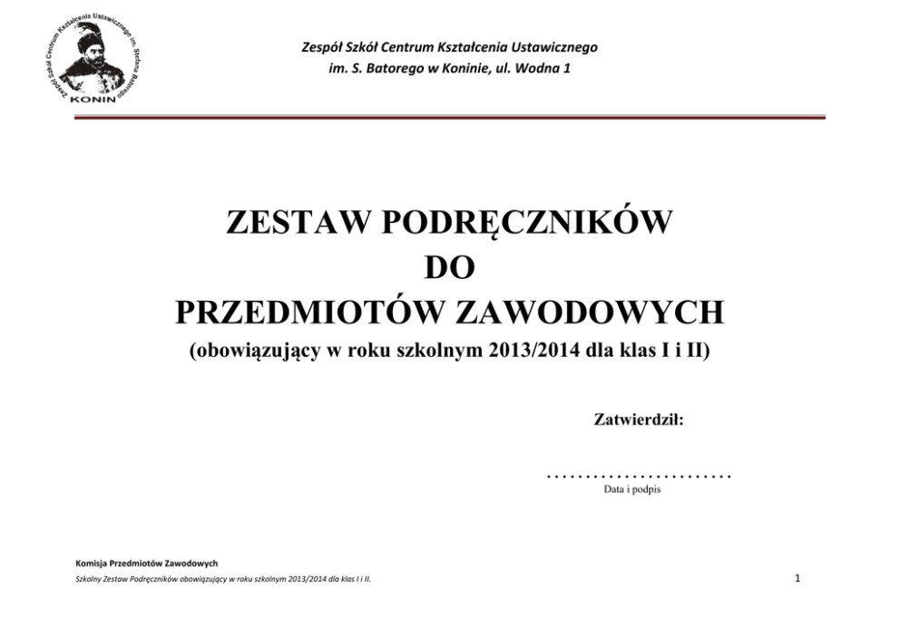Zespół Szkół Centrum Kształcenia Ustawicznego im. S. Batorego w Koninie, ul. Wodna 1 ZESTAW PODRĘCZNIKÓW DO PRZEDMIOTÓW ZAWODOWYCH (obowiązujący w roku szkolnym 2013/2014 dla klas I i II) Zatwierdził: …………………… Data i podpis Komisja Przedmiotów Zawodowych Szkolny Zestaw Podręczników obowiązujący w roku szkolnym 2013/2014 dla klas I i II. 1 Zespół Szkół Centrum Kształcenia Ustawicznego im. S. Batorego w Koninie, ul. Wodna 1 Zasadnicza Szkoła Zawodowa Zawód: sprzedawca ( Kl. I i II ) LP. 1. Przedmiot Towar jako przedmiot handlu 2. Organizacja i techniki sprzedaży Autor podręcznika Tytuł podręcznika Wydawnictwo Nr dopuszczenia D. Andrzejczak, A. Mikina, M. Wajogner Organizacja sprzedaży cz. I Towar jako przedmiot handlu WSiP D. Andrzejczak, A. Mikina, M. Wajogner, B. Rzeźnik Organizacja sprzedaży cz. II Organizacja i techniki sprzedaży Rea 16/2009 Kultura zawodu Ekonomik A. Komosa 3. Komunikacja w handlu 4. Obsługa klientów D. Andrzejczak, A. Mikina, M. Wajogner, B. Rzeźnik Sprzedaż towarów cz. I Obsługa klienta WSiP 5. Przedsiębiorca w handlu T. Gorzelany, W Aue Prowadzenie działalności gospodarczej WSiP Uwagi Komisja Przedmiotów Zawodowych Szkolny Zestaw Podręczników obowiązujący w roku szkolnym 2013/2014 dla klas I i II. 2 Zespół Szkół Centrum Kształcenia Ustawicznego im. S. Batorego w Koninie, ul. Wodna 1 Zawód: technik ekonomista – kształcenie modułowe (kl. I i II) LP. Jednostka modułowa Autor podręcznika/ pakietu edukacyjnego Tytuł podręcznika/pakietu edukacyjnego 1. M1. J1. Gospodarowanie na rynku zasobów dóbr i usług M. Kaczorowska Gospodarowanie na rynku zasobów dóbr i usług 2. M1. J2. Zarządzanie zasobami ekonomicznymi M. Kaczorowska Zarządzanie zasobami ekonomicznymi 3. M1. J3. Stosowanie przepisów prawa w prowadzeniu działalności M. Kaczorowska Stosowanie przepisów prawa w prowadzeniu działalności 4. M1. J4. Bezpieczne wykonywanie prac biurowych M2. J1. Planowanie i organizowanie działalności M2. J2. Wykonywanie prac biurowych związanych z prowadzeniem działalności gospodarczej M2. J3. Prowadzenie współpracy z otoczeniem M. Kaczorowska Bezpieczne wykonywanie prac biurowych 5. 6. 7. Wydawnictwo Nr dopuszczenia Uwagi Planowanie i organizowanie działalności M. Kaczorowska Wykonywanie prac biurowych związanych z prowadzeniem działalności gospodarczej M. Kaczorowska Prowadzenie współpracy z otoczeniem Komisja Przedmiotów Zawodowych Szkolny Zestaw Podręczników obowiązujący w roku szkolnym 2013/2014 dla klas I i II. 3 Zespół Szkół Centrum Kształcenia Ustawicznego im. S. Batorego w Koninie, ul. Wodna 1 8. 9. 10. 11. 12. M2. J4Wykorzystanie programów użytkowych wspomagających prace biurowe M2. J5. Posługiwanie się językiem obcym w konwersacji biznesowej M3. J1. Prowadzenie polityki kadrowej M3. J2. Dokumentowanie pracy i płacy M3. J1. Przygotowanie do prowadzenia ksiąg rachunkowych M. Kaczorowska Wykorzystanie programów użytkowych wspomagających prace biurowe M. Kaczorowska Posługiwanie się językiem obcym w konwersacji biznesowej M. Kaczorowska Posługiwanie się językiem obcym w konwersacji biznesowej Dokumentowanie pracy i płacy M. Kaczorowska M. Kaczorowska Przygotowanie do prowadzenia ksiąg rachunkowych Komisja Przedmiotów Zawodowych Szkolny Zestaw Podręczników obowiązujący w roku szkolnym 2013/2014 dla klas I i II. 4 Zespół Szkół Centrum Kształcenia Ustawicznego im. S. Batorego w Koninie, ul. Wodna 1 Zawód: technik handlowiec – kształcenie modułowe (kl. I i II ) LP. Jednostka modułowa Autor podręcznika/ pakietu edukacyjnego Tytuł podręcznika/pakietu edukacyjnego 1. M1.J1 Przyjmowanie dostaw A. Dolna Przyjmowanie dostaw 2. M1.J2 Magazynowanie towarów A. Dolna Magazynowanie towarów A. Dolna Prezentowanie towarów w sali sprzedażowej i witrynie sklepowej A. Dolna Zabezpieczanie towarów i obliczanie cen A. Dolna Promowanie oferty sprzedażowej A. Dolna Komunikowanie się z klientem A. Dolna Realizowanie transakcji sprzedaży A. Dolna Organizowanie firmy handlowej A. Dolna Posługiwanie się językiem obcym w prowadzeniu działalności gospodarczej 3. 4. 5. 6. 7. 8. 9. M2.J1 Prezentowanie towarów w sali sprzedażowej i witrynie sklepowej M2.J2 Zabezpieczanie towarów i obliczanie cen M3.J1Promowanie oferty sprzedażowej M3.J2 Komunikowanie się z klientem M3.J3 Realizowanie transakcji sprzedaży M4.J1 Organizowanie firmy handlowej M4.J2 Posługiwanie się językiem obcym w prowadzeniu działalności gospodarczej Wydawnictwo Nr dopuszczenia Uwagi Komisja Przedmiotów Zawodowych Szkolny Zestaw Podręczników obowiązujący w roku szkolnym 2013/2014 dla klas I i II. 5 Zespół Szkół Centrum Kształcenia Ustawicznego im. S. Batorego w Koninie, ul. Wodna 1 Zawód: technik obsługi turystycznej (kl. I i II ) LP. Przedmiot Autor podręcznika Tytuł podręcznika Wydawnictwo Nr dopuszczenia 1. Podstawy turystyki Barbara Cymańska- Garbowska, Barbara Steblik - Wlaźlak „Podstawy turystyki” REA, Warszawa 2011r. 2. Podstawy działalności gospodarczej w turystyce M.Wajgner R.Tylińska „Prowadzenie działalności gospodarczej", "Bezpieczeństwo i higiena pracy", WSiP, 2013 r. Uwagi WSiP, 2013r. 3. Geografia turystyczna Z. Kruczek Geografia turystyczna - Polska – kl. II, -Europa – kl. III - Kraje pozaeuropejskie – kl. IV REA 2009 * 4. Organizacja imprez i usług turystycznych Włodzimierz Banasik, Hanna Borne- Januła „Planowanie i kalkulacja kosztów imprez WSiP, 2013r. Zygmunt Kruczek „Obsługa ruchu turystycznego” PROKSENIA, Kraków 2011r. „Marketing usług turystycznych” Rea 2013 6. Marketing usług turystycznych Język obcy zawodowy 7. Obsługa turystyczna 8. Obsługa informatyczna w turystyce 5. turystycznych", Komisja Przedmiotów Zawodowych Szkolny Zestaw Podręczników obowiązujący w roku szkolnym 2013/2014 dla klas I i II. 6 Zespół Szkół Centrum Kształcenia Ustawicznego im. S. Batorego w Koninie, ul. Wodna 1 Za