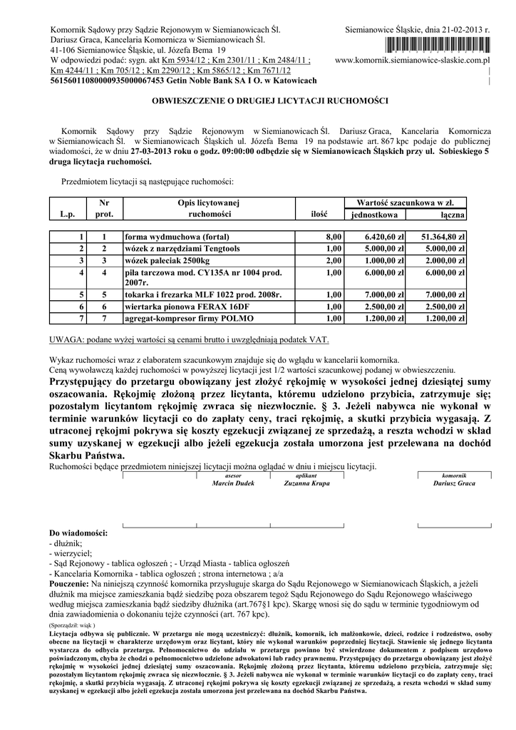 Komornik Sądowy przy Sądzie Rejonowym w Siemianowicach Śl. Dariusz Graca, Kancelaria Komornicza w Siemianowicach Śl. 41-106 Siemianowice Śląskie, ul. Józefa Bema 19 W odpowiedzi podać: sygn. akt Km 5934/12 ; Km 2301/11 ; Km 2484/11 ; Km 4244/11 ; Km 705/12 ; Km 2290/12 ; Km 5865/12 ; Km 7671/12 56156011080000935000067453 Getin Noble Bank SA I O. w Katowicach Siemianowice Śląskie, dnia 21-02-2013 r. *8013022100257* www.komornik.siemianowice-slaskie.com.pl | | OBWIESZCZENIE O DRUGIEJ LICYTACJI RUCHOMOŚCI Komornik Sądowy przy Sądzie Rejonowym w Siemianowicach Śl. Dariusz Graca, Kancelaria Komornicza w Siemianowicach Śl. w Siemianowicach Śląskich ul. Józefa Bema 19 na podstawie art. 867 kpc podaje do publicznej wiadomości, że w dniu 27-03-2013 roku o godz. 09:00:00 odbędzie się w Siemianowicach Śląskich przy ul. Sobieskiego 5 druga licytacja ruchomości. Przedmiotem licytacji są następujące ruchomości: Nr prot. L.p. 1 2 3 4 1 2 3 4 5 6 7 5 6 7 Opis licytowanej ruchomości ilość forma wydmuchowa (fortal) wózek z narzędziami Tengtools wózek paleciak 2500kg piła tarczowa mod. CY135A nr 1004 prod. 2007r. tokarka i frezarka MLF 1022 prod. 2008r. wiertarka pionowa FERAX 16DF agregat-kompresor firmy POLMO Wartość szacunkowa w zł. jednostkowa łączna 8,00 1,00 2,00 1,00 6.420,60 zł 5.000,00 zł 1.000,00 zł 6.000,00 zł 51.364,80 zł 5.000,00 zł 2.000,00 zł 6.000,00 zł 1,00 1,00 1,00 7.000,00 zł 2.500,00 zł 1.200,00 zł 7.000,00 zł 2.500,00 zł 1.200,00 zł UWAGA: podane wyżej wartości są cenami brutto i uwzględniają podatek VAT. Wykaz ruchomości wraz z elaboratem szacunkowym znajduje się do wglądu w kancelarii komornika. Ceną wywoławczą każdej ruchomości w powyższej licytacji jest 1/2 wartości szacunkowej podanej w obwieszczeniu. Przystępujący do przetargu obowiązany jest złożyć rękojmię w wysokości jednej dziesiątej sumy oszacowania. Rękojmię złożoną przez licytanta, któremu udzielono przybicia, zatrzymuje się; pozostałym licytantom rękojmię zwraca się niezwłocznie. § 3. Jeżeli nabywca nie wykonał w terminie warunków licytacji co do zapłaty ceny, traci rękojmię, a skutki przybicia wygasają. Z utraconej rękojmi pokrywa się koszty egzekucji związanej ze sprzedażą, a reszta wchodzi w skład sumy uzyskanej w egzekucji albo jeżeli egzekucja została umorzona jest przelewana na dochód Skarbu Państwa. Ruchomości będące przedmiotem niniejszej licytacji można oglądać w dniu i miejscu licytacji. asesor aplikant komornik Marcin Dudek Zuzanna Krupa Dariusz Graca Do wiadomości: - dłużnik; - wierzyciel; - Sąd Rejonowy - tablica ogłoszeń ; - Urząd Miasta - tablica ogłoszeń - Kancelaria Komornika - tablica ogłoszeń ; strona internetowa ; a/a Pouczenie: Na niniejszą czynność komornika przysługuje skarga do Sądu Rejonowego w Siemianowicach Śląskich, a jeżeli dłużnik ma miejsce zamieszkania bądź siedzibę poza obszarem tegoż Sądu Rejonowego do Sądu Rejonowego właściwego według miejsca zamieszkania bądź siedziby dłużnika (art.767§1 kpc). Skargę wnosi się do sądu w terminie tygodniowym od dnia zawiadomienia o dokonaniu tejże czynności (art. 767 kpc). (Sporządził: wiąk ) Licytacja odbywa się publicznie. W przetargu nie mogą uczestniczyć: dłużnik, komornik, ich małżonkowie, dzieci, rodzice i rodzeństwo, osoby obecne na licytacji w charakterze urzędowym oraz licytant, który nie wykonał warunków poprzedniej licytacji. Stawienie się jednego licytanta wystarcza do odbycia przetargu. Pełnomocnictwo do udziału w przetargu powinno być stwierdzone dokumentem z podpisem urzędowo poświadczonym, chyba że chodzi o pełnomocnictwo udzielone adwokatowi lub radcy prawnemu. Przystępujący do przetargu obowiązany jest złożyć rękojmię w wysokości jednej dziesiątej sumy oszacowania. Rękojmię złożoną przez licytanta, któremu udzielono przybicia, zatrzymuje się; pozostałym licytantom rękojmię zwraca się niezwłocznie. § 3. Jeżeli nabywca nie wykonał w terminie warunków licytacji co do zapłaty ceny, traci rękojmię, a skutki przybicia wygasają. Z utraconej rękojmi pokrywa się koszty egzekucji związanej ze sprzedażą, a reszta wchodzi w skład sumy uzyskanej w egzekucji albo jeżeli egzekucja została umorzona jest przelewana na dochód Skarbu Państwa.