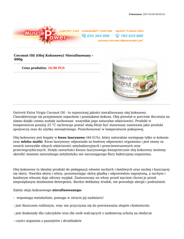 Utworzono: 2017-03-04 00:00:14 Coconut Oil (Olej Kokosowy) Nierafinowany 400g Cena produktu: 16,90 PLN Ostrovit Extra Virgin Coconut Oil - to najwyższej jakości nierafinowany olej kokosowy. Charakteryzuje się przyjemnym zapachem i posmakiem kokosa. Olej powstał w porcesie tłoczenia na zimno dzięki czemu zostały zachowane wszystkie jego naturalne właściowści. Produkt w temperaturze poniżej 25 °C zachowuje postać stałą.Może być stosowany zamiennie jako produkt spożywczy oraz do użytku zewnętrznego. Przechowywać w temperaturze pokojowej. Olej kokosowy jest bogaty w kwas laurynowy (44-51%), który naturalnie występuje tylko w kokosie oraz mleku matki. Kwas laurynowy odpowiada za budowę odporności organizmu i jest znany ze swoich niezwykle silnych właściwości antybakteryjnych i przeciwwirusowych oraz przeciwgrzybicznych. Dzięki zawartości kwasu laurynowego bezsprzecznie olej kokosowy możemy określić mianem naturalnego antybiotyku nie naruszającego flory bakteryjnej organizmu. Olej kokosowy to idealny produkt do pielęgnacji włosów suchych i łamliwych oraz suchej i łuszczącej się skóry. Nawilża skórę i włosy, pozostawiając skórę gładką i odpowiednio naprężoną, a suchym i łamliwym włosom daje zdrowy wygląd. Zastosowany na włosy przed myciem chroni je przed niepożądanym działaniem detergentu. Bardzo delikatny środek, nie powoduje alergii i podrażnień. Zalety oleju kokosowego nierafinowanego: – wspomaga metabolizm, pomaga w utracie jej nadmiaru! – jest tłuszczem roślinnym, więc nie przyczynia się do powstawania złogów cholesterolu – jest doskonały dla cukrzyków oraz dla osób walczących z nadmierną ochotą na słodycze – czyści organizm z pasożytów i drożdżaków – wzmacnia funkcje tarczycy – wykazuje silne działanie antybakteryjne i antywirusowe, nie niszczy naturalnej flory bakteryjnej (jak antybiotyki), ale jest skuteczny w zwalczaniu szkodliwych bakterii i wirusów, wspomaga nasz układ immunologiczny znacznie zwiększając odporność organizmu – zapobiega lub wspomaga leczenie wielu chorób układu pokarmowego, bardzo dobry dla zdrowia jelit – zapobiega osteoporozie – ma działanie przeciwzapalne, także przy stosowaniu zewnętrznym – wydatnie wspomaga przyswajanie witamin i mikroelementów dostarczanych w pożywieniu – chroni przed nowotworami – ujędrnia i uelastycznia skórę, po prostu odmładza – jak już widać z powyższych – jest dobry dla naszego serca – pomaga zregenerować się po wysiłku, dodaje energii! Składniki: Porcja: 25 g Porcji w opakowaniu: 16 Opakowanie: 400g Wartość odżywcza w 100g wartość energetyczna 3467 kJ / 828 Kcal tłuszcz 92 g w tym kwasy nasycone 87 g w tym kwasy jednonienasycone 4 g w tym kwasy wielonienasycone 1 g węglowodany 0g w tym cukry 0g białko 0g sól 0 mg Sposób użycia: Zaleca się stosowanie według własnego zapotrzebowania. Adres: http://www.muscle.trustnet.pl/ Telefon: 34 36 43 000, 782 010 880 Email: [email protected]