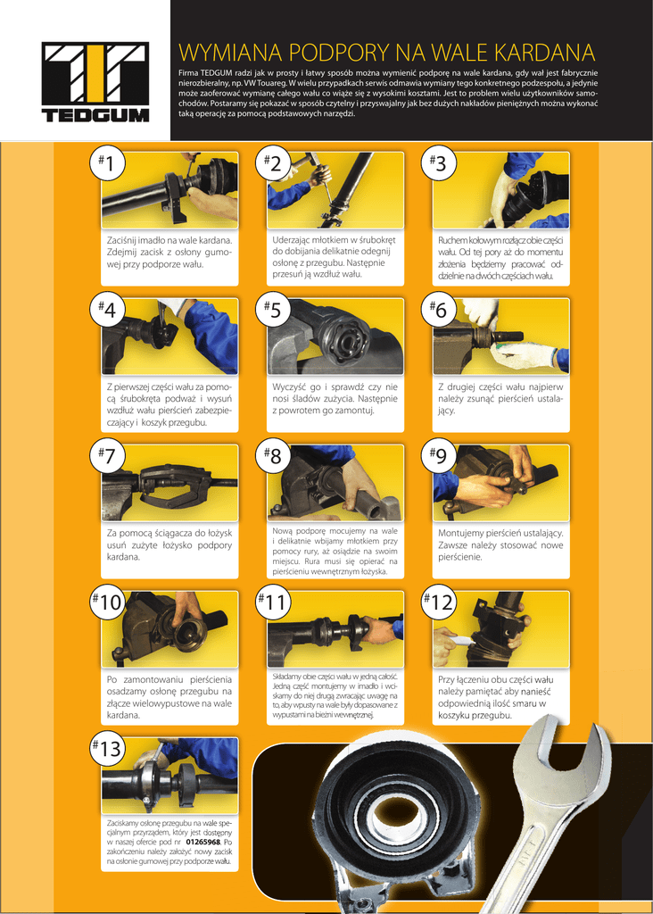 WYMIANA PODPORY NA WALE KARDANA Firma TEDGUM radzi jak w prosty i łatwy sposób można wymienić podporę na wale kardana, gdy wał jest fabrycznie nierozbieralny, np. VW Touareg. W wielu przypadkach serwis odmawia wymiany tego konkretnego podzespołu, a jedynie może zaoferować wymianę całego wału co wiąże się z wysokimi kosztami. Jest to problem wielu użytkowników samochodów. Postaramy się pokazać w sposób czytelny i przyswajalny jak bez dużych nakładów pieniężnych można wykonać taką operację za pomocą podstawowych narzędzi. 1 # 2 # Uderzając młotkiem w śrubokręt do dobijania delikatnie odegnij osłonę z przegubu. Następnie przesuń ją wzdłuż wału. Zaciśnij imadło na wale kardana. Zdejmij zacisk z osłony gumowej przy podporze wału. 4 # 5 # Z pierwszej części wału za pomocą śrubokręta podważ i wysuń wzdłuż wału pierścień zabezpieczający i koszyk przegubu. 7 # 10 Po zamontowaniu pierścienia osadzamy osłonę przegubu na złącze wielowypustowe na wale kardana. 13 # Zaciskamy osłonę przegubu na wale specjalnym przyrządem, który jest dostępny w naszej ofercie pod nr 01265968. Po zakończeniu należy założyć nowy zacisk na osłonie gumowej przy podporze wału. Ruchem kołowym rozłącz obie części wału. Od tej pory aż do momentu złożenia będziemy pracować oddzielnie na dwóch częściach wału. 6 # Wyczyść go i sprawdź czy nie nosi śladów zużycia. Następnie z powrotem go zamontuj. 8 # Z drugiej części wału najpierw należy zsunąć pierścień ustalający. 9 # Nową podporę mocujemy na wale i delikatnie wbijamy młotkiem przy pomocy rury, aż osiądzie na swoim miejscu. Rura musi się opierać na pierścieniu wewnętrznym łożyska. Za pomocą ściągacza do łożysk usuń zużyte łożysko podpory kardana. # 3 # 11 # Składamy obie części wału w jedną całość. Jedną część montujemy w imadło i wciskamy do niej drugą zwracając uwagę na to, aby wpusty na wale były dopasowane z wypustami na bieżni wewnętrznej. Montujemy pierścień ustalający. Zawsze należy stosować nowe pierścienie. 12 # Przy łączeniu obu części wału należy pamiętać aby nanieść odpowiednią ilość smaru w koszyku przegubu.