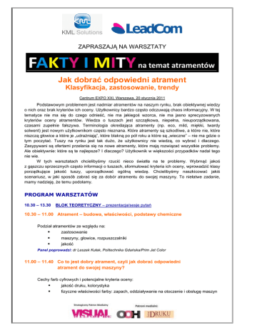ZAPRASZAJĄ NA WARSZTATY Jak dobrać odpowiedni atrament Klasyfikacja, zastosowanie, trendy Centrum EXPO XXI, Warszawa, 20 stycznia 2011 Podstawowym problemem jest nadmiar atramentów na naszym rynku, brak obiektywnej wiedzy o nich oraz brak kryteriów ich oceny. Użytkownicy bardzo często odczuwają chaos informacyjny. W tej tematyce nie ma się do czego odnieść, nie ma jakiegoś wzorca, nie ma jasno sprecyzowanych kryteriów oceny atramentów. Wiedza o tuszach jest szczątkowa, niepełna, nieuporządkowana, czasami zupełnie fałszywa. Terminologia określająca atramenty (np. eco, mild, miękki, twardy solwent) jest nowym użytkownikom często nieznana. Które atramenty są szkodliwe, a które nie, które niszczą głowice a które je „udrażniają”, które blakną po pół roku a które są „wieczne” – nie ma gdzie o tym poczytać. Tuszy na rynku jest tak dużo, że użytkownicy nie wiedzą, co wybrać i dlaczego. Zasypywani są ofertami przelania się na nowe atramenty, które mają rozwiązać wszystkie problemy. Ale obiektywnie: które są te najlepsze? I dlaczego? Użytkownik w większości przypadków nadal tego nie wie. W tych warsztatach chcielibyśmy rzucić nieco światła na te problemy. Wybrnąć jakoś z gąszczu sprzecznych często informacji o tuszach, sformułować kryteria ich oceny, wprowadzić klasy porządkujące jakość tuszy, uporządkować ogólną wiedzę. Chcielibyśmy naszkicować jakiś scenariusz, w jaki sposób zabrać się za dobór atramentu do swojej maszyny. To niełatwe zadanie, mamy nadzieję, że temu podołamy. PROGRAM WARSZTATÓW 10.30 – 13.30 BLOK TEORETYCZNY – prezentacja/sesje pytań 10.30 – 11.00 Atrament – budowa, właściwości, podstawy chemiczne Podział atramentów ze względu na: zastosowanie maszyny, głowice, rozpuszczalniki jakość Panel poprowadzi: dr Leszek Kułak, Politechnika Gdańska/Prim Jet Color 11.00 – 11.40 Co to jest dobry atrament, czyli jak dobrać odpowiedni atrament do swojej maszyny? Cechy farb cyfrowych i potencjalne kryteria oceny: jakość druku, kolorystyka fizyczne właściwości farby: zapach, oddziaływanie na otoczenie i obsługę maszyn fizyczne właściwości wydruków: odporność na ścieranie, światłoodporność, zdolność do utrwalania się na różnych podłożach cechy eksploatacyjne wynikające ze współpracy farby z maszyną cena farby a koszt druku Typowe problemy związane z atramentem. Zasady doboru farby do maszyny drukującej. Panel poprowadzi: Przemysław Kida, Profikolor 11.40 – 12.00 Przerwa na kawę 12.00 – 13.30 Analiza polskiego rynku atramentów solwentowych: eco mild hard solwent Próba usystematyzowania pojęć i wiedzy o atramentach solwentowych. Klasyfikacja atramentów ze względu na jakość oraz maszyny. Panel poprowadzą: Dariusz Świercz, Leadcom; Steve Knight, Sioen; Michael Moeller, Roland 13.30 - 14.00 Lunch 14.00 – 16.00 BLOK PRAKTYCZNY 14.00 – 15.30 Czy jesteś pewien, że znasz możliwości swojego plotera? Pokazanie różnic we właściwościach i jakości druku atramentów eco i mild solventowych w zależności od prędkości druku (drukowanie na maszynach Roland XJ640, Asbru RS64) 15.30 – 16.00 Konkurs na najciekawszą aplikację prezentacja autorów i aplikacji głosowanie rozdanie nagród 16.00 Zakończenie warsztatów Warunki uczestnictwa: 1. Rejestracji należy dokonać do dnia 10.01.2011 REJESTRUJ SIĘ TUTAJ 2. Koszt uczestnictwa: 240 zł (wpłata do 31.12.2010), 280 zł (wpłata do 10.01.2011), (podane ceny są cenami brutto) 3. Bank Millennium, Nr konta: 83 1160 2202 0000 0001 3270 3555 Dopisek do przelewów: Warsztaty 4. Cena obejmuje: udział w warsztatach, materiały szkoleniowe, lunch, przerwy kawowe 5. 20 stycznia 2011, Centrum EXPO XXI, Warszawa ul. Prądzyńskiego 12/14, Sala B DLA NASZYCH KLIENTÓW – zniżka w wysokości 25% Zgłoszenia również na adres: [email protected], [email protected] tel./fax. +48 22 8641009; 517560040.