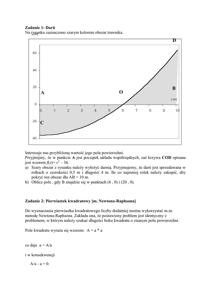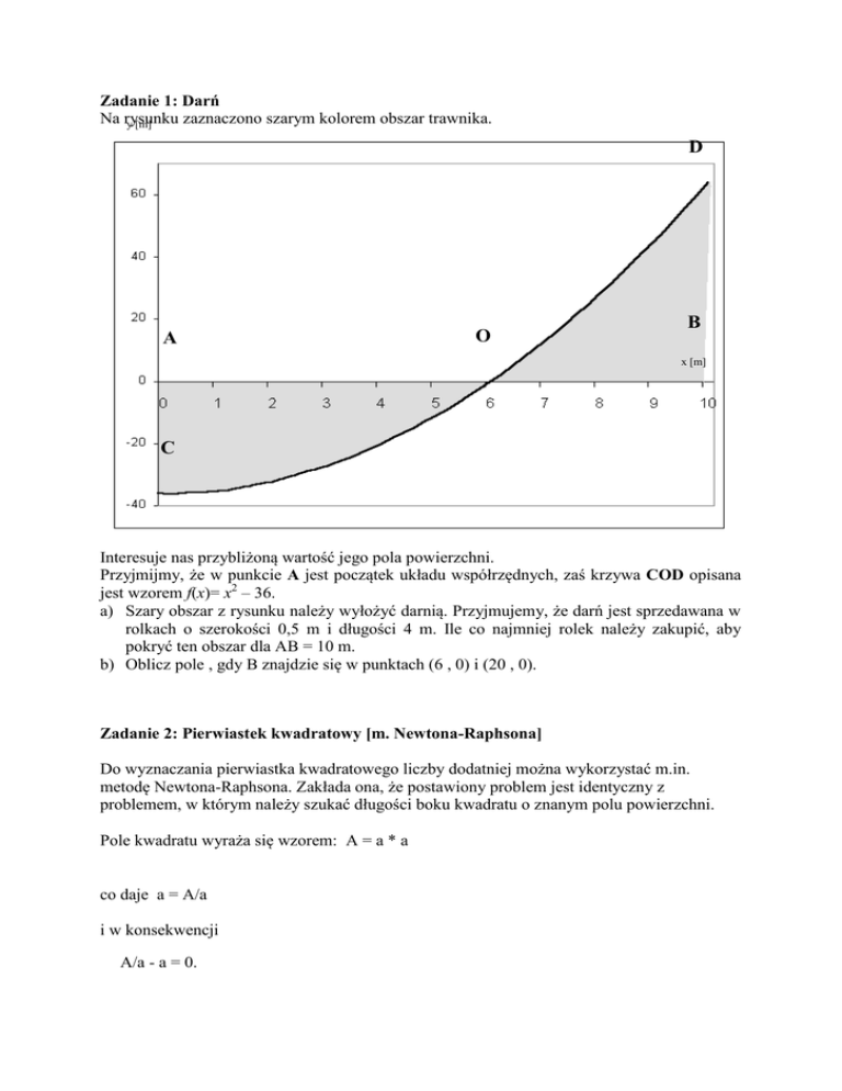 Zadanie 1: Darń Na rysunku zaznaczono szarym kolorem obszar trawnika. y [m] D A O B x [m] C Interesuje nas przybliżoną wartość jego pola powierzchni. Przyjmijmy, że w punkcie A jest początek układu współrzędnych, zaś krzywa COD opisana jest wzorem f(x)= x2 – 36. a) Szary obszar z rysunku należy wyłożyć darnią. Przyjmujemy, że darń jest sprzedawana w rolkach o szerokości 0,5 m i długości 4 m. Ile co najmniej rolek należy zakupić, aby pokryć ten obszar dla AB = 10 m. b) Oblicz pole , gdy B znajdzie się w punktach (6 , 0) i (20 , 0). Zadanie 2: Pierwiastek kwadratowy [m. Newtona-Raphsona] Do wyznaczania pierwiastka kwadratowego liczby dodatniej można wykorzystać m.in. metodę Newtona-Raphsona. Zakłada ona, że postawiony problem jest identyczny z problemem, w którym należy szukać długości boku kwadratu o znanym polu powierzchni. Pole kwadratu wyraża się wzorem: A = a * a co daje a = A/a i w konsekwencji A/a - a = 0. W ten sposób otrzymano test, który pozwala sprawdzić czy bok o długości a jest bokiem kwadratu o polu A. Na początku niech a stanie się A/2. Jeżeli ta wartość nie przejdzie testu należy wyznaczyć kolejną długość boku a. Czynność tę będziemy powtarzać aż w końcu a będzie równe A/a. Metoda NR zakłada, że kolejne przybliżenia długości a będą wyznaczane przez średnia arytmetyczną aktualnej długości boku a i długości drugiego boku A/a. Dzięki temu w każdym kroku kształt prostokąta o długościach boków a i A/a będzie coraz bardziej przypominał kwadrat. Jak już wcześniej wspomniałem przybliżenia będą trwały tak długo, jak długo A/a nie będzie równe a. W metodach numerycznych zakłada się oczekiwaną dokładność wyniku. Zazwyczaj oznacza się ją litrą ε (epsilon). Mówi ona kiedy otrzymany wynik nas satysfakcjonuje (nie potrzebny nam dokładniejszy wynik). W związku z tym w kodzie programu, który znajduje się poniżej, test A/a - a = 0 został zamieniony na |A/a - a| < eps Nowy test sprawdza czy długości dwóch boków prostokąta różnią się o wartość mniejszą niż założony błąd bezwzględny (epsion). Przykład dla liczby 9 i dokładności 0,5 a = 9/2 = 4,5, |4,5 - 2| > 0,5 a = (9/4,5 +4,5)/2 = 6,5/2 = 3,25, |3,25 - 4,5| > 0,5 a = (9/3,25 + 3,25)/2 = 3,009615, |3,009615 - 3.25| <0,5 w tym momencie różnica między poprzednim wynikiem a aktualnym mieści się w założonej dokładności. Tu przerywamy obliczenia. Naszym wynikiem jest 3,009615. Przy tak dużym błędzie jaki sobie założyłem to i tak wynik jest przyzwoity. POLECENIE: Napisz program w c++, który jako dana dostanie liczbę rzeczywista X i liczbę rzeczywistą E i zwróci wartość pierwiastka liczby X z przybliżeniem E policzony metoda N-R.