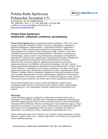 Polska Rada Społeczna Polnischer Sozialrat e.V. O ra n ie n s tr. 3 4 , D -1 0 9 9 9 B e rlin Tel. [49] 030 / 615 17 17; Fax [49] 030 / 616 59 288 e-Mail [email protected] http://www.polskarada.de Polska Rada Społeczna: działalność, statystyki, problemy, perspektywy Polska Rada Społeczna jest organizacją która powstała w 1981 roku i dziś skupia ponad 600 członków, będąc tym samym największą i najstarszą – spośród działających nieprzerwanie - organizacją Polskich migrantów w Niemczech. Celem stowarzyszenia jest pomoc migrantom z Polski oraz reprezentacja ich interesów wobec tutejszych władz. Jedynie w roku 2012 udzieliliśmy ponad 5.000 porad indywidualnych. Oferujemy również kursy niemieckiego, porady prawne i psychologiczne, pomagamy w kontaktach z niemieckimi urzędami oraz organizujemy wydarzenia kulturalne. Działalność Rady jest częściowo finansowana przez Senat Berlina (z funduszu pełnomocnika do spraw migracji), głównie jednak opiera się na pracy społecznej licznych ochotników, pochodzenia polskiego i nie tylko (pracę naszej organizacji wspierają też współpracownicy/wolontariusze z Ghany, Rosji, Turcji i Niemiec. Chciałabym w tym miejscu zaznaczyć, że wiele innych grup migrantów boryka się z problemami podobnymi do tych napotykanych przez Polaków. Dlatego istotnym aspektem działalności Rady jest wzajemna pomoc oraz wymiana doświadczeń z innymi organizacjami migrantów w Niemczech. Doświadczenia innych grup narodowych na emigracji mogą nas wiele nauczyć. Taki sposób pracy wyróżnia nas na tle wielu innych organizacji polonijnych.) Polska Rada Społeczna w ramach swojej działalności współpracuje z przedstawicielami zarówno niemieckich, jak i polskich władz, organizacjami pozarządowymi, oraz instytucjami wyższej użyteczności publicznej w obu krajach. Statystyki Liczba Polaków żyjących w Berlinie w zależności od źródeł wacha się w przedziale od 50.000 do 200.000 osób. Najczęściej pojawiającą się liczbą jest 180.000 (według obliczeń GUS na które powołuje się m.in. strona internetowa Ambasady RP w Berlinie). Różnice wynikają już z samej definicji pojęcia. (Kogo zaliczamy do Polaków? Czy są to osoby zameldowane czy faktycznie żyjące w Niemczech? Czy przyjeżdżające tylko do pracy i wracające do Polski na weekendy? Czy zaliczamy osoby z podwójnym obywatelstwem? etc.) Polacy stanowią drugą co do wielkości, po Turkach, grupę migrantów w stolicy Niemiec. Jeżeli chodzi o tzw. „nowych migrantów“ to od wielu już lat stanowimy nawet największą grupę. Bankverbindung: IBAN: DE241203000010011797; BIC: BYLADEM1001 Kim są ci „starzy” i „nowi” migranci z Polski? Tzw. stara migracja to w dużej mierze osoby które przybyły do Niemiec w latach 80-tych, często przed lub w czasie stanu wojennego. Utrzymują kontakt z krajem, jednak nie mają zamiaru wracać do Polski - przynajmniej nie przed emeryturą (typowym przykładem są tu moi rodzice, którzy wyjechali z Polski w 1981 r. z zamiarem powrotu za kilka miesięcy – „wracają” oni do Polski już od ponad 30 lat). Przeważająca większość tej grupy funkcjonuje sprawnie w niemieckim systemie społeczno-ekonomicznym. Odnaleźli się w tym kraju, nadal jednak utrzymują więź z ojczyzną; często posiadają podwójne obywatelstwo i raczej głosują w Polsce niż w Niemczech. Grupa „nowych” migrantów to osoby które wyemigrowały do Niemiec po przystąpieniu Polski do UE. Od 2004 r. pracowały w Niemczech często pół legalnie (w „szarej“ strefie prawnej jako rzekomo „samodzielni przedsiębiorcy“ tzw. Scheinselbstständige). Często nie byli świadomi swoich praw i wykonywali pracę m.in. w sektorze budowlanym za zaniżoną płacę. W maju 2011 minął tzw. okres przejściowy i Niemcy całkowicie otworzyły swój rynek pracy dla pracowników z Polski. Nie spowodowało to jednak, jak to zapowiadały niektóre niemieckie media, „zalania” Niemiec przez tanią siłę roboczą z Polski. Tak jak Polska Rada Społeczna opisała to w swoich prognozach przedstawionych władzom Berlina już w 2010 r., migracja nadal utrzymuje się na mniej więcej stałym poziomie od przystąpienia Polski do UE. Główna zmiana (na lepsze!) polega na tym, że osoby które dotychczas pracowały „na szaro“ mogą zalegalizować swoją działalność i wielu śmielej domaga się swoich praw. Dziś, dużo naszych klientów przychodzi z zapytaniem o to co się zmieniło w ich sytuacji prawnej od 2011 r. Problemy Nadal jednak nowi migranci napotykają na wiele problemów. Podstawowy błąd widzimy (tak jak Polish Express Association w Londynie) w braku przygotowania migrantów. Ludzie przyjeżdżają źle poinformowani przez znajomych, przez lokalne media, lub tzw. doradców. Przyjeżdżają z nadzieją, że „jakoś to będzie” i że tu ich siła robocza będzie, bezwarunkowo, potrzebna. Dużymi problemami są bariery językowe, brak uznania kwalifikacji oraz nieumiejętność funkcjonowania w niemieckim systemie społeczno-prawnym. W niektórych przypadkach niepowodzenia i frustracja prowadzą do uzależnień i chorób. Dużym problemem jest również bezdomność. Polska Rada Społeczna szczególnie przestrzega przed kryminalną siecią tzw. doradców, którzy obiecują (odpłatnie) załatwienie pracy. Często nie wywiązując się z obietnic lub „załatwiają“ pracę nielegalną kasując wysokie prowizje lub za nieproporcjonalnie wysokie prowizje pomagają przy wypełnianiu dokumentów urzędowych, wniosków o zasiłki dla bezrobotnych czy świadczenia na dzieci. (Np. niektórzy z tzw. doradców za założenie firmy w Niemczech pobierają kwoty powyżej 1.000 Euro. Złożenie wniosku o założenie firmy w Niemczech we właściwym urzędzie kosztuje faktycznie 26 Euro. Polska Rada Społeczna, tak jak inne instytucje w Berlinie, oferuje poza tym kursy przygotowawcze na temat założenia i prowadzenia samodzielnej działalno