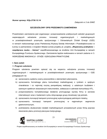 Numer sprawy: KZp.2730.12.14 Załącznik nr 2 do SIWZ SZCZEGÓŁOWY OPIS PRZEDMIOTU ZAMÓWIENIA Przedmiotem zamówienia jest organizacja i przeprowadzenie praktycznych szkoleń grupowych wspierających wdrażanie procesu innowacji organizacyjnych i marketingowych w przedsiębiorstwach przemysłu spożywczego i Odnawialnych Źródeł Energii (OZE) w ramach realizowanego przez Państwową Wyższą Szkołę Informatyki i Przedsiębiorczości w Łomży w partnerstwie z Urzędem Miasta Łomża projektu pt. projektu „Wspieramy praktyków – współpraca nauka – biznes” współfinansowanego ze środków Unii Europejskiej w ramach Europejskiego Funduszu Społecznego. Zamówienie będzie realizowane w ramach zadania nr 3. WDROŻENIE INNOWACJI - STAŻE I SZKOLENIA PRAKTYCZNE I. Opis zadań 1. Program szkolenia Program szkolenia powinien opierać się na wsparciu wdrażania procesu innowacji organizacyjnych i marketingowych w przedsiębiorstwach przemysłu spożywczego i OZE polegających na: a) opracowaniu systemu oceny pracowników z elementami planowania, b) opracowaniu formalnego planu komunikacji marketingowej z rynkiem o spójnym charakterze i co najmniej roczną perspektywą realizacji, z ustalonym budżetem i szerszym spektrum stosowanych instrumentów, zwłaszcza w zakresie komunikacji ATL, c) przeprowadzeniu kompleksowego działania promującego wyroby firmy w serwisie internetowym wraz z badaniami rynku dotyczącego grupy docelowej i jej potrzeb, d) opracowaniu koncepcji kampanii promocyjnej wykorzystującej patriotyzm lokalny, e) opracowaniu koncepcji kampanii promocyjnej w regionalnym segmencie gastronomicznym, f) podniesieniu skuteczności działań marketingowych prowadzonych przez firmę poprzez stworzenie planu promocji pieczywa tradycyjnego, 23 Projekt współfinansowany ze środków Unii Europejskiej w ramach Europejskiego Funduszu Społecznego g) wprowadzeniu do struktury organizacyjnej laboratorium akredytowanego badania wody, h) opracowaniu strategii rozwoju firmy w zakresie pozycji konkurencyjnej przedsiębiorstwa na rynku wraz z propozycją dalszego rozwoju. i) Wdrożenie systemu CRM (Customer Relationship Management) jako innowacji w budowaniu relacji z partnerami rynkowymi (klientami). 2. Harmonogram i organizacja szkoleń a) Wymagany termin wykonania zamówienia do 30 września 2014 r. b) Szkolenia będą obywać się w terminach ustalonych między Zamawiającym i Wykonawcą, który złoży najkorzystniejszą ofertę. c) Liczba godzin dydaktycznych wynosi 16 godziny na uczestnika szkolenia. d) Zajęcia w trakcie szkoleń będą odbywać się w czasie dwóch kolejno następujących po sobie dni tygodnia. Pierwszego dnia szkolenie rozpocznie się nie wcześniej niż o godzinie 10.00. Drugiego dnia szkolenie zakończy się nie później niż o godzinie 16.00. e) Wykonawca zapewni każdego dnia szkolenia co najmniej dwie przerwy kawowe po min. 10 minut oraz przerwę obiadową trwającą maksymalnie 45 minut. f) Harmonogram szkoleń zostanie zatwierdzony przez Zamawiającego niezwłocznie po zawarciu umowy. g) Szkolenie będzie prowadzone w formie wykładów i warsztatów. Warsztaty powinny zostać przeprowadzone z zastosowaniem co najmniej 2 technik szkoleniowych- studium przypadku, gry symulacyjne, zaproponowanych przez Wykonawcę w szczegółowym programie szkoleń. 3. Grupa docelowa a) Uczestnikami szkoleń będą pracownicy przedsiębiorstw spożywczych i OZE. b) W ramach zamówienia Wykonawca przeszkoli łącznie 50 osób c) Szkolenia będą realizowane w 5 grupach szkoleniowych po 10 uczestników. d) Wykonawca zapewni możliwość uczestniczenia w szkoleniach pracownikom Zamawiającego, którzy mogą monitorować przebieg szkoleń. e) Lista uczestników szkolenia zostanie przekazana Wykonawcy przez Zamawiającego. 24 Projekt współfinansowany ze środków Unii Europejskiej w ramach Europejskiego Funduszu Społecznego 4. Miejsce przeprowadzenia szkoleń a) Szkolenia będą odbywać się w obiektach zlokalizowanych na terenie Województwa Podlaskiego lub Warmińsko-Mazurskiego, w odległości nie przekraczającej 160 km od Miasta Łomża. b) Szkolenia będą prowadzone w obiektach hotelowych o standardzie co najmniej 3gwiazdkowym w rozumieniu przepisów §2 ust. 2 pkt. 1 Rozporządzenia Ministra Gospodarki i Pracy z dnia 19 sierpnia 2004 r. w sprawie obiektów hotelarskich i innych obiektów, w których są świadczone usługi hotelarskie (Dz. U. Nr 188 z 2004 r., poz. 1945) lub w ośrodku konferencyjno-szkoleniowym odpowiadającym standardem hotelowi kategorii co najmniej 3gwazdkowego. c) Na terenie obiektu powinna być czynna kawiarnia, bar. d) Na terenie obiektu powinny być miejsca parkingowe dla uczestników, trenerów i osób monitorujących szkolenia. e) Sale szkoleniowe muszą spełniać odpowiednie warunki lokalowe, w tym powinny być: • miejsce dla co najmniej 12 osób w ustawieniu stołów w podkowę z oddzielnym stolikiem dla trenera/trenerów, • klimatyzacja, • dzienne oświetlenie, • dostęp do Internetu, • wyposażenie w media audio-wizualne (tj. projektor multimedialny, ekran, laptop, tablica flip-chart z markerami), • f) zaplecze sanitarne. W ramach usługi powinny zostać zapewnione usług żywienia zgodnie z Ustawą z dnia 25 sierpnia 2006 r. o bezpieczeństwie żywności i żywienia (Dz. U. z 2006 r., Nr 171, poz. 1225 z póź. zm.): • w całodziennym jadłospisie powinny zostać uwzględnione produkty ze wszystkich grup spożywczych; • posiłki powinny być wykonane z naturalnych produktów, metodą tradycyjną bez użycia produktów typu instant lub produktów gotowych; 25 Projekt współfinansowany ze środków Unii Europejskiej w ramach Europejskiego Funduszu Społecznego • Wykonawca zapewni wyżywienie dla wszystkich uczestników szkoleń oraz trenerów każdego dnia szkolenia obejmujące: o przerwa kawowa: kawa, herbata z dodatkami typu śmietanka lub mleko do kawy oraz cytryna, woda mineralna, soki owocowe, mix ciastek 