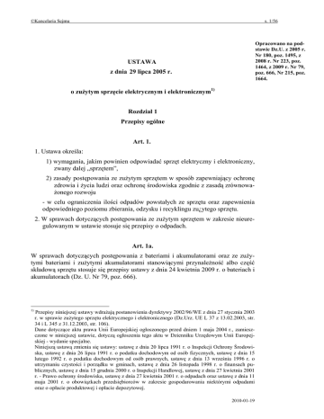 ©Kancelaria Sejmu s. 1/56 Opracowano na podstawie Dz.U. z 2005 r. Nr 180, poz. 1495, z 2008 r. Nr 223, poz. 1464, z 2009 r. Nr 79, poz. 666, Nr 215, poz. 1664. USTAWA z dnia 29 lipca 2005 r. o zużytym sprzęcie elektrycznym i elektronicznym1) Rozdział 1 Przepisy ogólne Art. 1. 1. Ustawa określa: 1) wymagania, jakim powinien odpowiadać sprzęt elektryczny i elektroniczny, zwany dalej „sprzętem”, 2) zasady postępowania ze zużytym sprzętem w sposób zapewniający ochronę zdrowia i życia ludzi oraz ochronę środowiska zgodnie z zasadą zrównoważonego rozwoju - w celu ograniczenia ilości odpadów powstałych ze sprzętu oraz zapewnienia odpowiedniego poziomu zbierania, odzysku i recyklingu zu¿ytego sprzętu. 2. W sprawach dotyczących postępowania ze zużytym sprzętem w zakresie nieuregulowanym w ustawie stosuje się przepisy o odpadach. Art. 1a. W sprawach dotyczących postępowania z bateriami i akumulatorami oraz ze zużytymi bateriami i zużytymi akumulatorami stanowiącymi przynależność albo część składową sprzętu stosuje się przepisy ustawy z dnia 24 kwietnia 2009 r. o bateriach i akumulatorach (Dz. U. Nr 79, poz. 666). 1) Przepisy niniejszej ustawy wdrażają postanowienia dyrektywy 2002/96/WE z dnia 27 stycznia 2003 r. w sprawie zużytego sprzętu elektrycznego i elektronicznego (Dz.Urz. UE L 37 z 13.02.2003, str. 34 i L 345 z 31.12.2003, str. 106). Dane dotyczące aktu prawa Unii Europejskiej ogłoszonego przed dniem 1 maja 2004 r., zamieszczone w niniejszej ustawie, dotyczą ogłoszenia tego aktu w Dzienniku Urzędowym Unii Europejskiej - wydanie specjalne. Niniejszą ustawą zmienia się ustawy: ustawę z dnia 20 lipca 1991 r. o Inspekcji Ochrony Środowiska, ustawę z dnia 26 lipca 1991 r. o podatku dochodowym od osób fizycznych, ustawę z dnia 15 lutego 1992 r. o podatku dochodowym od osób prawnych, ustawę z dnia 13 września 1996 r. o utrzymaniu czystości i porządku w gminach, ustawę z dnia 26 listopada 1998 r. o finansach publicznych, ustawę z dnia 15 grudnia 2000 r. o Inspekcji Handlowej, ustawę z dnia 27 kwietnia 2001 r. - Prawo ochrony środowiska, ustawę z dnia 27 kwietnia 2001 r. o odpadach oraz ustawę z dnia 11 maja 2001 r. o obowiązkach przedsiębiorców w zakresie gospodarowania niektórymi odpadami oraz o opłacie produktowej i opłacie depozytowej. 2010-01-19 ©Kancelaria Sejmu s. 2/56 Art. 2. 1. Przepisy ustawy stosuje się do: 1) sprzętu wprowadzonego do obrotu na terytorium kraju; 2) zużytego sprzętu. 2. Przepisy art. 7-14, art. 23, art. 24, art. 26, art. 27 i art. 29 dotyczące wprowadzającego sprzęt stosuje się odpowiednio do przedsiębiorcy prowadzącego sprzedaż sprzętu przy wykorzystaniu środków porozumiewania się na odległość, o których mowa w art. 6 ustawy z dnia 2 marca 2000 r. o ochronie niektórych praw konsumentów oraz o odpowiedzialności za szkodę wyrządzoną przez produkt niebezpieczny (Dz. U. Nr 22, poz. 271, z późn. zm.2)), z terytorium kraju do państwa członkowskiego Unii Europejskiej innego niż Rzeczpospolita Polska lub do państwa członkowskiego Europejskiego Porozumienia o Wolnym Handlu (EFTA) - strony umowy o Europejskim Obszarze Gospodarczym. 3. Przepisów ustawy nie stosuje się do: 1) sprzętu służącego ochronie bezpieczeństwa Rzeczypospolitej Polskiej, jeżeli ten sprzęt jest przeznaczony wyłącznie do celów wojskowych; 2) odpadów promieniotwórczych w rozumieniu przepisów ustawy z dnia 29 listopada 2000 r. – Prawo atomowe (Dz. U. z 2004 r. Nr 161, poz. 1689 i Nr 173, poz. 1808); 3) sprzętu będącego częścią składową urządzenia, które nie jest sprzętem w rozumieniu przepisów ustawy. Art. 3. 1. Użyte w ustawie określenia oznaczają: 1) decyzje związane z gospodarką odpadami – decyzje, o których mowa w art. 17 ust. 1 pkt 1 i ust. 2, art. 26 ust. 1 i art. 28 ust. 1 ustawy z dnia 27 kwietnia 2001 r. o odpadach (Dz. U. Nr 62, poz. 628, z późn. zm.3)), w art. 181 ust. 1 pkt 1 ustawy z dnia 27 kwietnia 2001 r. – Prawo ochrony środowiska (Dz. U. Nr 62, poz. 627, z późn. zm.4)) oraz w art. 7 ust. 1 pkt 1 ustawy z 2) Zmiany wymienionej ustawy zostały ogłoszone w Dz. U. z 2002 r. Nr 144, poz. 1204, z 2003 r. Nr 84, poz. 774 i Nr 188, poz. 1837, z 2004 r. Nr 96, poz. 959 i Nr 116, poz. 1204, z 2005 r. Nr 122, poz. 1021 oraz z 2008 r. Nr 171, poz. 1056. 3) Zmiany wymienionej ustawy zostały ogłoszone w Dz. U. z 2002 r. Nr 41, poz. 365, Nr 113, poz. 984 i Nr 199, poz. 1671, z 2003 r. Nr 7, poz. 78, z 2004 r. Nr 96, poz. 959, Nr 116, poz. 1208 i Nr 191, poz. 1956 oraz z 2005 r. Nr 25, poz. 202, Nr 90, poz. 758, Nr 130, poz. 1087 i Nr 175, poz. 1458 i 1462. 4) Zmiany wymienionej ustawy zostały ogłoszone w Dz. U. z 2001 r. Nr 115, poz. 1229, z 2002 r. Nr 74, poz. 676, Nr 113, poz. 984, Nr 153, poz. 1271 i Nr 233, poz. 1957, z 2003 r. Nr 46, poz. 392, Nr 80, poz. 717 i 721, Nr 162, poz. 1568, Nr 175, poz. 1693, Nr 190, poz. 1865 i Nr 217, poz. 2124, z 2004 r. Nr 19, poz. 177, Nr 49, poz. 464, Nr 70, poz. 631, Nr 91, poz. 875, Nr 92, poz. 880, Nr 96, poz. 959, Nr 121, poz. 1263, Nr 273, poz. 2703 i Nr 281, poz. 2784 oraz z 2005 r. Nr 25, poz. 202, Nr 62, poz. 552, Nr 113, poz. 954, Nr 130, poz. 1087, Nr 132, poz. 1110, Nr 163, poz. 1362, Nr 167, poz. 1399, Nr 169, poz. 1420 i Nr 175, poz. 1458 i 1462. 2010-01-19 ©Kancelaria Sejmu s. 3/56 dnia 13 września 1996 r. o utrzymaniu czystości i porządku w gminach (Dz. U. Nr 132, poz. 622, z późn. zm.5)); 2) import – przywóz sprzętu z terytorium państwa niebędącego państwem członkowskim Unii Europejskiej lub państwem członkowskim Europejskiego Porozumienia o Wolnym Handlu (EFTA) - stroną umowy o Europejskim Obszarze Gospodarczym w celu wprowadzenia do obrotu; 3) odzysk – odzysk w rozumieniu art. 3 ust. 3 pkt 9 ustawy z dnia 27 kwietnia 2001 r. o odpadach; 4) ponowne użycie – u¿ycie zużytego sprzętu lub jego części składowych w tym samym celu, dla jakiego były zaprojektowane i wykon