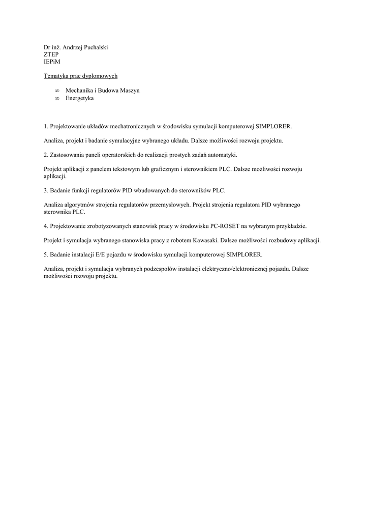 Dr inż. Andrzej Puchalski ZTEP IEPiM Tematyka prac dyplomowych • • Mechanika i Budowa Maszyn Energetyka 1. Projektowanie układów mechatronicznych w środowisku symulacji komputerowej SIMPLORER. Analiza, projekt i badanie symulacyjne wybranego układu. Dalsze możliwości rozwoju projektu. 2. Zastosowania paneli operatorskich do realizacji prostych zadań automatyki. Projekt aplikacji z panelem tekstowym lub graficznym i sterownikiem PLC. Dalsze możliwości rozwoju aplikacji. 3. Badanie funkcji regulatorów PID wbudowanych do sterowników PLC. Analiza algorytmów strojenia regulatorów przemysłowych. Projekt strojenia regulatora PID wybranego sterownika PLC. 4. Projektowanie zrobotyzowanych stanowisk pracy w środowisku PC-ROSET na wybranym przykładzie. Projekt i symulacja wybranego stanowiska pracy z robotem Kawasaki. Dalsze możliwości rozbudowy aplikacji. 5. Badanie instalacji E/E pojazdu w środowisku symulacji komputerowej SIMPLORER. Analiza, projekt i symulacja wybranych podzespołów instalacji elektryczno/elektronicznej pojazdu. Dalsze możliwości rozwoju projektu.