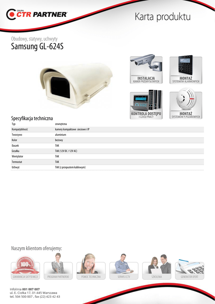 Obudowy, statywy, uchwyty Samsung GL-624S INSTALACJA KAMER PRZEMYSŁOWYCH KONTROLA DOSTĘPU I CZASU PRACY Specyfikacja techniczna Typ zewnętrzna Kompatybilność kamery kompaktowe sieciowe i IP Tworzywo aluminium Kolor beżowy Daszek TAK Grzałka TAK (12V DC / 12V AC) Wentylator TAK Termostat TAK Uchwyt TAK (z przepustem kablowym) MONTAŻ SYSTEMÓW ALARMOWYCH MONTAŻ SYSTEMÓW P.POŻAROWYCH Naszym klientom oferujemy: GWARANCJA SATYSFAKCJI PROGRAM PARTNERSKI POMOC TECHNICZNA SERWIS CCTV SZKOLENIA GENERATOR OFERT
