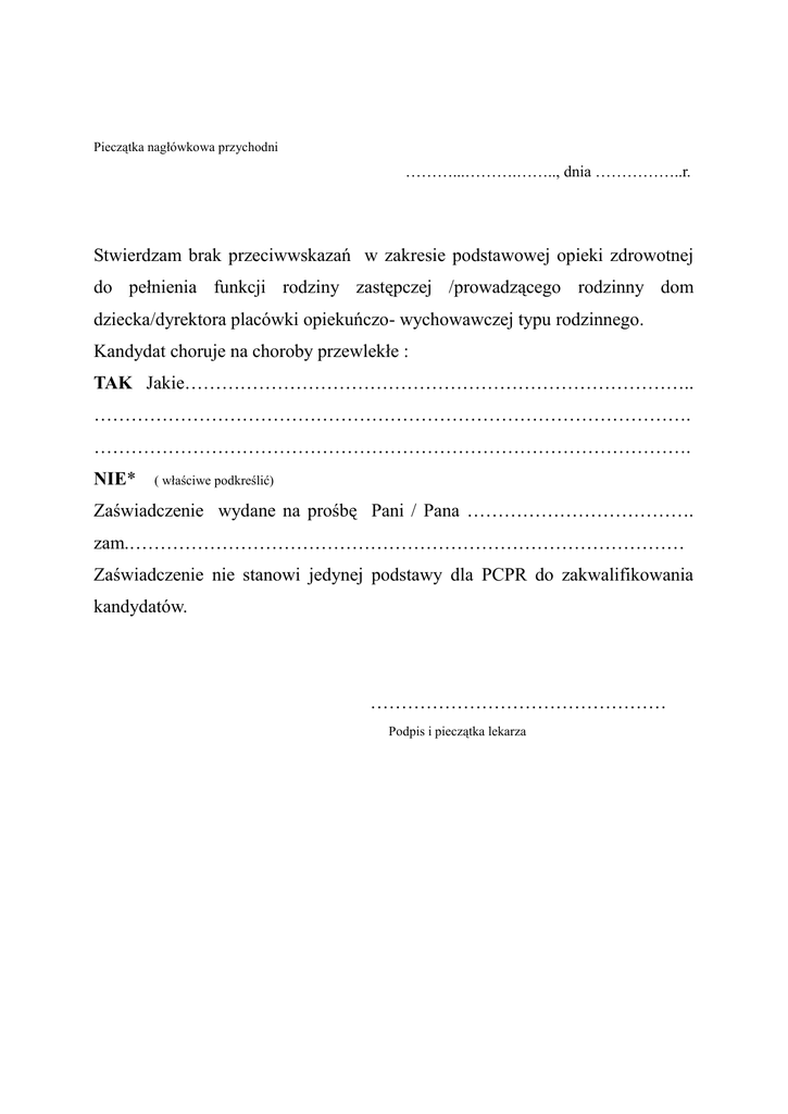 Pieczątka nagłówkowa przychodni ………...……….…….., dnia ……………..r. Stwierdzam brak przeciwwskazań w zakresie podstawowej opieki zdrowotnej do pełnienia funkcji rodziny zastępczej /prowadzącego rodzinny dom dziecka/dyrektora placówki opiekuńczo- wychowawczej typu rodzinnego. Kandydat choruje na choroby przewlekłe : TAK Jakie……………………………………………………………………….. ……………………………………………………………………………………. ……………………………………………………………………………………. NIE* ( właściwe podkreślić) Zaświadczenie wydane na prośbę Pani / Pana ………………………………. zam.……………………………………………………………………………… Zaświadczenie nie stanowi jedynej podstawy dla PCPR do zakwalifikowania kandydatów. ………………………………………… Podpis i pieczątka lekarza