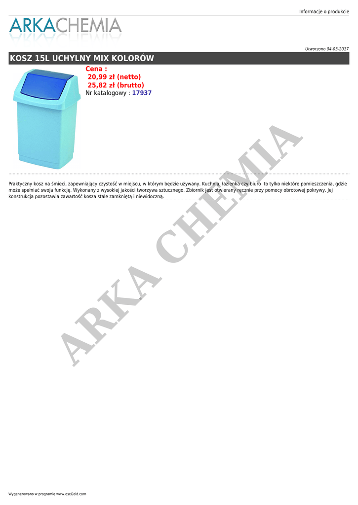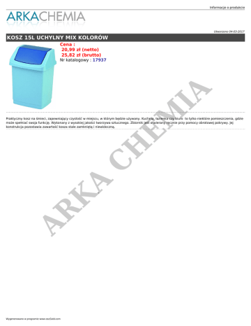Informacje o produkcie Utworzono 04-03-2017 KOSZ 15L UCHYLNY MIX KOLORÓW Cena : 20,99 zł (netto) 25,82 zł (brutto) H EM IA Nr katalogowy : 17937 AR K A C Praktyczny kosz na śmieci, zapewniający czystość w miejscu, w którym będzie używany. Kuchnia, łazienka czy biuro to tylko niektóre pomieszczenia, gdzie może spełniać swoja funkcję. Wykonany z wysokiej jakości tworzywa sztucznego. Zbiornik jest otwierany ręcznie przy pomocy obrotowej pokrywy. Jej konstrukcja pozostawia zawartość kosza stale zamkniętą i niewidoczną. Wygenerowano w programie www.oscGold.com