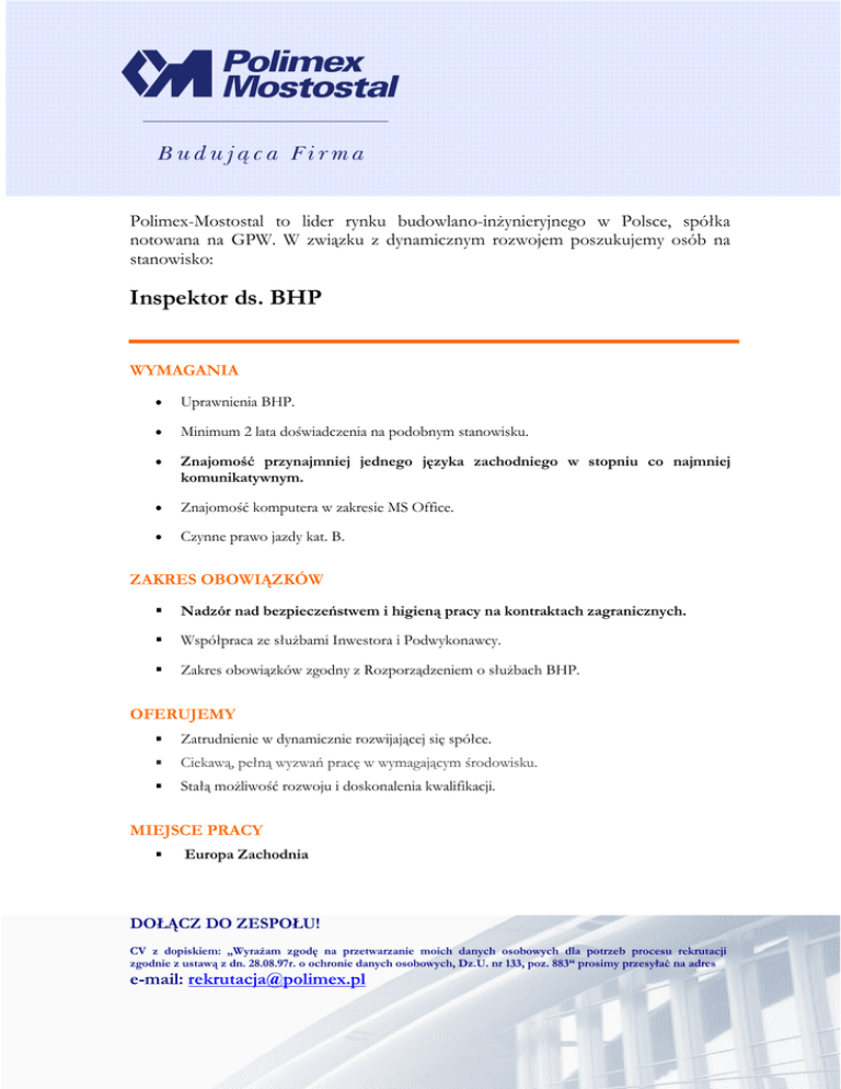 Polimex-Mostostal to lider rynku budowlano-inŜynieryjnego w Polsce, spółka notowana na GPW. W związku z dynamicznym rozwojem poszukujemy osób na stanowisko: Inspektor ds. BHP WYMAGANIA • Uprawnienia BHP. • Minimum 2 lata doświadczenia na podobnym stanowisku. • Znajomość przynajmniej jednego języka zachodniego w stopniu co najmniej komunikatywnym. • Znajomość komputera w zakresie MS Office. • Czynne prawo jazdy kat. B. ZAKRES OBOWIĄZKÓW Nadzór nad bezpieczeństwem i higieną pracy na kontraktach zagranicznych. Współpraca ze słuŜbami Inwestora i Podwykonawcy. Zakres obowiązków zgodny z Rozporządzeniem o słuŜbach BHP. OFERUJEMY Zatrudnienie w dynamicznie rozwijającej się spółce. Ciekawą, pełną wyzwań pracę w wymagającym środowisku. Stałą moŜliwość rozwoju i doskonalenia kwalifikacji. MIEJSCE PRACY Europa Zachodnia DOŁĄCZ DO ZESPOŁU! CV z dopiskiem: „WyraŜam zgodę na przetwarzanie moich danych osobowych dla potrzeb procesu rekrutacji zgodnie z ustawą z dn. 28.08.97r. o ochronie danych osobowych, Dz.U. nr 133, poz. 883“ prosimy przesyłać na adres e-mail: [email protected]