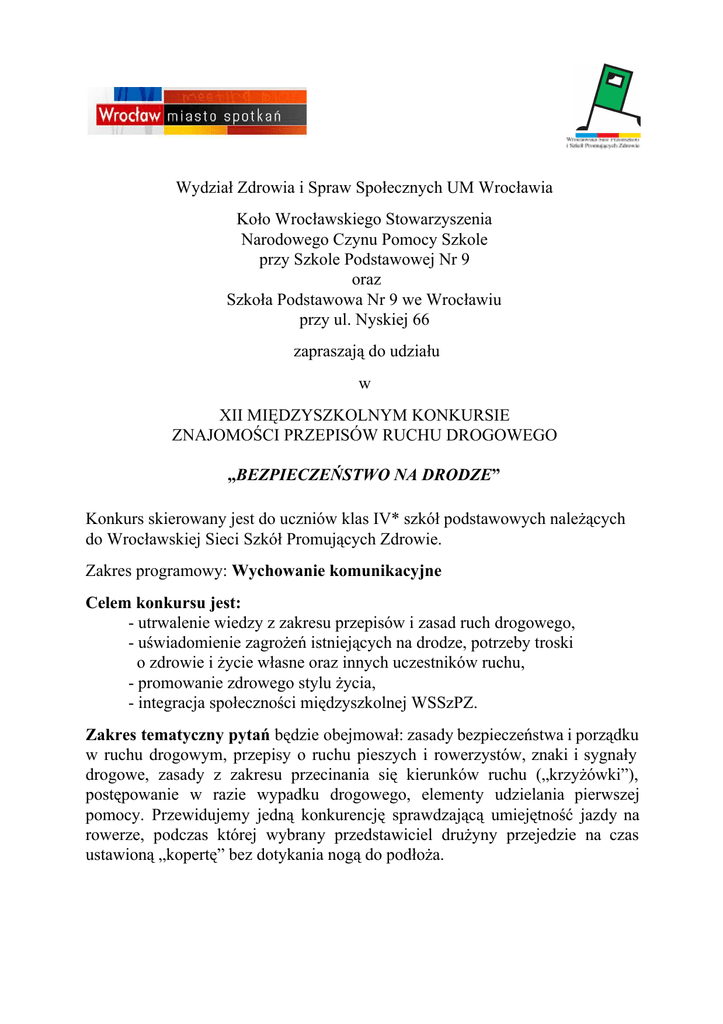 Wydział Zdrowia i Spraw Społecznych UM Wrocławia Koło Wrocławskiego Stowarzyszenia Narodowego Czynu Pomocy Szkole przy Szkole Podstawowej Nr 9 oraz Szkoła Podstawowa Nr 9 we Wrocławiu przy ul. Nyskiej 66 zapraszają do udziału w XII MIĘDZYSZKOLNYM KONKURSIE ZNAJOMOŚCI PRZEPISÓW RUCHU DROGOWEGO „ BEZPIECZEŃSTWO NA DRODZE ” Konkurs skierowany jest do uczniów klas IV* szkół podstawowych należących do Wrocławskiej Sieci Szkół Promujących Zdrowie. Zakres programowy: Wychowanie komunikacyjne Celem konkursu jest: utrwalenie wiedzy z zakresu przepisów i zasad ruch drogowego, uświadomienie zagrożeń istniejących na drodze, potrzeby troski o zdrowie i życie własne oraz innych uczestników ruchu, promowanie zdrowego stylu życia, integracja społeczności międzyszkolnej WSSzPZ. Zakres tematyczny pytań będzie obejmował: zasady bezpieczeństwa i porządku w ruchu drogowym, przepisy o ruchu pieszych i rowerzystów, znaki i sygnały drogowe, zasady z zakresu przecinania się kierunków ruchu („krzyżówki”), postępowanie w razie wypadku drogowego, elementy udzielania pierwszej pomocy. Przewidujemy jedną konkurencję sprawdzającą umiejętność jazdy na rowerze, podczas której wybrany przedstawiciel drużyny przejedzie na czas ustawioną „kopertę” bez dotykania nogą do podłoża. * Organizator zastrzega sobie prawo dopuszczenia do konkursu uczniów klas piątych, ale tylko z tych szkół, gdzie program wychowania komunikacyjnego faktycznie realizowany jest na tym poziomie. W w/w przypadkach obowiązuje pisemne potwierdzenie dyrektora szkoły dostarczone w dniu konkursu. 00 00 Konkurs odbędzie się 21 maja 2016r . (sobota), godz. 10 – 13 , w Szkole Podstawowej Nr 9 przy ul. Nyskiej 66 we Wrocławiu. Zgłoszenia do udziału w konkursie będą przyjmowane do 13 maja 2016 drogą elektroniczną: [email protected] . Zgłoszenie powinno zawierać imiona i nazwiska uczestników (3osobowej drużyny) oraz opiekuna. Jedna szkoła może zgłosić tylko jedną drużynę. Forma konkursu: I etap (eliminacje) – pisemna, II etap (finał) – ustna, pisemna, sportowo – zabawowa. Eliminacje przeprowadzone będą w formie pisemnej – test sprawdzający wiedzę z zakresu przepisów ruchu drogowego oraz umiejętności prawidłowego zachowania się w ruchu ulicznym, w szczególności podczas jazdy na rowerze. Indywidualne punkty zdobyte w I etapie, w części pisemnej będą sumowane. Drużyny, które zdobędą najwięcej punktów przejdą do drugiego etapu (finału), w którym odpowiadać będą na wylosowane pytania, rozwiązywać krzyżówki oraz brać udział w prostych konkurencjach zabawowo – sportowych sprawdzających umiejętność jazdy na rowerze. Jeżeli drużyna nie odpowie na pytanie lub poda błędną odpowiedź, wówczas pozostałe drużyny mogą odpowiadać na to pytanie, zdobywając dodatkowe punkty. W przypadku jednakowej liczby punktów zdobytych przez drużyny przeprowadzona zostanie dodatkowa konkurencja polegająca na rozwiązaniu rebusu, krzyżówki….. W skład komisji konkursowej będą wchodzili przedstawiciele: Wydziału Zdrowia i Spraw Społecznych Urzędu Miejskiego, Wydziału Ruchu Drogowego Komendy Wojewódzkiej Policji, Straży Miejskiej, Powiatowej Stacji Sanitarno – Epidemiologicznej. NAGRODY – członkowie drużyn, które zdobędą I, II, III miejsce otrzymają dyplomy oraz nagrody rzeczowe ufundowane przez Wydział Zdrowia Urzędu Miejskiego Wrocławia. Dla wszystkich uczniów zostaną przygotowane dyplomy uczestnictwa oraz akcesoria rowerowe. Informacji na temat konkursu udziela Beata Rudzka – tel. 507 180 272