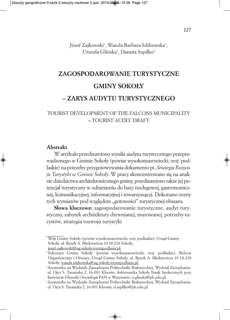 Zeszyty geograficzne 9 seria 5:zeszyty naukowe 2.qxd 2014-06-08 14:26 Page 127 127 Józef Zajkowski1, Wanda Barbara Idźkowska2, Urszula Glińska3, Danuta Szpilko4 ZAGOSPODAROWANIE TURYSTYCZNE GMINY SOKOŁY – ZARYS AUDYTU TURYSTYCZNEGO TOURIST DEVELOPMENT OF THE FALCONS MUNICIPALITY – TOURIST AUDIT. DRAFT Abstrakt W artykule przedstawiono wyniki audytu turystycznego przeprowadzonego w Gminie Sokoły (powiat wysokomazowiecki, woj. podlaskie) na potrzeby przygotowywania dokumentu pt. Strategia Rozwoju Turystyki w Gminie Sokoły. W pracy skoncentrowano się na analizie dziedzictwa architektonicznego gminy, przedstawiono także jej potencjał turystyczny w odniesieniu do bazy noclegowej, gastronomicznej, komunikacyjnej, informacyjnej i towarzyszącej. Dokonano oceny tych wymiarów pod względem „gotowości” turystycznej obszaru. Słowa kluczowe: zagospodarowanie turystyczne, audyt turystyczny, zabytek architektury drewnianej, murowanej, potrzeby turystów, strategia rozwoju turystyki 1 Wójt Gminy Sokoły (powiat wysokomazowiecki, woj. podlaskie); Urząd Gminy Sokoły, ul. Rynek A. Mickiewicza 10 18-218 Sokoły; [email protected]. 2 Sekretarz Gminy Sokoły (powiat wysokomazowiecki, woj. podlaskie), Referat Organizacyjny i Oświaty; Urząd Gminy Sokoły, ul. Rynek A. Mickiewicza 10 18-218 Sokoły; [email protected]. 3 Asystentka na Wydziale Zarządzania Politechniki Białostockiej, Wydział Zarządzania, ul. Ojca S. Tarasiuka 2, 16-001 Kleosin; doktorantka Szkoły Nauk Społecznych przy Instytucie Filozofii i Socjologii PAN w Warszawie; [email protected]. 4 Asystentka na Wydziale Zarządzania Politechniki Białostockiej, Wydział Zarządzania, ul. Ojca S. Tarasiuka 2, 16-001 Kleosin; [email protected]. Zeszyty geograficzne 9 seria 5:zeszyty naukowe 2.qxd 2014-06-08 14:26 Page 128 128 Abstract The paper presents the results of a tourist audit that has been conducted in the Falcons Municipality (wysokomazowiecki district, podlaskie voivodship) for the preparation of the document entitled Tourism Development Strategy for the Falcons Municipality. The work focuses on the architectural heritage of the community, it also presents the potential for tourism in relation to accommodation, catering, communications, and related information. The paper assesses these dimensions in terms of tourist “readiness” of the area. Key words: tourist management, tourist audit, monument of wooden and brick architecture, tourists’ needs, tourism development strategy. Wstęp Jednym z ważniejszych czynników kształtujących wielkość i strukturę ruchu turystycznego na danym obszarze jest stan środowiska przyrodniczego. Miejsca charakteryzujące się wyjątkową różnorodnością świata przyrody żywej i nieożywionej, zmiennością krajobrazu, historią i występującymi obiektami związanymi z historyczną działalnością człowieka, bardzo często są podświadomie uzmysławianym gwarantem udanego wyjazdu turystycznego. Jednakże nie tylko stan środowiska naturalnego oraz kulturowo-historycznego, ich wielkość czy stopień ochrony, ale również infrastruktura turystyczna decydują o możliwości rozwoju funkcji turystycznej danego obszaru. Celem niniejszego artykułu jest rozpoznanie i ocena zagospodarowania turystycznego obszaru gminy Sokoły w powiecie wysokomazowieckim (woj. podlaskie). Przesłanką do podjęcia tych badań była praca nad Strategią rozwoju turystycznego gminy Sokoły. Główną metodą zrealizowanych badań był audyt turystyczny, a następnie sondaż diagnostyczny dokonany z wykorzystaniem kwestionariusza ankiety, przeprowadzony wśród turystów odwiedzających gminę Sokoły w miesiącach lipiec–wrzesień 2012 r. Należy nadmienić, że artykuł w swojej głównej części dotyczy wyników audytu turystycz- Zeszyty geograficzne 9 seria 5:zeszyty naukowe 2.qxd 2014-06-08 14:26 Page 129 129 nego, za pomocą którego podjęto próbę oceny potencjału i „gotowości” turystycznej gminy. Ogólna charakterystyka gminy Sokoły5 Gmina Sokoły położona jest na Wysoczyźnie Wysokomazowieckiej oraz w granicach Doliny Górnej Narwi w obrębie Zielonych Płuc Polski. O jej atrakcyjności turystycznej w znacznym stopniu decyduje stan środowiska przyrodniczego – bagienno-rzeczny charakter, który uznawany jest za najciekawszy w Europie. Administracyjnie gmina Sokoły jest zlokalizowana w powiecie wysokomazowieckim, w województwie podlaskim. Zajmuje obszar 15 557 ha, a jej sieć osadnicza składa się 49 sołectw, zamieszkałych przez ok. 6 tys. osób. Oprócz dominującego w gminie sektora rolniczego, jej mieszkańcy znajdują zatrudnienie w oświacie, administracji samorządowej, handlu i usługach. Do głównych zakładów produkcyjnych i usługowych należą: Gminna Spółdzielnia „Samopomoc Chłopska”, Spółdzielnia Kółek Rolniczych, Bank Spółdzielczy, Stacja Doświadczalna Oceny Odmian w Krzyżewie oraz Niepubliczny Zakład Pielęgnacyjno-Opiekuńczy „Podlasie” w Dworakach-Staśkach. Na terenie gminy funkcjonują trzy szkoły podstawowe, Zespół Szkół w Sokołach (obejmujący punkt przedszkolny, szkołę podstawową i gimnazjum) oraz Zespół Szkół Rolniczych w Krzyżewie. Na uwagę zasługuje fakt, iż w gminie kompleksową opieką objęte są osoby niepełnosprawne. Od 2006 r. w Starych Raciborach funkcjonują bowiem Warsztaty Terapii Zajęciowej, a od roku 2009 w Perkach Karpiach działa Ośrodek Rehabilitacyjno-EdukacyjnoWychowawczy dla dzieci i młodzieży w wieku 3-25 lat. Na potencjał edukacyjno-kulturalny Gminy Sokoły, ważny z punktu widzenia rozwoju turystyki, składa się także Gminny Ośrodek Kultury w Sokołach (dysponujący salami konferencyjnymi, wyposażony 5 Podrozdział powstał na podstawie informacji zawartych w publikacjach: Dobroński A. Cz., Czajkowska J., Grabowska M. (red.), Sokoły na Podlasiu, Sokoły 2011; Gmina Sokoły – folder informacyjny, Kwidzyn 2011; W centrum polskiej Amazonii – gmina Sokoły zaprasza – fo