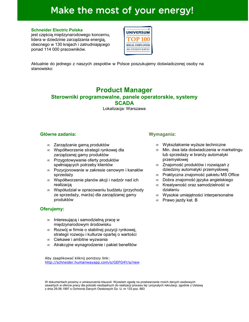 Make the most of your energy! Schneider Electric Polska jest częścią międzynarodowego koncernu, lidera w dziedzinie zarządzania energią, obecnego w 130 krajach i zatrudniającego ponad 114 000 pracowników. Aktualnie do jednego z naszych zespołów w Polsce poszukujemy doświadczonej osoby na stanowisko: Product Manager Sterowniki programowalne, panele operatorskie, systemy SCADA Lokalizacja: Warszawa Główne zadania: • • • • • • Zarządzanie gamą produktów Współtworzenie strategii rynkowej dla zarządzanej gamy produktów Przygotowywanie oferty produktów spełniających potrzeby klientów Pozycjonowanie w zakresie cenowym i kanałów sprzedaży Współtworzenie planów akcji i nadzór nad ich realizacją Współudział w opracowaniu budżetu (przychody ze sprzedaży, marża) dla zarządzanej gamy produktów Wymagania: • • • • • • • • Wykształcenie wyższe techniczne Min. dwa lata doświadczenia w marketingu lub sprzedaży w branży automatyki przemysłowej Znajomość produktów i rozwiązań z dziedziny automatyki przemysłowej Praktyczna znajomość pakietu MS Office Dobra znajomość języka angielskiego Kreatywność oraz samodzielność w działaniu Wysokie umiejętności interpersonalne Prawo jazdy kat. B Oferujemy: • • • • Interesującą i samodzielną pracę w międzynarodowym środowisku Rozwój w firmie o stabilnej pozycji rynkowej, strategii rozwoju i kulturze opartej o wartości Ciekawe i ambitne wyzwania Atrakcyjne wynagrodzenie i pakiet benefitów Aby zaaplikować kliknij poniższy link: http://schneider.humanwayapp.com/o/GEFG4Y/a/new W dokumentach prosimy o umieszczenie klauzuli: Wyrażam zgodę na przetwarzanie moich danych osobowych zawartych w ofercie pracy dla potrzeb niezbędnych do realizacji procesu tej i przyszłych rekrutacji, zgodnie z Ustawą z dnia 29.08.1997 o Ochronie Danych Osobowych Dz. U. nr 133 poz. 883