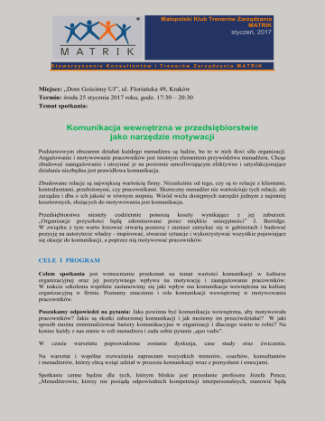 Małopolski Klub Trenerów Zarządzania MATRIK styczeń, 2017 Stow arz yszenie Konsultantów i Trenerów Zarządzania MATRIK Miejsce: „Dom Gościnny UJ”, ul. Floriańska 49, Kraków Termin: środa 25 stycznia 2017 roku, godz. 17:30 – 20:30 Temat spotkania: Komunikacja wewnętrzna w przedsiębiorstwie jako narzędzie motywacji Podstawowym obszarem działań każdego menadżera są ludzie, bo to w nich tkwi siła organizacji. Angażowanie i motywowanie pracowników jest istotnym elementem przywództwa menadżera. Chcąc zbudować zaangażowanie i utrzymać je na poziomie umożliwiającym efektywne i satysfakcjonujące działania niezbędna jest prawidłowa komunikacja. Zbudowane relacje są największą wartością firmy. Niezależnie od tego, czy są to relacje z klientami, kontrahentami, przełożonymi, czy pracownikami. Skuteczny menadżer nie wartościuje tych relacji, ale zarządza i dba o ich jakość w równym stopniu. Wśród wielu dostępnych narzędzi jednym z najmniej kosztownych, służących do motywowania jest komunikacja. Przedsiębiorstwa niestety codziennie ponoszą koszty wynikające z jej zaburzeń. „Organizacje przyszłości będą zdominowane przez miękkie umiejętności” J. Berridge. W związku z tym warto kreować otwartą postawę i zamiast zamykać się w gabinetach i budować pozycję na autorytecie władzy - inspirować, stwarzać sytuacje i wykorzystywać wszystkie pojawiające się okazje do komunikacji, a poprzez nią motywować pracowników. CELE I PROGRAM Celem spotkania jest wzmocnienie przekonań na temat wartości komunikacji w kulturze organizacyjnej oraz jej pozytywnego wpływu na motywację i zaangażowanie pracowników. W trakcie szkolenia wspólnie zastanowimy się jaki wpływ ma komunikacja wewnętrzna na kulturę organizacyjną w firmie. Poznamy znaczenie i role komunikacji wewnętrznej w motywowaniu pracowników. Poszukamy odpowiedzi na pytania: Jaka powinna być komunikacja wewnętrzna, aby motywowała pracowników? Jakie są skutki zaburzonej komunikacji i jak możemy im przeciwdziałać? W jaki sposób można zminimalizować bariery komunikacyjne w organizacji i dlaczego warto to robić? Na koniec każdy z nas stanie w roli menadżera i zada sobie pytanie „quo vadis”. W czasie warsztatu poprowadzona zostanie dyskusja, case study oraz ćwiczenia. Na warsztat i wspólne rozważania zapraszam wszystkich trenerów, coachów, konsultantów i menadżerów, którzy chcą wziąć udział w procesie komunikacji wraz z pomysłami i emocjami. Spotkanie cenne będzie dla tych, którym bliskie jest przesłanie profesora Józefa Penca; „Menedżerowie, którzy nie posiądą odpowiednich kompetencji interpersonalnych, stanowić będą hamulec postępu, a drogę transformacji uczynią długą i wyboistą, zaś zarządzane przez nich firmy nie spełnią oczekiwań organizacji XXI wieku.” Uwaga: Szkolenie zaprojektowane zostało w oparciu o warsztat prowadzony w 2015 roku, w Spytkowicach. Niektóre treści mogą się powtarzać, jednak zmieniona została forma warsztatu. Powstało coś nowego, dzięki czemu mogę zaprosić również tych z Was, którzy uczestniczyli w tamtym szkoleniu. TRENER: Aleksandra STANKOVIĆ Trener i konsultant zarządzania, doradca personalny. Posiada Międzynarodowy Certyfikat Trenera Zarządzania w zakresie treningu, uczenia się i rozwoju. Jest absolwentką Szkoły Trenerów Zarządzania MATRIK, Polsko - angielskiej Szkoły Trenerów Młodzieżowych Instytutu Edukacji Społecznej oraz Szkoły Mentorów Collegium Wratislaviense. Z wykształcenia – pedagog, szkolenia prowadzi od 2009 roku. Członek Stowarzyszenia Konsultantów i Trenerów Zarządzania MATRIK oraz Stowarzyszenia Mentorów PROMENTOR, sympatyk Małopolskiego Klubu Trenerów. Obszary jej działalności to: rozwój kompetencji menadżerskich, przywództwo i kształtowanie postawy lidera, budowanie efektywnych zespołów pracowniczych, komunikacja wewnętrzna, refleksja i decyzyjność menadżera. Doradztwo organizacyjne, warsztaty strategiczne, zarządzanie przez wartości, facylitacja, wsparcie w procesie planowania i wdrażania zmian, zarządzanie wiedzą, wdrażanie procesów mentoringowych. Kompetencje interpersonalne i podnoszące efektywność osobistą oraz planowanie rozwoju zawodowego. Spędziła ponad 1100 godzin prowadząc szkolenia, warsztaty, indywidualne sesje doradcze i kursy zawodowe. Przeprowadzała szkolenia dla małych i dużych przedsiębiorstw oraz administracji publicznej. Pomaga uczestnikom szkoleń tworzyć ich wizję przyszłości, odkryć potencjał i drzemiące w nich siły, wydobyć energię niezbędną do realizacji celów. Wspiera, bo czuje się odpowiedzialna za rozwój oraz postępy swoich podopiecznych, bo lubi oswajać ludzi i tworzyć więzy. Prywatnie: Kocha podróże, a Bałkany to jej druga ojczyzna. Uwielbia pracę z ludźmi i uczenie się w grupie. Zapraszam, Piotr Wiroński Koordynator Małopolskiego KTZM