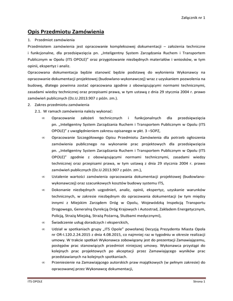 Załącznik nr 1 Opis Przedmiotu Zamówienia 1. Przedmiot zamówienia Przedmiotem zamówienia jest opracowanie kompleksowej dokumentacji – założenia techniczne i funkcjonalne, dla przedsięwzięcia pn. „Inteligentny System Zarządzania Ruchem i Transportem Publicznym w Opolu (ITS OPOLE)” oraz przygotowanie niezbędnych materiałów i wniosków, w tym opinii, ekspertyz i analiz. Opracowana dokumentacja będzie stanowić będzie podstawę do wyłonienia Wykonawcy na opracowanie dokumentacji projektowej (budowlano-wykonawczej) wraz z uzyskaniem pozwolenia na budowę, dlatego powinna zostać opracowana zgodnie z obowiązującymi normami technicznymi, zasadami wiedzy technicznej oraz przepisami prawa, w tym ustawą z dnia 29 stycznia 2004 r. prawo zamówień publicznych (Dz.U.2013.907 z późn. zm.). 2. Zakres przedmiotu zamówienia 2.1. W ramach zamówienia należy wykonać: • Opracowanie założeń technicznych i funkcjonalnych dla przedsięwzięcia pn. „Inteligentny System Zarządzania Ruchem i Transportem Publicznym w Opolu (ITS OPOLE)” z uwzględnieniem zakresu opisanego w pkt. 3 –SOPZ, • Opracowanie Szczegółowego Opisu Przedmiotu Zamówienia dla potrzeb ogłoszenia zamówienia publicznego na wykonanie prac projektowych dla przedsięwzięcia pn. „Inteligentny System Zarządzania Ruchem i Transportem Publicznym w Opolu (ITS OPOLE)” zgodnie z obowiązującymi normami technicznymi, zasadami wiedzy technicznej oraz przepisami prawa, w tym ustawą z dnia 29 stycznia 2004 r. prawo zamówień publicznych (Dz.U.2013.907 z późn. zm.), • Ustalenie wartości zamówienia opracowania dokumentacji projektowej (budowlanowykonawczej) oraz szacunkowych kosztów budowy systemu ITS, • Dokonanie niezbędnych uzgodnień, analiz, opinii, ekspertyz, uzyskanie warunków technicznych, w zakresie niezbędnym do opracowania dokumentacji (w tym między innymi z Miejskim Zarządem Dróg w Opolu, Wojewódzką Inspekcją Transportu Drogowego, Generalną Dyrekcją Dróg Krajowych i Autostrad, Zakładem Energetycznym, Policją, Strażą Miejską, Strażą Pożarną, Służbami medycznymi), • Świadczenie usług doradczych i eksperckich, • Udział w spotkaniach grupy „ITS Opole” powołanej Decyzją Prezydenta Miasta Opola nr OR-I.120.2.24.2015 z dnia 4.08.2015, co najmniej raz w tygodniu w okresie realizacji umowy. W trakcie spotkań Wykonawca zobowiązany jest do prezentacji Zamawiającemu, postępów prac stanowiących przedmiot niniejszej umowy. Wykonawca przystąpi do kolejnych prac projektowych po akceptacji przez Zamawiającego wyników prac przedstawianych na kolejnych spotkaniach. Przeniesienie na Zamawiającego autorskich praw majątkowych (w pełnym zakresie) do • opracowanej przez Wykonawcę dokumentacji, ITS OPOLE Strona 1 3. Szczegółowy opis przedmiotu zamówienia Przedmiotem niniejszego zamówienia jest opracowanie kompleksowej dokumentacji – założenia techniczne i funkcjonalne, dla przedsięwzięcia pn. „Inteligentny System Zarządzania Ruchem i Transportem Publicznym w Opolu (ITS OPOLE)” oraz przygotowania niezbędnych materiałów i wniosków, w tym opinii, ekspertyz i analiz. Inteligentny System Zarządzania Ruchem (ang. ITS) dla miasta Opola to poprawa funkcjonowania systemu transportu publicznego w Opolu poprzez usprawnienie komunikacji publicznej (dostęp do informacji, zwiększenie mobilności), zwiększenie płynności ruchu (ograniczenie korków i zarządzanie miejscami postojowymi), ochrona infrastruktury drogowej przed ruchem ciężkim i pojazdami przeładowanymi, a także poprawa stanu środowiska naturalnego oraz poprawa bezpieczeństwa ruchu drogowego. 3.1. Zakres prac obejmuje w szczególności: • Inwentaryzację stanu istniejącego na terenie miasta Opola w zakresie: − infrastruktury drogowej, − infrastruktury oświetlenia ulicznego, − ochrony środowiska, − transportu miejskiej komunikacji zbiorowej, − bezpieczeństwa publicznego, − infrastruktury telekomunikacyjnej. • Opracowanie założeń technicznych i funkcjonalnych dla systemu ITS (architektura systemu przedstawiona w Załączniku nr 2), w którego zakres wchodzi: − zarządzanie ruchem drogowym, − zarządzanie transportem zbiorowym, − usługi informacyjne dla podróżnych − bezpieczeństwo publiczne, − oświetlenie miasta, − zarządzanie danymi i telekomunikacja. 3.2. Architektura systemu W ramach projektowanego systemu ITS planuje się wykorzystanie architektury przedstawionej w Załącznik nr 2. Przyjęta architektura systemu ITS opiera się na Europejskiej Ramowej Architekturze ITS FRAME, jako bazy do projektowania i implementowania inteligentnych systemów transportowych, kompatybilnej z Krajowym Systemem Zarządzania Ruchem realizowanym przez GDDKiA. 4. Wymagania formalne: 4.1. Referencje: W celu wykazania potwierdzenia spełnienia warunku Wykonawca winien wykazać, iż w okresie ostatnich 3 lat przed upływem terminu składania ofert w niniejszym postępowaniu, a jeżeli okres prowadzenia działalności jest krótszy - w tym okresie, wykonał co najmniej: a) 1 zamówienie polegające na opracowaniu założeń technicznych i funkcjonalnych systemu centralnego sterowania i monitorowania ruchu drogowego (Inteligentny System Transportu) dla miasta powyżej 100 tys. mieszkańców b) 1 zamówienie, którego przedmiotem było opracowanie dokumentacji przetargowej, w tym PFU zgodnej z obowiązującymi przepisami PZP dla postępowania ITS OPOLE Strona 2 przetargowego obejmującego przedsięwzięcie budowlano - informatyczne, obejmujące co najmniej następujące zakresy: prace elektryczne, teletechniczne, informatyczne, ogólnobudowlane o wartości przedsięwzięcia powyżej 1 mln zł brutto. 4.2. Osoby: W celu potwierdzenia spełnienia warunku Wykonawca wykaże dysponowanie osobą/osobami, która będzie/będą uczestniczyć w wykonywaniu zamówienia: c) Kierownik zespołu projektowego- spełniający minimalne wymagania: − wykształcenie wyższe techniczne,