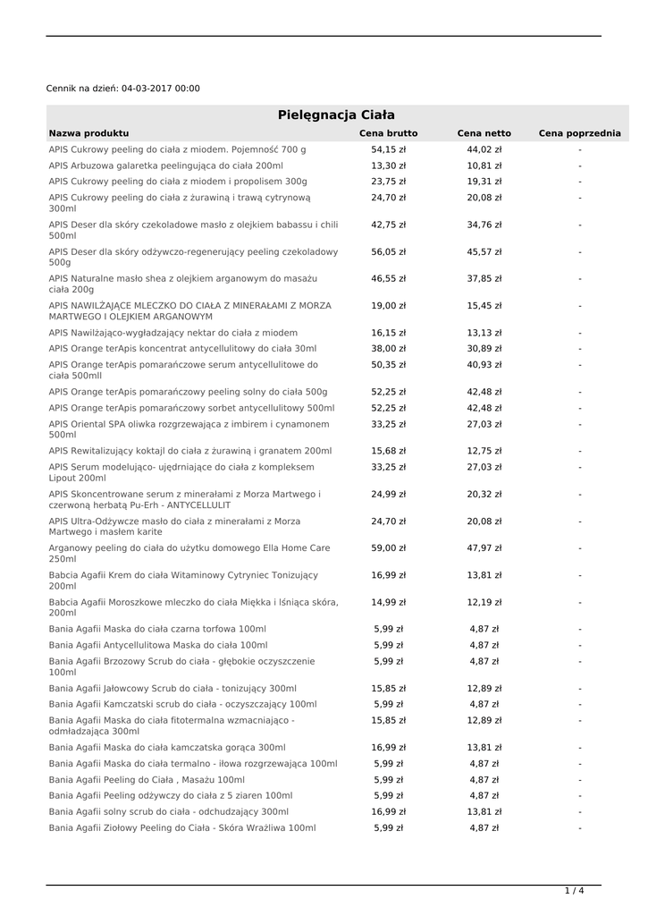 Cennik na dzień: 04-03-2017 00:00 Pielęgnacja Ciała Nazwa produktu Cena brutto Cena netto Cena poprzednia APIS Cukrowy peeling do ciała z miodem. Pojemność 700 g 54,15 zł 44,02 zł - APIS Arbuzowa galaretka peelingująca do ciała 200ml 13,30 zł 10,81 zł - APIS Cukrowy peeling do ciała z miodem i propolisem 300g 23,75 zł 19,31 zł - APIS Cukrowy peeling do ciała z żurawiną i trawą cytrynową 300ml 24,70 zł 20,08 zł - APIS Deser dla skóry czekoladowe masło z olejkiem babassu i chili 500ml 42,75 zł 34,76 zł - APIS Deser dla skóry odżywczo-regenerujący peeling czekoladowy 500g 56,05 zł 45,57 zł - APIS Naturalne masło shea z olejkiem arganowym do masażu ciała 200g 46,55 zł 37,85 zł - APIS NAWILŻAJĄCE MLECZKO DO CIAŁA Z MINERAŁAMI Z MORZA MARTWEGO I OLEJKIEM ARGANOWYM 19,00 zł 15,45 zł - APIS Nawilżająco-wygładzający nektar do ciała z miodem 16,15 zł 13,13 zł - APIS Orange terApis koncentrat antycellulitowy do ciała 30ml 38,00 zł 30,89 zł - APIS Orange terApis pomarańczowe serum antycellulitowe do ciała 500mll 50,35 zł 40,93 zł - APIS Orange terApis pomarańczowy peeling solny do ciała 500g 52,25 zł 42,48 zł - APIS Orange terApis pomarańczowy sorbet antycellulitowy 500ml 52,25 zł 42,48 zł - APIS Oriental SPA oliwka rozgrzewająca z imbirem i cynamonem 500ml 33,25 zł 27,03 zł - APIS Rewitalizujący koktajl do ciała z żurawiną i granatem 200ml 15,68 zł 12,75 zł - APIS Serum modelująco- ujędrniające do ciała z kompleksem Lipout 200ml 33,25 zł 27,03 zł - APIS Skoncentrowane serum z minerałami z Morza Martwego i czerwoną herbatą Pu-Erh - ANTYCELLULIT 24,99 zł 20,32 zł - APIS Ultra-Odżywcze masło do ciała z minerałami z Morza Martwego i masłem karite 24,70 zł 20,08 zł - Arganowy peeling do ciała do użytku domowego Ella Home Care 250ml 59,00 zł 47,97 zł - Babcia Agafii Krem do ciała Witaminowy Cytryniec Tonizujący 200ml 16,99 zł 13,81 zł - Babcia Agafii Moroszkowe mleczko do ciała Miękka i lśniąca skóra, 200ml 14,99 zł 12,19 zł - Bania Agafii Maska do ciała czarna torfowa 100ml 5,99 zł 4,87 zł - Bania Agafii Antycellulitowa Maska do ciała 100ml 5,99 zł 4,87 zł - Bania Agafii Brzozowy Scrub do ciała - głębokie oczyszczenie 100ml 5,99 zł 4,87 zł - 15,85 zł 12,89 zł - 5,99 zł 4,87 zł - Bania Agafii Maska do ciała fitotermalna wzmacniająco odmładzająca 300ml 15,85 zł 12,89 zł - Bania Agafii Maska do ciała kamczatska gorąca 300ml 16,99 zł 13,81 zł - Bania Agafii Maska do ciała termalno - iłowa rozgrzewająca 100ml 5,99 zł 4,87 zł - Bania Agafii Peeling do Ciała , Masażu 100ml 5,99 zł 4,87 zł - Bania Agafii Peeling odżywczy do ciała z 5 ziaren 100ml 5,99 zł 4,87 zł - Bania Agafii solny scrub do ciała - odchudzający 300ml 16,99 zł 13,81 zł - 5,99 zł 4,87 zł - Bania Agafii Jałowcowy Scrub do ciała - tonizujący 300ml Bania Agafii Kamczatski scrub do ciała - oczyszczający 100ml Bania Agafii Ziołowy Peeling do Ciała - Skóra Wrażliwa 100ml 1/4 Bielenda 2w1 Antycellulitowy koncentrat do ciała z forskoliną indyjską 44,10 zł 35,85 zł - Bielenda 2w1 Antycellulitowy peeling enzymatyczny do ciała z forskoliną indyjską 50,40 zł 40,98 zł - Bielenda 2w1 Arbuzowy koncentrat do ciała 450ml 44,10 zł 35,85 zł - Bielenda 2w1 Czekoladowy koncentrat do ciała 450ml 44,10 zł 35,85 zł - Bielenda 2w1 Enzymatyczny peeling drobnoziarnisty do twarzy z papainą i bromelainą 36,90 zł 30,00 zł - Bielenda 2w1 MALINOWY KONCENTRAT DO CIAŁA Z BIO-KOFEINĄ Z GUARANY 450ml 44,10 zł 35,85 zł - 107,10 zł 87,07 zł - Bielenda Antycellulitowe serum do ciała z forskoliną indyjską 175ml 21,60 zł 17,56 zł - Bielenda Antycellulitowy balsam Ultra ujędrniający do ciała 39,60 zł 32,20 zł - Bielenda Antycellulitowy peeling Ultra ujędrniający do ciała 550g 50,40 zł 40,98 zł - Bielenda arbuzowa maska żelowa do ciała 600 ml 53,10 zł 43,17 zł - Bielenda Arbuzowy balsam do ciała z pompką 500ml 39,60 zł 32,20 zł - Bielenda Arbuzowy peeling do ciała 600g 50,40 zł 40,98 zł - Bielenda Balsam do ciała z czerwonym winem 500ml 39,60 zł 32,20 zł - Bielenda Cukrowy peeling do ciała 600 g 50,40 zł 40,98 zł - Bielenda Czekoladowa maska do ciała z l-karnityną 55,80 zł 45,37 zł - Bielenda Czekoladowy balsam do ciała z l-karnityną 39,60 zł 32,20 zł - BIelenda Krem RF do zabiegów z falami radiowymi 500ml 53,10 zł 43,17 zł - Bielenda Luksusowa oliwka do masażu ciała 500ml 21,60 zł 17,56 zł - Bielenda MALINOWA MASKA DO CIAŁA Z BIO-KOFEINĄ Z GUARANY 600g 55,80 zł 45,37 zł - Bielenda Malinowe serum do ciała z bio-kofeiną z guarany 21,60 zł 17,56 zł - Bielenda MALINOWY PEELING DO CIAŁA Z BIO-KOFEINĄ Z GUARANY 550g 50,40 zł 40,98 zł - Bielenda Modelująca maska do ciała z forskoliną indyjską 55,80 zł 45,37 zł 65,00 zł Bielenda Modelujący balsam do ciała z forskoliną indyjską 39,60 zł 32,20 zł - Bielenda MULTIAKTYWNY BALSAM DO CIAŁA Z MALINĄ I BIOKOFEINĄ Z GUARANY 500ml 39,60 zł 32,20 zł - Bielenda Odmładzający peeling do ciała z forskoliną indyjską 50,40 zł 40,98 zł - Bielenda Regenerujący Balsam do ciała z efektem rozświetlenia 500ml 39,99 zł 32,51 zł - Bielenda Regenerujący Balsam do ciała z koktajlem witamin 490ml 39,99 zł 32,51 zł - Bielenda Regenerujący Peeling do ciała 550g 49,00 zł 39,84 zł - Bielenda Ultra nawilżający balsam do ciała 500ml 39,60 zł 32,20 zł - Bielenda Ultra nawilżający peeling do ciała 550g 50,40 zł 40,98 zł - Bielenda Ultra odżywczy balsam do ciała 500ml 39,60 zł 32,20 zł - Bielenda Ultra odżywczy peeling do ciała 550g 50,40 zł 40,98 zł - Bielenda Ultra łagodząca maska algowa do twarzy z glinką okrzemkową 40,50 zł 32,93 zł - Bielenda Łagodzący balsam do ciała 500ml 53,10 zł 43,17 zł - Biolaven Balsam do Ciała 300ml 20,99 zł 17,07 zł - BodyBoom Peeling Energetyczny grejpfrut 200g 61,75 zł 50,20 zł - BodyBoom Peeling Kawowy Uwodzicielski Oryginał 200g 56,05 z