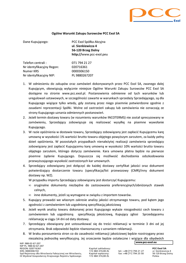 Ogólne Warunki Zakupu Surowców PCC Exol SA