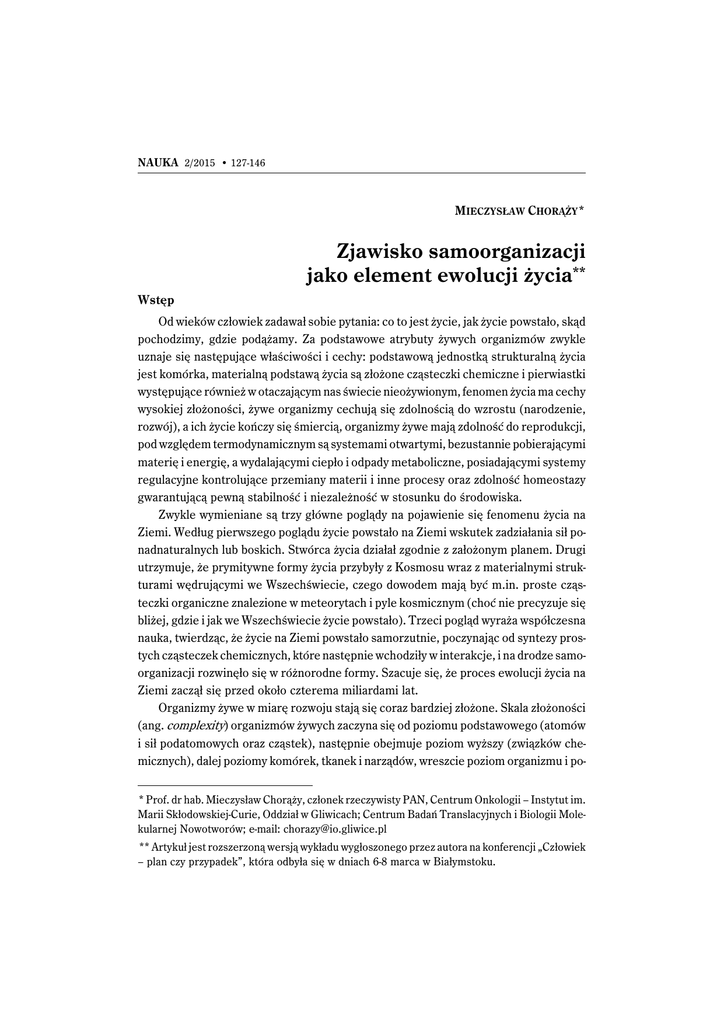 NAUKA 2/2015 • 127-146 MIECZYSŁAW CHORĄŻY * Zjawisko samoorganizacji jako element ewolucji życia** Wstęp Od wieków człowiek zadawał sobie pytania: co to jest życie, jak życie powstało, skąd pochodzimy, gdzie podążamy. Za podstawowe atrybuty żywych organizmów zwykle uznaje się następujące właściwości i cechy: podstawową jednostką strukturalną życia jest komórka, materialną podstawą życia są złożone cząsteczki chemiczne i pierwiastki występujące również w otaczającym nas świecie nieożywionym, fenomen życia ma cechy wysokiej złożoności, żywe organizmy cechują się zdolnością do wzrostu (narodzenie, rozwój), a ich życie kończy się śmiercią, organizmy żywe mają zdolność do reprodukcji, pod względem termodynamicznym są systemami otwartymi, bezustannie pobierającymi materię i energię, a wydalającymi ciepło i odpady metaboliczne, posiadającymi systemy regulacyjne kontrolujące przemiany materii i inne procesy oraz zdolność homeostazy gwarantującą pewną stabilność i niezależność w stosunku do środowiska. Zwykle wymieniane są trzy główne poglądy na pojawienie się fenomenu życia na Ziemi. Według pierwszego poglądu życie powstało na Ziemi wskutek zadziałania sił ponadnaturalnych lub boskich. Stwórca życia działał zgodnie z założonym planem. Drugi utrzymuje, że prymitywne formy życia przybyły z Kosmosu wraz z materialnymi strukturami wędrującymi we Wszechświecie, czego dowodem mają być m.in. proste cząsteczki organiczne znalezione w meteorytach i pyle kosmicznym (choć nie precyzuje się bliżej, gdzie i jak we Wszechświecie życie powstało). Trzeci pogląd wyraża współczesna nauka, twierdząc, że życie na Ziemi powstało samorzutnie, poczynając od syntezy prostych cząsteczek chemicznych, które następnie wchodziły w interakcje, i na drodze samoorganizacji rozwinęło się w różnorodne formy. Szacuje się, że proces ewolucji życia na Ziemi zaczął się przed około czterema miliardami lat. Organizmy żywe w miarę rozwoju stają się coraz bardziej złożone. Skala złożoności (ang. complexity) organizmów żywych zaczyna się od poziomu podstawowego (atomów i sił podatomowych oraz cząstek), następnie obejmuje poziom wyższy (związków chemicznych), dalej poziomy komórek, tkanek i narządów, wreszcie poziom organizmu i po* Prof. dr hab. Mieczysław Chorąży, członek rzeczywisty PAN, Centrum Onkologii – Instytut im. Marii Skłodowskiej-Curie, Oddział w Gliwicach; Centrum Badań Translacyjnych i Biologii Molekularnej Nowotworów; e-mail: [email protected] ** Artykuł jest rozszerzoną wersją wykładu wygłoszonego przez autora na konferencji „Człowiek – plan czy przypadek”, która odbyła się w dniach 6-8 marca w Białymstoku. 128 M. Chorąży ziom ekosystemów (por. Chorąży, 2011). Złożoność ma strukturę hierarchiczną. U człowieka za najwyższy poziom hierarchicznej złożoności uważany jest mózg i jego złożone funkcje umysłowe, łącznie ze świadomością oraz doświadczeniem historycznym i kulturą. W drugiej połowie ubiegłego stulecia sądzono, że wszelkie funkcje i zjawiska w organizmach żywych mogą być wyjaśnione na drodze analizy redukcjonistycznej i sprowadzone do genu. Transmisja z pokolenia na pokolenie informacji zakodowanej w genach plasowała gen na szczycie piramidy życia. Gen stawał się materialnym nośnikiem życia i – jako jednostka ulegająca selekcji – gen stawał się także głównym elementem ewolucji. Tymczasem pogłębiała się nasza wiedza o złożoności fenomenu życia i jego fundamentalnej właściwości – zjawisku samoorganizacji. Proces samoorganizacji uważany jest obecnie za jeden z podstawowych sposobów powstawania hierarchicznej złożoności komórki i ewolucji żywych organizmów oraz wyłaniania się nowych cech (emergencja). W tym eseju zostaną omówione podstawowe właściwości zjawiska samoorganizacji. Samoorganizacja i początki życia W erze prebiotycznej, przed powstaniem pierwszych form życia i przed początkiem ewolucji biologicznej, panował na Ziemi długi okres, w czasie którego z atomów powstawały proste związki chemiczne. Procesy te przebiegały w środowisku wodnym, w płytkich wodach przybrzeżnych i lagunach, gdzie dzięki energii promieniowania słonecznego powstawała swoista „pierwotna zupa”, oraz w głębi oceanów w otoczeniu kanałów wentylacyjnych, gdzie pod wpływem wysokiej temperatury i ciśnienia mogły zachodzić reakcje redukcyjno-oksydacyjne. Powierzchnie nieorganicznej zestalonej materii (skały, glina), mającej strukturę krystaliczną, mogły służyć jako katalizatory reakcji chemicznych, prowadząc do syntezy prostych polimerów. Cząsteczki chemiczne przekształcały się na drodze reakcji chemicznych w coraz bardziej złożone, a te gromadziły się i przyjmowały różną strukturę wewnętrzną, a gdy ich stężenie osiągało odpowiedni poziom, wchodziły w środowisku wodnym w interakcje między sobą (a także z wodą), tworząc zaczątki interaktywnych sieci, przyjmując postać „kropli” (koacerwaty), które następnie odgrodziły się od środowiska samorzutnie powstałą błoną. Z chaotycznego zbioru cząsteczek będących w stałym ruchu i wzajemnie oddziałujących, stopniowo, w sposób samorzutny wyłaniały się uporządkowane systemy (układy). J.M. Lehn uważa, że powstanie błony komórkowej, a następnie przedziałów błonowych w samej komórce (kompartmentalizacja) „musiały odegrać główną rolę w samoorganizacji złożonej materii i tym samym w ewolucji żywych komórek i organizmów” (Lehn, 2002). Samorzutnie powstające struktury błoniaste formowały się w pęcherzyki, które zamykały w swoim wnętrzu wodę wraz z reagującymi między sobą prebiotycznymi Zjawisko samoorganizacji jako element ewolucji życia 129 cząsteczkami chemicznymi mogły w ten sposób tworzyć prymitywne „jednostki życia”, 