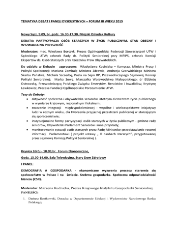 TEMATYKA DEBAT I PANELI DYSKUSYJNYCH – FORUM III WIEKU 2015 Nowy Sącz, 9.09, br. godz. 16.00-17.30, Miejski Ośrodek Kultury DEBATA: PARTYCYPACJA OSÓB STARSZYCH W ŻYCIU PUBLICZNYM. STAN OBECNY I WYZWANIA NA PRZYSZŁOŚĆ Moderator: mec. Wiesława Borczyk, Prezes Ogólnopolskiej Federacji Stowarzyszeń UTW i Sądeckiego UTW; członek Rady ds. Polityki Senioralnej przy MPiPS, członek Komisji Ekspertów ds. Osób Starszych przy Rzeczniku Praw Obywatelskich. Do udziału w Debacie zaproszono: Władysława Kosiniaka – Kamysza, Ministra Pracy i Polityki Społecznej; Mariana Zembalę Ministra Zdrowia, Andrzeja Czerwińskiego Ministra Skarbu Państwa; Michała Szczerbę, Posła na Sejm RP, Przewodniczącego Sejmowej Komisji Polityki Senioralnej; Marka Sowę, Marszałka Województwa Małopolskiego; dr Elżbietę Ostrowską, Przewodniczącą Polskiego Związku Emerytów, Rencistów i Inwalidów; Krystynę Lewkowicz, Prezesa Fundacji Ogólnopolskie Porozumienie UTW. Tezy do Debaty: aktywność społeczna i obywatelska seniorów istotnym elementem życia publicznego w wymiarze krajowym, regionalnym i lokalnym; znaczenie integracji międzypokoleniowej - wspólne i wieloaspektowe inicjatywy ludzi w rożnym wieku, dla tworzenia przyjaznej przestrzeni publicznej w starzejącym się społeczeństwie; instytucjonalne formy partycypacji osób starszych w życiu publicznym - gminne rady seniorów, Obywatelski Parlament Seniorów i inne przykłady; monitorowanie sytuacji osób starszych przez Radę Ministrów; przedstawianie rocznej informacji Parlamentowi ( projekt ustawy „ O osobach starszych”, przygotowanej przez sejmową Komisję Polityki Senioralnej ). Krynica Zdrój - 10.09,br. Forum Ekonomiczne, Godz. 13.00-14.00, Sala Telewizyjna, Stary Dom Zdrojowy I PANEL: DEMOGRAFIA A GOSPODARKA - ekonomiczne wyzwania procesu starzenia się społeczeństw w Polsce i na świecie. Srebrna gospodarka. Społeczna odpowiedzialność biznesu (CSR). Moderator: Marzena Rudnicka, Prezes Krajowego Instytutu Gospodarki Senioralnej. PANELIŚCI: 1. Dariusz Rostkowski, Doradca w Departamencie Edukacji i Wydawnictw Narodowego Banku Polskiego; 2. dr Elżbieta Ostrowska, Przewodnicząca Polskiego Związku Emerytów, Rencistów i Inwalidów; 3. Grzegorz Lot, Wiceprezes Zarządu ds. Sprzedaży na Rynku Masowym, TAURON sp. z o.o.; 4. Jan Golonka, Prezes Sądeckiej Grupy Producentów Owoców i Warzyw „Owoc Łącki” Sp. z o.o., Wiceprzewodniczący Rady Programowo-Naukowej Stowarzyszenia Sądecki Uniwersytet Trzeciego Wieku; 5. Panelista zagraniczny. Tezy do panelu: ekonomiczne uwarunkowania zmian w strukturze ludnościowej w XXI wieku; jakie działania należy podjąć, aby „srebrna gospodarka” - nowoczesny rynek usług i produktów przyjaznych osobom dojrzałym - mogła się rozwijać; rola edukacji ekonomicznej seniorów w starzejącej się populacji Polski; biznes odpowiedzialny społecznie - możliwości efektywnej aktywności zawodowej osób 60 +; korzyści dla firm. II PANEL: MIASTA/GMINY PRZYJAZNE STARZENIU SIĘ SPOŁECZENSTWA - samorząd terytorialny a zmiany demograficzne. Godz. 14.10-15.10, Sala Telewizyjna, Stary Dom Zdrojowy Moderator: Barbara Imiołczyk, Przewodnicząca Komisji Ekspertów ds. Osób Starszych przy Rzeczniku Praw Obywatelskich, Dyrektor Zespołu ds. Równego Traktowania i Ochrony Praw Osób z Niepełnosprawnościami BRPO PANELIŚCI: 1. Elżbieta Achinger, poseł na Sejm RP, członek Sejmowej Komisji Polityki Senioralnej, Prezes Stowarzyszenia Wielicki Uniwersytet Trzeciego Wieku; 2. Małgorzata Stanowska Dyrektor UTW w Lublinie, członek Zarządu AIUTA Association Internationale des Universités du Troisième Âge (Międzynarodowe Stowarzyszenie Uniwersytetów Trzeciego Wieku); 3. Krzysztof Głomb, Prezes Zarządu Stowarzyszenia Miasta w Internecie; 4. Ludwik Węgrzyn Prezes Zarządu Związku Powiatów Polskich, Starosta Bocheński, 5. dr hab. inż. Jerzy Jedliński, Prezes Towarzystwa Polsko – Niemieckiego w Krakowie, 6. Panelista zagraniczny. Tezy do panelu: lokalna polityka senioralna - czy samorząd terytorialny jest przygotowany na postępujące zmiany demograficzne? publiczne przestrzenie i budynki przyjazne starzeniu - jak to robić w praktyce? usługi publiczne dla seniorów - czy to zadanie tylko dla samorządów ? jak wykorzystać potencjał seniorów w życiu społeczności lokalnych ? Nowy Sącz - 11.09.br.,godz.10.45 -11.30 Miasteczko Galicyjskie, Ratusz SESJA PLENARNA FORUM III WIEKU I PANEL „BEZPIECZNY SENIOR – KONSUMENT” MODERATOR: red. Wojciech Molendowicz PANELIŚCI: 1. Adam Jasser, Prezes Urzędu Ochrony Konkurencji i Konsumentów; 2. Barbara Imiołczyk, Przewodnicząca komisji ekspertów ds. osób starszych przy Rzeczniku Praw Obywatelskich, Dyrektor Zespołu ds. Równego Traktowania i Ochrony Praw Osób z Niepełnosprawnościami BRPO; 3. Mariusz Dąbek, Małopolski Komendant Wojewódzki Policji; 4. Aneta Widak- Urząd Marszałkowski Rozwoju Regionalnego, Kierownik Zespołu. Województwa Małopolskiego Departament 5. Andrzej Skrzyński, redaktor „Głosu Seniora”, Stowarzyszenie MANKO; członek Rady ds. Polityki Senioralnej przy Ministrze Pracy i Polityki Społecznej. Tezy do panelu: czy konsumenci - seniorzy na rynku usług finansowych, usług zdrowotnych i społecznych są dostatecznie chronieni; oferta usług z punktu widzenia seniorów i rodzin; świadomość prawna i obywatelska seniorów w dochodzeniu praw konsumenta; jak zlikwidować bariery dla seniorów w przestrzeni publicznej (otoczenie, dostępność, drogi, chodniki, przejścia dla pieszych, komunikacja, transport) i budynkach użyteczności publicznej. SESJA PLENARNA FORUM III WIEKU V FORUM MAŁOPOLSKICH UNIWERSYTETÓW TRZECIEGO WIEKU GODZ. 13.00-13.45 II. PANEL „REGIONALNE FORUM UTW” - małopolskie doświadczenia w zakresie inicjatyw proseniorskich; MODERATOR: red. Wojciech Molendowicz, GOŚĆ SPECJALNY: Józefa Szczurek – Żelazko, Radna Województwa Małopolskiego, Przewodnicząca Komis