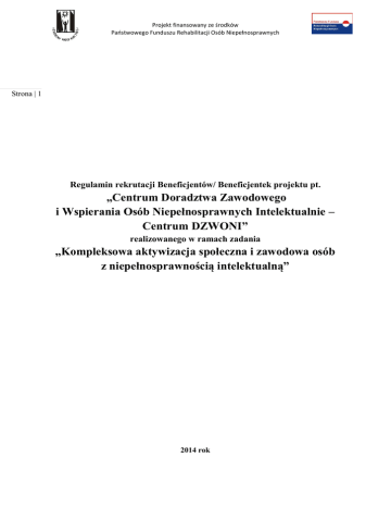 Projekt finansowany ze środków Państwowego Funduszu Rehabilitacji Osób Niepełnosprawnych Strona | 1 Regulamin rekrutacji Beneficjentów/ Beneficjentek projektu pt. „Centrum Doradztwa Zawodowego i Wspierania Osób Niepełnosprawnych Intelektualnie – Centrum DZWONI” realizowanego w ramach zadania „Kompleksowa aktywizacja społeczna i zawodowa osób z niepełnosprawnością intelektualną” 2014 rok Projekt finansowany ze środków Państwowego Funduszu Rehabilitacji Osób Niepełnosprawnych §1 Informacje o projekcie 1. Projekt „Centrum Doradztwa Zawodowego i Wspierania Osób Niepełnosprawnych Intelektualnie – Centrum DZWONI” realizowany jest przez Polskie Stowarzyszenie na Rzecz Osób z Upośledzeniem Umysłowym (zwanym dalej PSOUU) w ramach zadania Strona | 2 „Kompleksowa aktywizacja społeczna i zawodowa osób z niepełnosprawnością intelektualną” (tryb powierzania realizacji zadań, w rozumieniu art. 11 ust. 1 pkt 2 ustawy z dnia 24 kwietnia 2003 r. o działalności pożytku publicznego o wolontariacie /Dz. U. z 2010 r. Nr 234, poz. 1536 z późn. zm./). 2. Adresy biur, w których można uzyskać informacje n/t rekrutacji i realizacji projektu: a) Polskie Stowarzyszenie na Rzecz Osób z Upośledzeniem Umysłowym – Biuro Projektu ul. Głogowa 2 b, 02 – 639 Warszawa tel. /22/ 848 03 14; e-mail: [email protected] b) Centrum Doradztwa Zawodowego i Wspierania Osób Niepełnosprawnych Intelektualnie – Centrum DZWONI w Warszawie ul. Kacza 21, 01-064 Warszawa tel. /22/ 620 30 31, e-mail: [email protected] c) Centrum Doradztwa Zawodowego i Wspierania Osób Niepełnosprawnych Intelektualnie – Centrum DZWONI w Bytomiu ul. Pl. Kościuszki 9/33 tel.726 136 335, e-mail: [email protected] d) Centrum Doradztwa Zawodowego i Wspierania Osób Niepełnosprawnych Intelektualnie – Centrum DZWONI w Zgierzu ul. Al. Struga 13-21 lok. 208 tel. 726 136 348, e-mail: [email protected] e) Centrum Doradztwa Zawodowego i Wspierania Osób Niepełnosprawnych Intelektualnie – Centrum DZWONI w Gdańsku ul. Jagiellońska 11 tel. 726 136 347, e-mail: [email protected] f) Centrum Doradztwa Zawodowego i Wspierania Osób Niepełnosprawnych Intelektualnie – Centrum DZWONI w Jarosławiu ul. Wilsona 6a tel. 726 136 364, e-mail: [email protected] 3. Informacja o projekcie dostępna będzie również: a) na stronie internetowej PSOUU (www.psouu.org.pl), na stronie internetowej projektu (www.centrumdzwoni.pl) oraz na stronach internetowych Kół Terenowych, na terenie działalności statutowej których zlokalizowane są Centra DZWONI (opcjonalnie); b) w instytucjach, urzędach świadczących usługi dla osób niepełnosprawnych i na ich rzecz; c) w szkołach przysposobienia do pracy, środowiskowych domach samopomocy, domach pomocy społecznej, ośrodkach dziennego pobytu itp. Projekt finansowany ze środków Państwowego Funduszu Rehabilitacji Osób Niepełnosprawnych Strona | 3 4. Projekt ma charakter ponadregionalny, realizowany jest na terenie 5 województw. 5. Projekt jest realizowany w terminie od 01.01.2013 r. do 31.03.2016 r., w trzech okresach: a. I okres finansowania projektu – 01.01.2013 – 31.03.2014 b. II okres finansowania – 01.04.2014 – 31.03.2015 c. III okres finansowania – 01.04.2015 – 31.03.2016 6. Projekt finansowany jest ze środków Państwowego Funduszu Rehabilitacji Osób Niepełnosprawnych (zwanym dalej PFRON). 1. 2. 3. 4. 5. 6. 7. 8. §2 Postanowienia ogólne Niniejszy regulamin określa zasady rekrutacji oraz zasady uczestnictwa w projekcie pt. „Centrum Doradztwa Zawodowego i Wspierania Osób Niepełnosprawnych Intelektualnie – Centrum DZWONI” (zwanym dalej Projektem) w II okresie finansowania tj. 0104.2014-31.03.2015. Projekt realizowany jest na podstawie umowy o dofinansowanie nr ZZB/0002180/BF/D z dnia 04.06.2013r. zawartej pomiędzy Polskim Stowarzyszeniem na Rzecz Osób z Upośledzeniem Umysłowym i Państwowym Funduszem Rehabilitacji Osób Niepełnosprawnych. Celem ogólnym projektu jest zwiększenie udziału w życiu społecznym i zawodowym oraz wsparcie w utrzymaniu zatrudnienia osób z niepełnosprawnością intelektualną. Proces rekrutacji do projektu będzie otwarty i nie będzie ograniczał możliwości przystąpienia do niego żadnej osobie bez względu na płeć, narodowość, wyznanie, orientację seksualną, miejsce zamieszkania. Grupą docelową objętą wsparciem zaplanowanym w ramach projektu są osoby z niepełnosprawnością intelektualną, pozostające w zatrudnieniu (II etap) i nieaktywne zawodowo (I etap), w tym osoby kontynuujące udział w projekcie w II okresie rehabilitacji oraz osoby, które przystąpią do projektu w II okresie finansowania projektu, począwszy od 01.04.2014. Regulamin rekrutacji uwzględnia i zobowiązuje PSOUU i osoby odpowiedzialne za realizację projektu, do przestrzegania kwestii ochrony danych osobowych. Bieżący monitoring nad procesem rekrutacji Beneficjentów/Beneficjentek (BO) Projektu prowadzi Koordynator merytoryczny projektu. Przystąpienie kandydata/kandydatki do procesu rekrutacji jest równoznaczne z zaakceptowaniem niniejszego regulaminu. §3 Zasady rekrutacji 1. Beneficjentem/Beneficjentką Projektu jest osoba pełnoletnia (ukończone 18 lat), mająca trudności w sferze społeczno-zawodowej, w tym w komunikacji, uczeniu się, która posiada orzeczenie o umiarkowanym bądź znacznym stopniu niepełnosprawności wydane przez: a) Powiatowy lub Wojewódzki Zespół ds. Orzekania o Stopniu Niepełnosprawności. b) Komisję lekarską ZUS o niezdolności do pracy. Projekt finansowany ze środków Państwowego Funduszu Rehabilitacji Osób Niepełnosprawnych Strona | 4 c) Obwodową/ Wojewódzką Komisję Lekarską ds. Inwalidztwa i Zatrudnienia (dalej KIZ) /w przypadku orzeczenia KIZ będzie to I i II grupa inwalidzka, która jest odpowiednikiem znacznego i umiarkowanego stopnia niepełnosprawności/. 2. Osoby nie posiadające w orzeczeniu stosownego zapisu (symbolu) potwierdzającego upoś