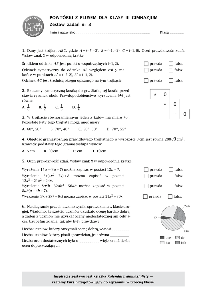 POWTÓRKI Z PLUSEM DLA KLASY III GIMNAZJUM Zestaw zadań nr 8 Imię i nazwisko .......................................................................... Klasa .............. 1. Dany jest trójkąt ABC, gdzie A = (−7, −2), B = (−1, −2), C = (−1, 6). Oceń prawdziwość zdań. Wstaw znak X w odpowiednią kratkę. Środkiem odcinka AB jest punkt o współrzędnych (−1, 2). prawda fałsz Odcinek symetryczny do odcinka AB względem osi y ma końce w punktach A = (−7, 2), B = (−1, 2). prawda fałsz Odcinek AC jest średnicą okręgu opisanego na tym trójkącie. prawda fałsz 2. Rzucamy symetryczną kostką do gry. Siatkę tej kostki przedstawia rysunek obok. Prawdopodobieństwo wyrzucenia ( ) jest równe: 1 1 1 1 A. 6 B. 2 C. 3 D. 4 3. W trójkącie równoramiennym jeden z kątów ma miarę 70◦. Pozostałe kąty tego trójkąta mogą mieć miary: A. 60◦, 50◦ B. 70◦, 40◦ C. 50◦, 50◦ D. 70◦, 55◦ √ 4. Objętość graniastosłupa prawidłowego trójkątnego o wysokości 8 cm jest równa 200 3 cm3 . Krawędź podstawy tego graniastosłupa wynosi: A. 5 cm B. 20 cm C. 15 cm D. 10 cm 5. Oceń prawdziwość zdań. Wstaw znak X w odpowiednią kratkę. Wyrażenie 15a − (3a + 7) można zapisać w postaci 12a − 7. prawda fałsz Wyrażenie 3x(4x2 − 7x) + 8 można zapisać w postaci 12x3 − 21x2 + 24x. Wyrażenie 8a2 b + 32ab2 + 56ab można zapisać w postaci 8ab(a + 4b + 7). prawda fałsz prawda fałsz Wyrażenie (3x + 5)(7 + 6x) można zapisać w postaci 21x2 + 30x. prawda fałsz 6. Na diagramie przedstawiono wyniki sprawdzianu w klasie drugiej. Wiadomo, że sześciu uczniów uzyskało ocenę bardzo dobrą, a żaden z uczniów nie uzyskał oceny niedostatecznej ani celującej. Uzupełnij zdania, tak aby były prawdziwe: Liczba uczniów, którzy otrzymali ocenę dobrą, wynosi Liczba uczniów, którzy pisali sprawdzian, jest równa Liczba ocen dostatecznych była o ocen dopuszczających. ................... ................. . ................... . większa niż liczba Inspiracją zestawu jest książka Kalendarz gimnazjalisty — rzetelny kurs przygotowujący do egzaminu w trzeciej klasie. 7. Zapisz liczby w kolejności malejącej. a = 3 · 22 b= √ 36 + 64 c= 3 12 2 d= 0 1 9 e = 55 · 15−4 .................................................................................................................................................................. 8. Które z narysowanych brył zmieściłyby się w sześciennym pudełku o krawędzi 10 cm? .................................................................................................................................................................. .................................................................................................................................................................. Odpowiedź: ............................................................................................................................................. 9. W tartaku można kupić dębowe deski w kształcie prostopadłościanów o wymiarach 3 cm × 12 cm × 2 m. a) 1 cm3 drewna dębowego waży 0,8 g. Ile waży jedna taka deska? .................................................................................................................................................................. Odpowiedź: ............................................................................................................................................. b) 1 m3 desek dębowych kosztuje w tym tartaku 1600 zł. Ile zapłacimy za 10 takich desek? .................................................................................................................................................................. Odpowiedź: ............................................................................................................................................. 10. Do pojemnika w kształcie walca o średnicy podstawy 50 cm, częściowo wypełnionego wodą wlano 30 kropli olejku sosnowego. Olejek rozlał się równomiernie na powierzchni wody. Zakładając, że każda kropla olejku sosnowego ma kształt kuli o średnicy równej 0,5 cm, oblicz grubość utworzonej warstwy olejku. Wynik podaj w milimetrach. .................................................................................................................................................................. .................................................................................................................................................................. 11. Udowodnij, że dwusieczne sąsiednich boków równoległoboku przecinają się pod kątem prostym. ....................................................................................................... ....................................................................................................... Inspiracją zestawu jest książka Kalendarz gimnazjalisty — rzetelny kurs przygotowujący do egzaminu w trzeciej klasie.