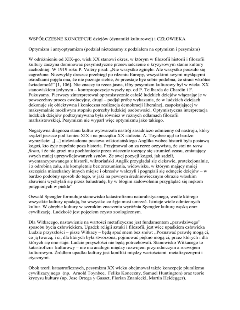 WSPÓŁCZESNE KONCEPCJE dziejów (dynamiki kulturowej) i CZŁOWIEKA Optymizm i antyoptyamizm (podział nietożsamy z podziałem na optymizm i pesymizm) W odróżnieniu od XIX-go, wiek XX stanowi okres, w którym w filozofii historii i filozofii kultury zaczyna dominować pesymistyczne przeświadczenie o kryzysowym stanie kultury zachodniej. W 1919 roku P. Valéry pisał: „Nie wszystko zginęło. Ale wszystko poczuło się zagrożone. Niezwykły dreszcz przebiegł po rdzeniu Europy, wszystkimi swymi myślącymi ośrodkami pojęła ona, że nie poznaje siebie, że przestaje być sobie podobna, że straci wkrótce świadomość” [1, 106]. Nie znaczy to rzecz jasna, iżby pesymizm kulturowy był w wieku XX stanowiskiem jedynym – kontrpropozycje wyszły np. od P. Teilharda de Chardin i F. Fukuyamy. Pierwszy zinterpretował optymistycznie całość ludzkich dziejów włączając je w powszechny proces ewolucyjny, drugi – podjął próbę wykazania, że w ludzkich dziejach dokonuje się obiektywna i konieczna realizacja demokracji liberalnej, zaspokajającej w maksymalnie możliwym stopniu potrzeby ludzkiej osobowości. Optymistyczna interpretacja ludzkich dziejów podtrzymywana była również w różnych odłamach filozofii marksistowskiej. Pesymizm nie wyparł więc optymizmu jako takiego. Negatywna diagnoza stanu kultur wytwarzała nastrój zasadniczo odmienny od nastroju, który rządził jeszcze pod koniec XIX i na początku XX stulecia. A. Toynbee ujął to bardzo wyraziście: „[...] nieświadoma postawa wiktoriańskiego Anglika wobec historii była postawą kogoś, kto żyje zupełnie poza historią. Przyjmował on za rzecz oczywistą, że stoi na terra firma, i że nie grozi mu pochłonięcie przez wiecznie toczący się strumień czasu, zmiatający swych mniej uprzywilejowanych synów. Ze swej pozycji kogoś, jak sądził, wyemancypowanego z historii, wiktoriański Anglik przyglądał się ciekawie, protekcjonalnie, i z odrobiną żalu, ale kompletnie bez zrozumienia, widowisku, w którym mający mniej szczęścia mieszkańcy innych miejsc i okresów walczyli i pogrążali się odmęcie dziejów – w bardzo podobny sposób do tego, w jaki na pewnym średniowiecznym obrazie włoskim zbawieni wychylali się przez balustradę, by w błogim zadowoleniu przyglądać się mękom potępionych w piekle” Oswald Spengler formułuje stanowisko katastrofizmu naturalistycznego, wedle którego wszystkie kultury upadają, bo wszystko co żyje musi umrzeć. Istnieje wiele odmiennych kultur. W obrębie kultury w szerokim znaczeniu wyróżnia Spengler kulturę wąską oraz cywilizację. Ludzkość jest pojęciem czysto zoologicznym. Dla Witkacego, nastawienie na wartości metafizyczne jest fundamentem „prawdziwego” sposobu bycia człowiekiem. Upadek religii sztuki i filozofii, jest wiec upadkiem człowieka Ludzie przyszłości – pisze Witkacy – będą spać snem bez snów: „Poznawać prawdę mogą ci, co ją tworzą, i ci, dla których była stworzona; pojmować piękno mogą ci, przez których i dla których się ono staje. Ludzie przyszłości nie będą potrzebowali. Stanowisko Witkacego to katastrofizm kulturowy – nie ma analogii między rozwojem przyrodniczym a rozwojem kulturowym. Żródłem upadku kultury jest konflikt między wartościami metafizycznymi i etycznymi. Obok teorii katastroficznych, pesymizm XX wieku obejmował także koncepcje pluralizmu cywilizacyjnego (np. Arnold Toynbee, Feliks Koneczny, Samuel Huntington) oraz teorie kryzysu kultury (np. Jose Ortega y Gasset, Florian Znaniecki, Martin Heidegger). Feliks Koneczny: Co to bowiem jest cywilizacja? Nie jest to twór wyróżniony przez granice geograficzne, ani też przez usytuowanie w jednolitych ramach czasowych. Dla Konecznego cywilizacja to twór wyodrębniony ze względu na jednolitą strukturę aksjologiczną. Znana definicja cywilizacji, którą posługuje się Koneczny, brzmi następująco: „Cywilizacja jest to metoda ustroju życia zbiorowego. Tak jest! Cywilizacja jest po prostu metodą. Definicja ta jest dostatecznie obszerna; mieści się niej sztuka i nauka, etyka i prawodawstwo, ekonomia, szkolnictwo, komunikacja itd., bo to wszystko należy do życia zbiorowego. Wszelki zaś objaw cywilizacji w jakiejkolwiek dziedzinie należy do życia zbiorowego zarazem. Nie tworzy cywilizacji człowiek samotny, lecz towarzyski człowiek wśród ludzi”. Cywilizacja jest zbudowana na układzie wartości (człowieczy QUINCUNX). Takich kluczowych wartości jest pięć: prawda, dobro, piękno, dobrobyt oraz zdrowie. Stąd nie jest możliwa synteza cywilizacji, sposobem ich współistnienia jest rywalizacja i konflikt. Inne kryteria oceny cywilizacji: rola religii (cyw. sakralne, niesakralne, półsakralne)l stosonke między zbiorowością a indywiduum (cyw. personalistycne i gromadnościowe). Cywilizację łacińską charakteryzują u Konecznego następujące własności (poniżej podajemy ich wybór). 1. Jest to cywilizacja niesakralna i personalistyczna. 2. Troska o zdrowie jest w niej sprawą publiczną (sic!), inaczej niż w innych cywilizacjach, gdzie jest to troską samej tylko jednostki. Publiczny charakter troski o zdrowie wyraża się w rozwiniętej w cywilizacji łacińskiej naukowej medycynie. 3. Dobrobyt jest w świecie łacińskim rozumiany jako owoc pracy i działalności produkcyjnej, obejmującej zarówno wytwórczość materialną, jak i duchową. Pod tym względem całkowicie odmiennie wyglądają cywilizacja turańska oraz cywilizacja bizantyńska. Te ostatnie odwołują się bowiem do wojny i łupiestwa jako dróg nabywania bogactwa. Cywilizacja łacińska jest powiązana z pokojem, podczas gdy turańska i bizantyńska nastawione są na wojnę. 4. W cywilizacji łacińskiej preferuje się pracę umysłową, rozwija się oświatę, nauki humanistyczne i przyrodnicze. Powiązana jest z tym negatywna ocena cenzury: „Cenzura jest wobec cywilizacji łacińskiej ohydą. Znamienny jest to fakt