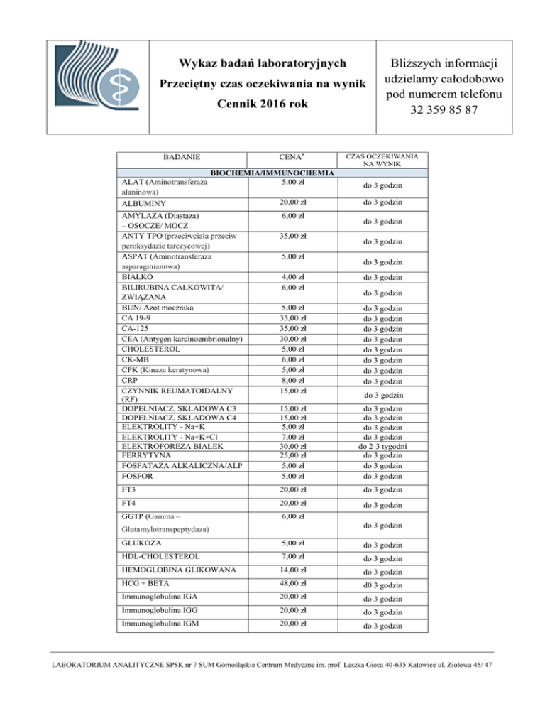 Wykaz badań laboratoryjnych Przeciętny czas oczekiwania na wynik Cennik 2016 rok CENA* BADANIE ALAT (Aminotransferaza alaninowa) BIOCHEMIA/IMMUNOCHEMIA 5.00 zł ALBUMINY 20,00 zł AMYLAZA (Diastaza) – OSOCZE/ MOCZ ANTY TPO (przeciwciała przeciw peroksydazie tarczycowej) ASPAT (Aminotransferaza asparaginianowa) BIAŁKO BILIRUBINA CAŁKOWITA/ ZWIĄZANA BUN/ Azot mocznika CA 19-9 CA-125 CEA (Antygen karcinoembrionalny) CHOLESTEROL CK-MB CPK (Kinaza keratynowa) CRP CZYNNIK REUMATOIDALNY (RF) DOPEŁNIACZ, SKŁADOWA C3 DOPEŁNIACZ, SKŁADOWA C4 ELEKTROLITY - Na+K ELEKTROLITY - Na+K+Cl ELEKTROFOREZA BIAŁEK FERRYTYNA FOSFATAZA ALKALICZNA/ALP FOSFOR 6,00 zł 35,00 zł 5,00 zł Bliższych informacji udzielamy całodobowo pod numerem telefonu 32 359 85 87 CZAS OCZEKIWANIA NA WYNIK do 3 godzin do 3 godzin do 3 godzin do 3 godzin do 3 godzin 4,00 zł 6,00 zł do 3 godzin 5,00 zł 35,00 zł 35,00 zł 30,00 zł 5,00 zł 6,00 zł 5,00 zł 8,00 zł 15,00 zł do 3 godzin do 3 godzin do 3 godzin do 3 godzin do 3 godzin do 3 godzin do 3 godzin do 3 godzin 15,00 zł 15,00 zł 5,00 zł 7,00 zł 30,00 zł 25,00 zł 5,00 zł 5,00 zł do 3 godzin do 3 godzin do 3 godzin do 3 godzin do 2-3 tygodni do 3 godzin do 3 godzin do 3 godzin FT3 20,00 zł do 3 godzin FT4 20,00 zł do 3 godzin GGTP (Gamma – 6,00 zł do 3 godzin do 3 godzin do 3 godzin Glutamylotranspeptydaza) GLUKOZA 5,00 zł do 3 godzin HDL-CHOLESTEROL 7,00 zł do 3 godzin HEMOGLOBINA GLIKOWANA 14,00 zł do 3 godzin HCG + BETA 48,00 zł d0 3 godzin Immunoglobulina IGA 20,00 zł do 3 godzin Immunoglobulina IGG 20,00 zł do 3 godzin Immunoglobulina IGM 20,00 zł do 3 godzin LABORATORIUM ANALITYCZNE SPSK nr 7 SUM Górnośląskie Centrum Medyczne im. prof. Leszka Gieca 40-635 Katowice ul. Ziołowa 45/ 47 Wykaz badań laboratoryjnych Przeciętny czas oczekiwania na wynik Cennik 2016 rok BADANIE CENA* Bliższych informacji udzielamy całodobowo pod numerem telefonu 32 359 85 87 CZAS OCZEKIWANIA NA WYNIK KORTYZOL 40,00 zł do 3 godzin KREATYNINA + szacowany GFR 5,00 zł do 3 godzin KWAS FOLIOWY 35,00 zł do 3 godzin KWAS MOCZOWY 5,00 zł do 3 godzin LDH (Dehydrogenaza mleczanowa) 7,00 zł do 3 godzin LIPAZA 6,00 zł do 3 godzin LIPIDY (cholesterol+HDL 15,00 zł do 3 godzin +triglicerydy+LDL) MAGNEZ 5,00 zł do 3 godzin MLECZANY 10,00 zł do 1 godziny MOCZNIK 5,00 zł do 3 godzin NT-PRO BNP 160,00 zł do 3 godzin PROKALCYTONINA 150,00 zł do 3 godzin PTH (Parathormon) 32,00 zł do 1 godziny Test obciążenia glukozą 25,00 zł do 3 godzin (6 punktów) Test obciążenia glukozą 10,00 zł do 3 godzin wg WHO (2 punkty) Test obciążenia glukozą, 8,00 zł do 3 godzin przesiewowy, dla ciężarnych TPSA (antygen specyficzny 30,00 zł do 3 godzin dla prostaty) TRANSFERYNA 15,00 zł do 3 godzin TRIGLICERYDY 5,00 zl do 3 godzin TROPONINA T hs 27,00 zł do 3 godzin TSH (hormon tyreotropowy) 20,00 zł do 3 godzin WAPŃ CAŁK. 5,00 zł do 3 godzin WITAMINA B12 35,00 zł do 3 godzin WITAMINA D 60,00 zł do 3 godzin ŻELAZO 6,00 zł do 3 godzin 5- FLUOROURACYL 250,00 zł do 2-3 tygodni VANKOMYCYNA 58,00 zł do 3 godzin ALFAFETOPROTEINA 38,00zł do 3 godzn LABORATORIUM ANALITYCZNE SPSK nr 7 SUM Górnośląskie Centrum Medyczne im. prof. Leszka Gieca 40-635 Katowice ul. Ziołowa 45/ 47 Wykaz badań laboratoryjnych Przeciętny czas oczekiwania na wynik Cennik 2016 rok Bliższych informacji udzielamy całodobowo pod numerem telefonu 32 359 85 87 HEMATOLOGIA CENA* BADANIE CZAS OCZEKIWANIA NA WYNIK do 3 godzin do 3 godzin. MORFOLOGIA z rozmazem OB PŁYTKI MANUALNIE 8,00 zł 4,00 zł 15,00 zł RETIKULOCYTY 10,00 zł do 3 godzin ROZMAZ KRWI OBWODOWEJ 12,00 zł do 3 godzin ALBUMINY W MOCZU/ PŁYNACH USTROJOWYCH AMYLAZA W MOCZU ANALITYKA OGÓLNA 20,00 zł BADANIE OGÓLNE MOCZU do 3 godzin do 3 godzin 6,00 zł do 3 godzin 8,00 zł do 3 godzin BIAŁKO-PŁYNY Z JAM CIAŁA 7,00 zł do 3 godzin BADANIE OGÓLNE PŁYNÓW Z 30,00 zł do 3 godzin JAM CIAŁA BADANIE OGÓLNE PMR 30,00 zł do 3 godzin +PREPARAT CYTOSET BIAŁKO W MOCZU 7,00 zł do 3 godzin ELEKTROFOREZA BIAŁEK 30,00 zł do 2-3 tygodni W MOCZU FOSFOR W MOCZU 5,00 zł do 3 godzin KAŁ PASOŻYTY 20,00 zł 2 razy w tygodniu KREATYNINA W MOCZU 5,00 zł do 3 godzin KREW UTAJONA 10,00 zł do 3 godzin W KALE KWAS MOCZOWY W MOCZU 5,00 zł do 3 godzin MAGNEZ W MOCZU 5,00 zł do 3 godzin PRÓBA CIĄŻOWA 8,00 zł do 3 godzin WAPŃ W MOCZU 5,00 zł do 3 godzin GOSPODARKA KWASOWO-ZASADOWA GAZOMETRIA WAPŃ ZJONIZOWANY 6,00 zł 7,00 zł HEMOSTAZA do 30 minut do 30 minut ADP (ocena funkcji płytek) 80,00 zł do 2 godziny AKTYWNOŚĆ ANTY –Xa 60,00 zł do 2 godzin ANTYTROMBINA III 26,00 zł do 2 godzin APTT (czas kaolinowo-kefalinowy) 4,00 zł do 2 godzin ASPI (ocena funkcji płytek) 80,00 zł do 2 godzin D-DIMERY 35,00 zł do 2 godzin FIBRYNOGEN 10,00 zł do 2 godzin INR (czas protrombinowy) 4,00 zł do 2 godzin LABORATORIUM ANALITYCZNE SPSK nr 7 SUM Górnośląskie Centrum Medyczne im. prof. Leszka Gieca 40-635 Katowice ul. Ziołowa 45/ 47 Wykaz badań laboratoryjnych Przeciętny czas oczekiwania na wynik Cennik 2016 rok BADANIE CENA* Bliższych informacji udzielamy całodobowo pod numerem telefonu 32 359 85 87 CZAS OCZEKIWANIA NA WYNIK ELEKTROFOREZA BIAŁEK/ IMMUNOFIKSACJA/ PRĄŻKI OLIGOKLONALNE DETEKCJA PRĄŻKÓW 230,00 zł do 2 tygodni OLIGOKLONALNYCH z oceną przepuszczalności bariery krewpłyn DIAGNOSTYKA GAMMAPATII 190,00 zł do 2-3 tygodni ELEKTROFOREZA BIAŁEK 30,00 zł do 2-3 tygodni PMR ELEKTROFOREZA BIAŁEK 30,00 zł do 2-3 tygodni W SUROWICY Immunoglobulina IGG W PMR 20,00 zł do 3 godzin INDEKS ALBUMINOWY 40,00 zł do 3 godzin INDEKS IGG 40,00 zł do 3 godzin IMMUNODIAGNOSTYKA BORELIOZA IGG 55,00 zł do 2-3 tygodni BORELIOZA IGM 47,00 zł do 2-3 tygodni PRZECIWCIAŁA anty P-ANCA 42,00 zł do 2-3 tygodni PRZECIWCIAŁA anty C-ANCA 42,00 zł do 2-3 tygodni PRZECIWCIAŁA ANTY dsDNA 40,00 zł do 2-3 tygodni PRZECIWCIAŁA 56,00 zł do 2-3 tygodni ANTYCYTRULINOWE CCP GIARDIA LAMBLIA 25,00 zł do 2-3 tygodni PRZECIWCIAŁA 40,0