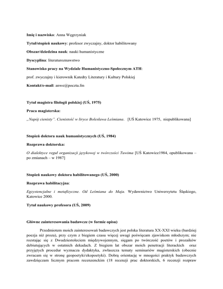 Imię i nazwisko: Anna Węgrzyniak Tytuł/stopień naukowy: profesor zwyczajny, doktor habilitowany Obszar/dziedzina nauk: nauki humanistyczne Dyscyplina: literaturoznawstwo Stanowisko pracy na Wydziale Humanistyczno-Społecznym ATH: prof. zwyczajny i kierownik Katedry Literatury i Kultury Polskiej Kontakt/e-mail: [email protected] Tytuł magistra filologii polskiej (UŚ, 1975) Praca magisterska: „Napój cienisty”. Cienistość w liryce Bolesława Leśmiana. [UŚ Katowice 1975, niepublikowana] Stopień doktora nauk humanistycznych (UŚ, 1984) Rozprawa doktorska: O dialektyce reguł organizacji językowej w twórczości Tuwima [UŚ Katowice1984, opublikowana – po zmianach – w 1987] Stopień naukowy doktora habilitowanego (UŚ, 2000) Rozprawa habilitacyjna: Egzystencjalne i metafizyczne. Od Leśmiana do Maja. Wydawnictwo Uniwersytetu Śląskiego, Katowice 2000. Tytuł naukowy profesora (UŚ, 2009) Główne zainteresowania badawcze (w formie opisu) Przedmiotem moich zainteresowań badawczych jest polska literatura XX-XXI wieku (bardziej poezja niż proza), przy czym z biegiem czasu więcej uwagi poświęcam zjawiskom młodszym; nie rozstając się z Dwudziestoleciem międzywojennym, sięgam po twórczość poetów i prozaików debiutujących w ostatnich dekadach. Z biegiem lat obszar moich penetracji literackich oraz przyjętych procedur wyznacza dydaktyka, zwłaszcza tematy seminariów magisterskich (obecnie zwracam się w stronę geopoetyki/ekopoetyki). Dobrą orientację w mnogości praktyk badawczych zawdzięczam licznym pracom recenzenckim (18 recenzji prac doktorskich, 6 recenzji rozpraw habilitacyjnych, 3 oceny na tytuł profesora, kilkadziesiąt recenzji wydawniczych) oraz konferencjom (zagranicznym i krajowym), sesjom, panelom. Przez 30 lat byłam związana z Zakładem Teorii Literatury, którym kierował prof. dr hab. Ireneusz Opacki, a ponieważ wspólnym zespołowym zadaniem było kompleksowe opracowanie Skamandra (czego efektem jest 11 tomów serii „Skamander”), właśnie ten projekt zasadniczo wpłynął na moje zainteresowanie twórcami tej grupy. W pierwszej fazie (przed habilitacją) głównie zajmowała mnie kwestia relacji pomiędzy literaturą „wysoką” i popularną. Wybrałam Tuwima, który jedną ręką pisał wiersze liryczne, a drugą – teksty kabaretowe i satyryczne. Wykorzystując pomysły Bachtina, śledziłam stopniowe przechodzenie od „jednogłosowości” we wczesnej poezji Tuwima do „wielogłosowości” w jego poezji dojrzałej, natomiast później czytałam Tuwima z perspektywy debiutów po roku 1989, a także genderowo – stawiając tezę, że w przypadku poety, który słowem egzorcyzmuje zło, szatańska „chuć” generuje „boskie” energie. Zawsze pociągała mnie „sztuka interpretacji” – uważna lektura jednego tekstu, prowadząca w rozmaite konteksty: historycznoliterackie, filozoficzne, kulturowe. Nie ufam projektom syntetycznym, składam „całości” z fragmentów – w przekonaniu, że taka optyka lekturowa (zawsze subiektywna, zależna od procedur oraz interesów, potrzeb czy inwencji interpretatora) jednak daje nieciągły, wycinkowy „obraz” współczesnej literatury polskiej. Istotnym zwornikiem są tutaj powracające wątki badawcze: poetyckie projekty metafizyki, wątek egzystencjalny, układy patronackie (jakie nazwiska wyznaczają bieguny współczesnej poezji). Nowy kierunek moich poszukiwań badawczych wyznacza zainteresowanie relacjami między kategorią autorytetu (władza legitymizowana zespołem wartości) i literaturą (indywidualna ekspresja, dyskurs metaliteracki, repertuary norm, konwencji, gatunków; systemy ideowo-estetyczne; praktyki komunikacyjne) – ze szczególnym uwzględnieniem uwikłania literatury w ponowoczesne dyskursy filozoficzne, ideologiczne, polityczne. W literaturze szukam różnorodności i przeciwieństw; niezależnie od tego, jaką przyjmuję optykę, badane obiekty układają się biegunowo, np. Miłosz – Różewicz, Szymborska – Świrszczyńska, Nowak – Białoszewski, Barańczak – Zagajewski, podobnie intrygują mnie zasadniczo odmienne koncepcje prozy, np. Tokarczuk – Tulli, Myśliwski – Karpowicz. Moją „sztukę czytania” dobrze pokazuje książka Czytam, więc jestem. Studia, interpretacje, glosy, obejmująca teksty, które w proponowanym układzie i wskazaniu sieci powiązań między badanymi zjawiskami (np. częste odniesienia do Leśmiana) są próbą syntezy współczesności, syntezy we fragmentach (jak głosi Różewicz: zawsze fragment). Hermeneutyczną „metodę” lektury wyraźnie zapowiada tytuł: „czytam, aby być”. Nie zajmują mnie programy, systemy czy konwencje, interesuje mnie kondycja ludzka i ekspresja osobowości. Literaturę traktuję jako wprowadzenie do interpretacji tekstu świata. Moje badanie poezji łączy orientację estetyczną z lekturą prywatną, co wyznacza czytającemu pozycję partnera w dialogu. Na przełomie lat 80. i 90. moja uwaga stopniowo przesuwa się ku prozie, interesują mnie zasadniczo odmienne sposoby narracji i koncepcje kreacji świata. Przez parę lat łączyłam pracę w ATH z zajęciami w katowickiej Wyższej Szkole Zarządzania Ochroną Pracy, gdzie kierowałam Katedrą Kulturoznawstwa prowadzącą kierunek kulturoznawstwo, specjalność audiowizualna. Współpraca pracowników i studentów obu pokrewnych specjalności (bielskiej polonistyki medialnej z katowicką komunikacją audiowizualną) sprzyjała wspólnym konferencjom i projektom badawczym. Opracowanie programów dla specjalności kulturoznawczej oraz tzw. zwrot kulturowy w polonistyce skłoniły mnie do podjęcia tematów kulturoznawczych, np. diagnozy współczesnej rzeczywistości w okresie transformacji ustrojowej, mit ciała, pytanie o humanizm w dzisiejszym świecie, kultura jedzenia, pozycja literatury w technopolu. Nachylenie w stronę kulturoznawstwa jest też wynikiem przeobrażeń kultury i pytań, jakie stawiają nam studen